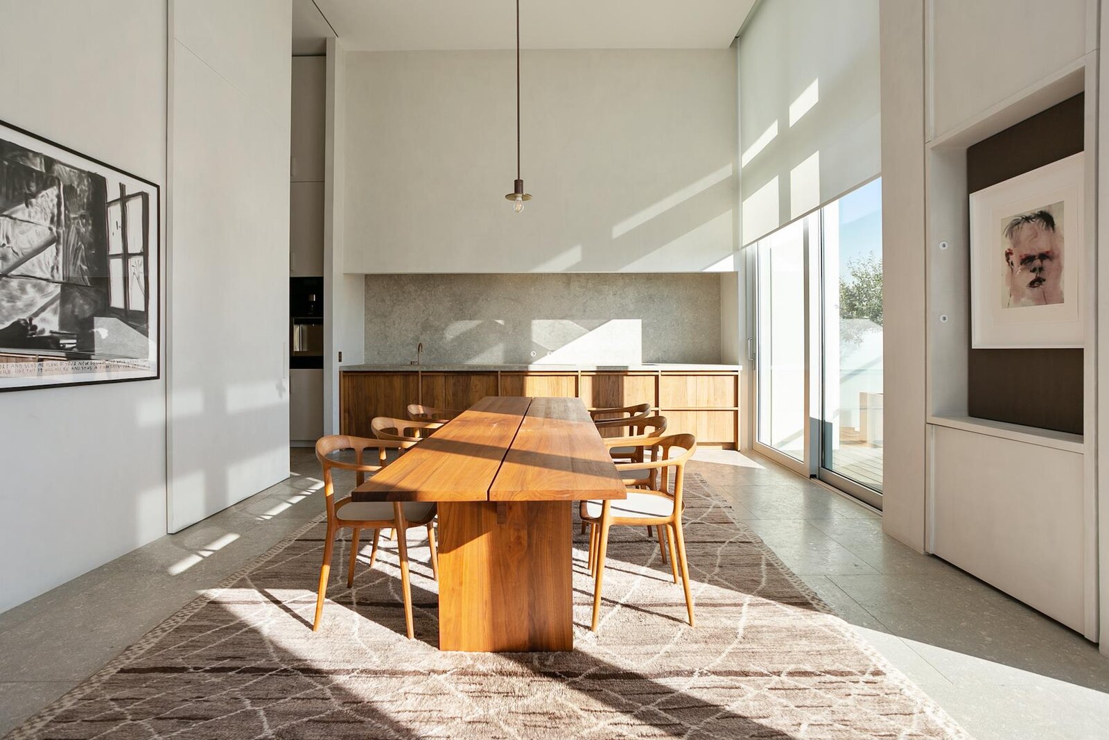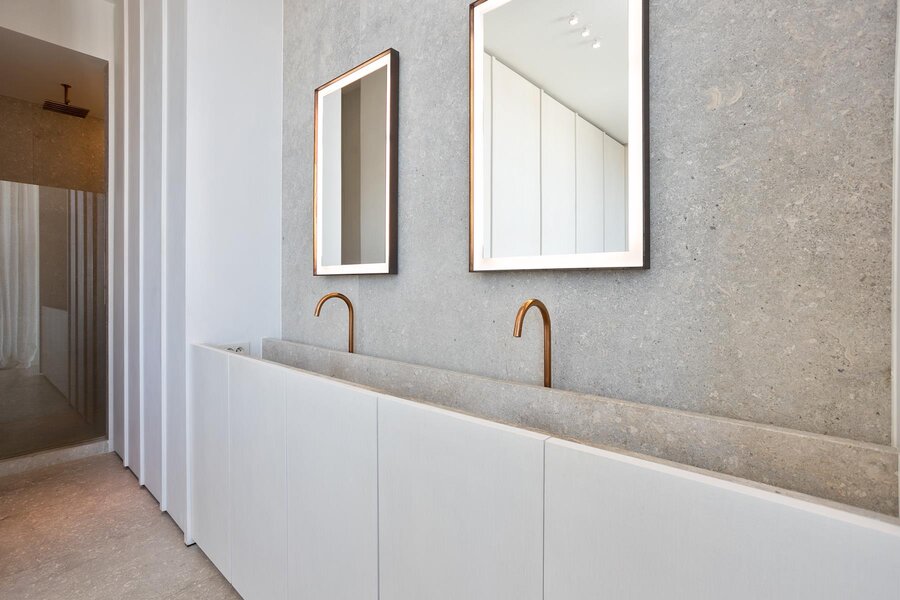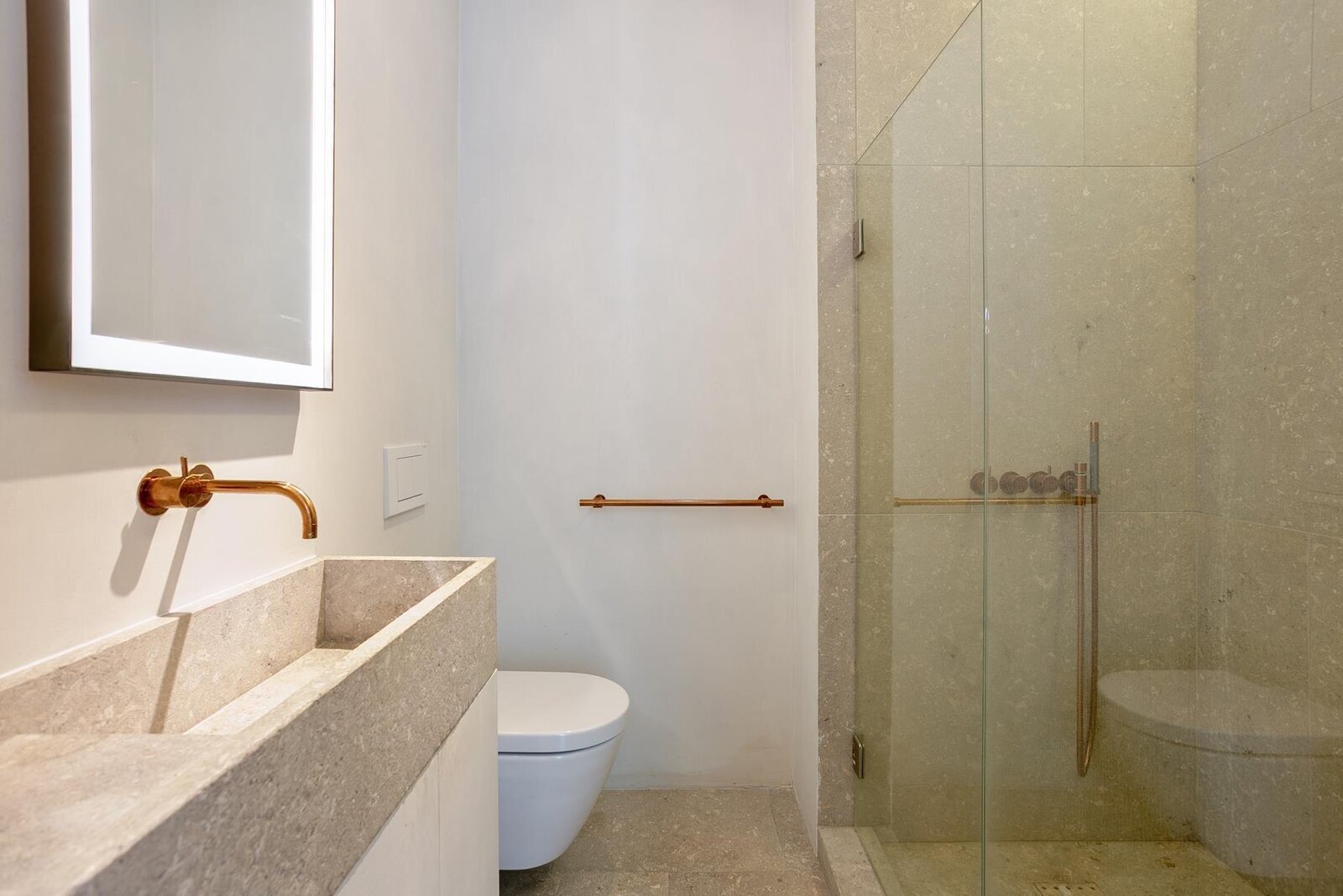 Voor de afwerking van de penthouse werd gekozen voor natuursteen, notenhout en krijt kleurige muren.
