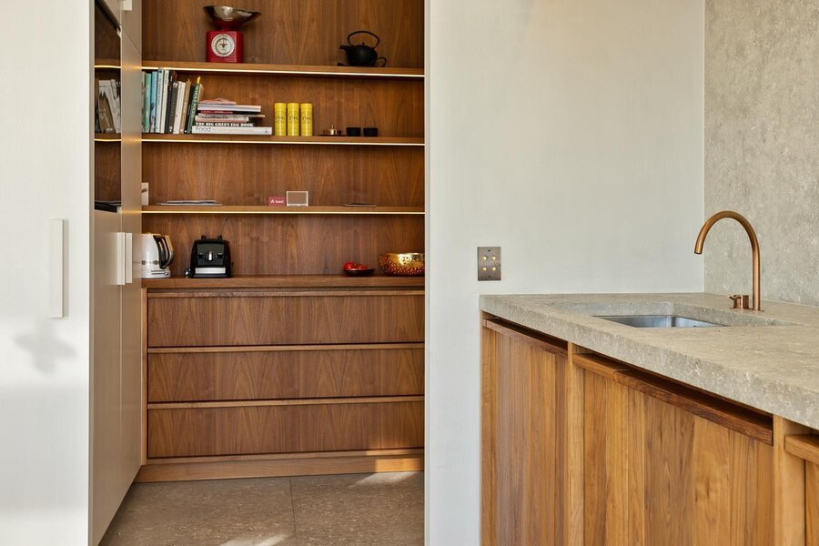 De keukenkasten zijn gemaakt van Amerikaans notenhout, wat eveneens terugkomt in de royale boekenkast naast de open haard.
