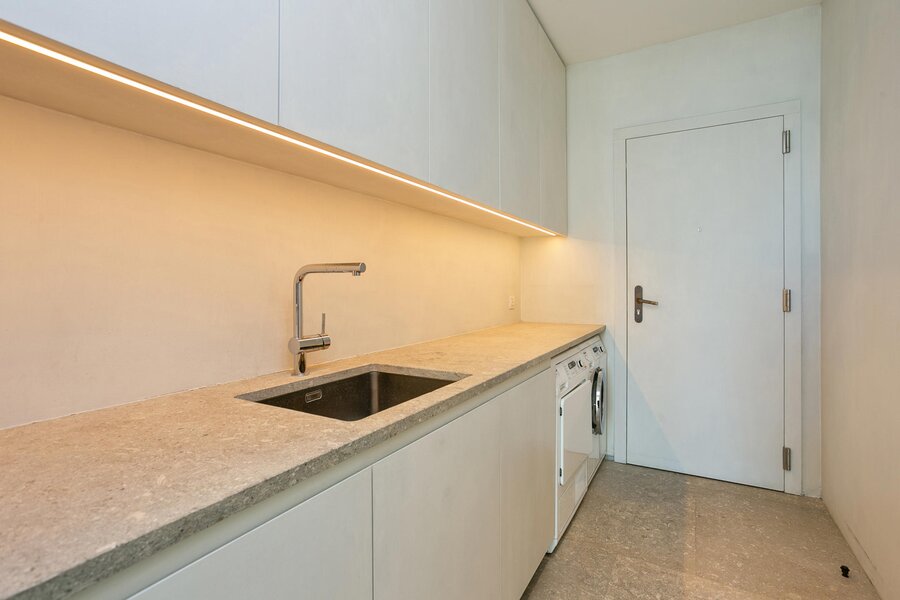 De wasplaats is voorzien van veel kast- en bergruimte.