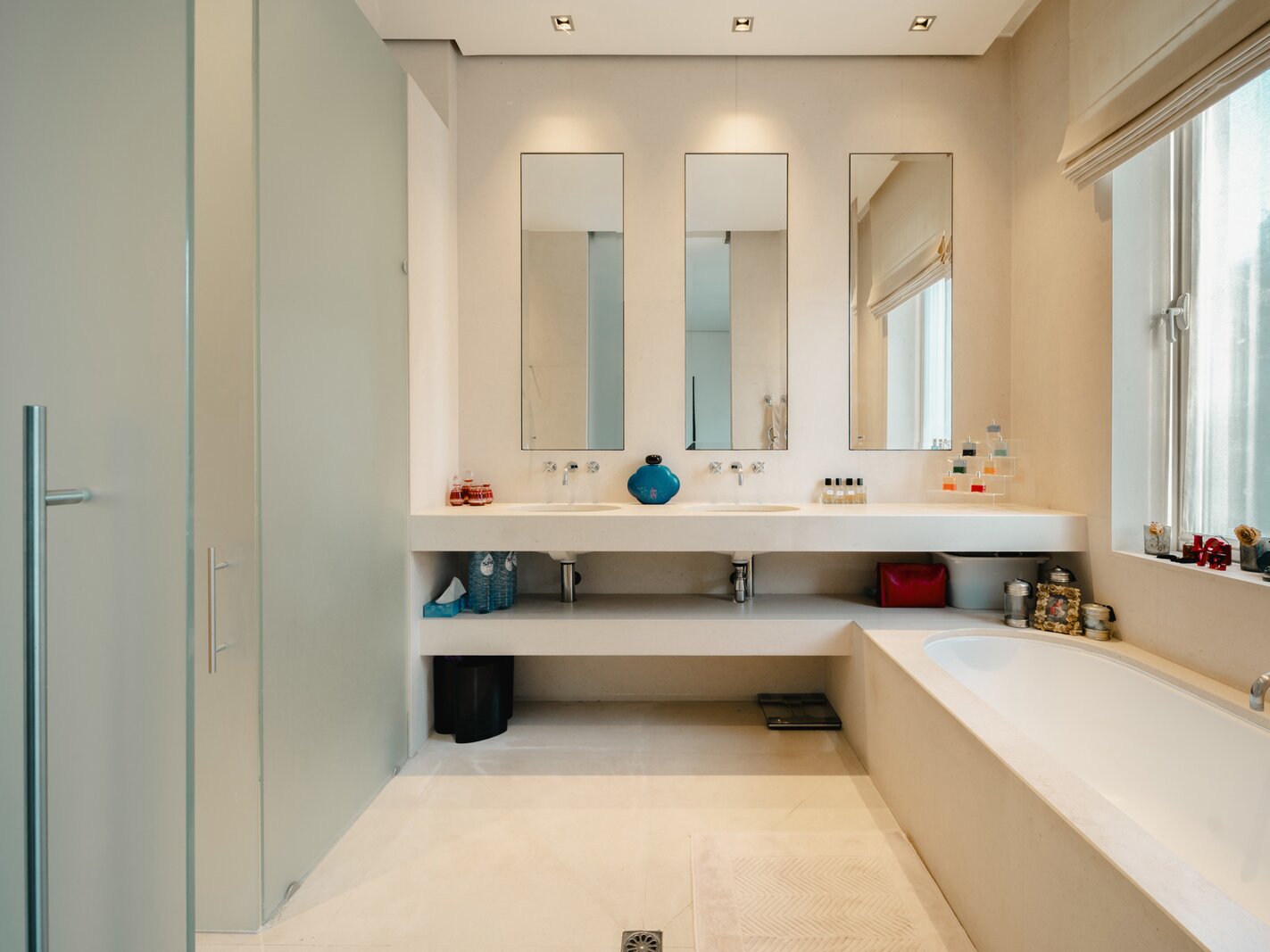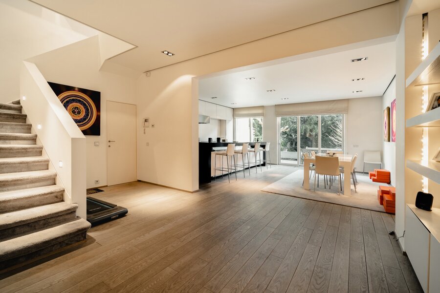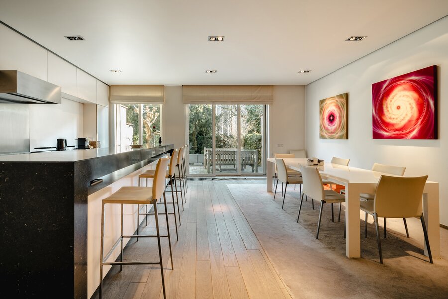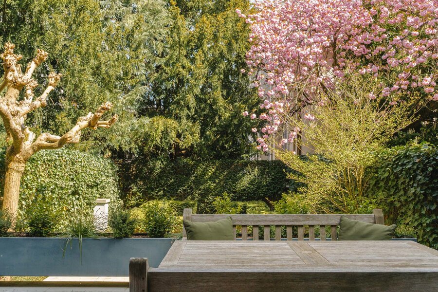 Verdeeld over 4 verdiepingen, met een bruto vloeroppervlak van ongeveer 376 m² (wegens EPC), biedt deze woning een uitzonderlijke leefomgeving. De inkomhal leidt naar een leefruimte met een ultra-uitgeruste open keuken, die uitgeeft op de lichte eetkamer en uitgeeft op het gelijkvloerse terras en de franse tuin. Op de 1e verdieping strekt de ruime woonkamer met open haard zich uit over de volle breedte van de gevel. Aan de tuinkant ligt de hoofdslaapkamer, een echt uitstalkastje van comfort, met een aangrenzende badkamer versierd met Bourgondisch steen. De 2e verdieping biedt een suite met badkamer, aparte studeerkamer en terras, evenals een 2e suite met doucheruimte, en een 3e slaapkamer of studeerkamer. In de kelder bevinden zich talloze kelders, een wasruimte en een doucheruimte voor het personeel.