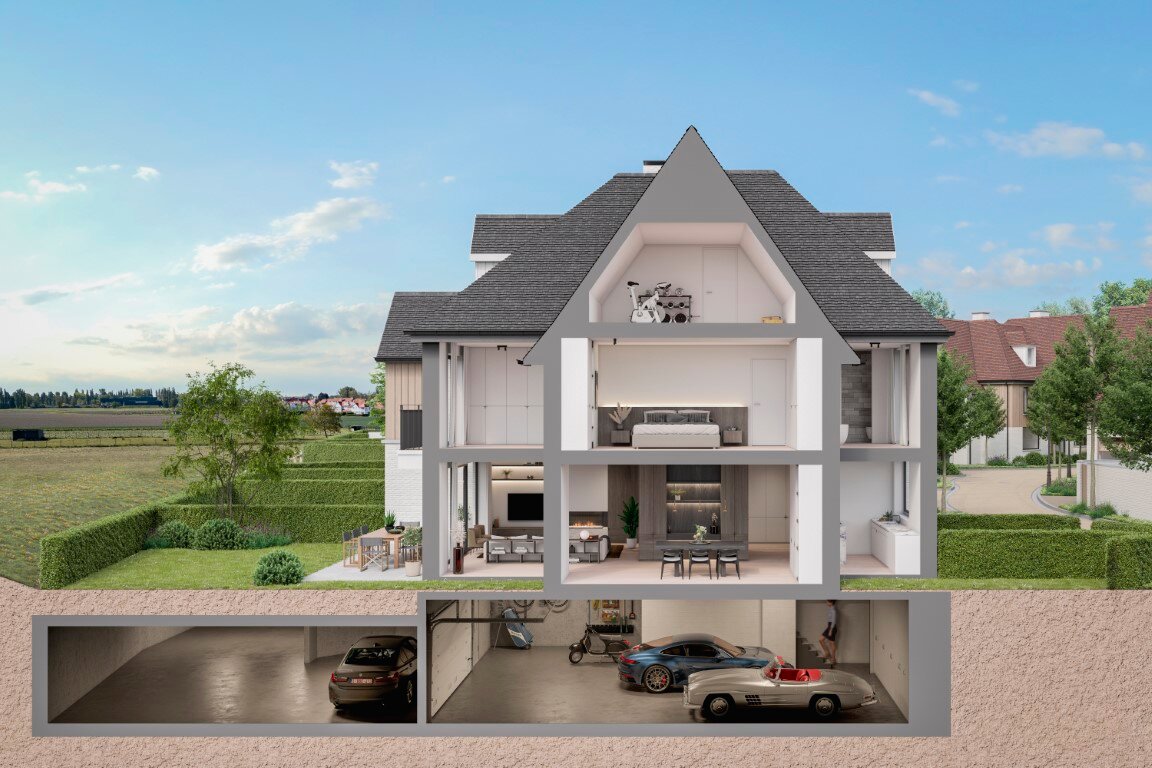 Grote ondergrondse garage met berging en parkeerplaats voor circa 3 wagens.