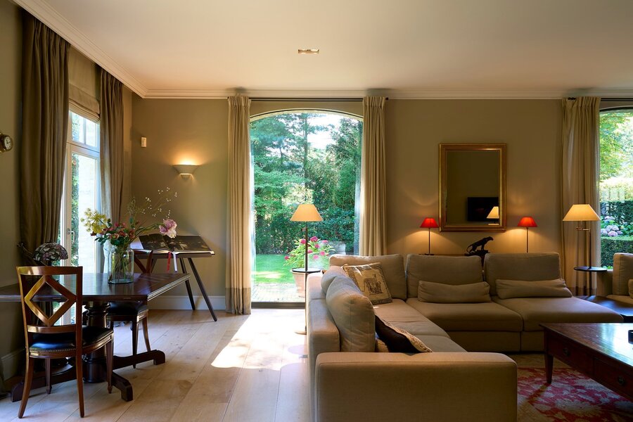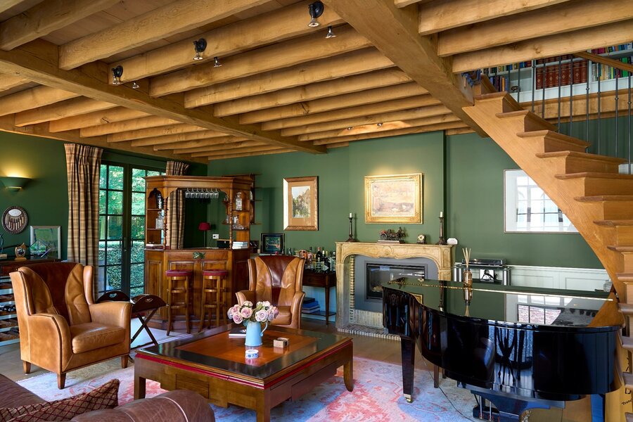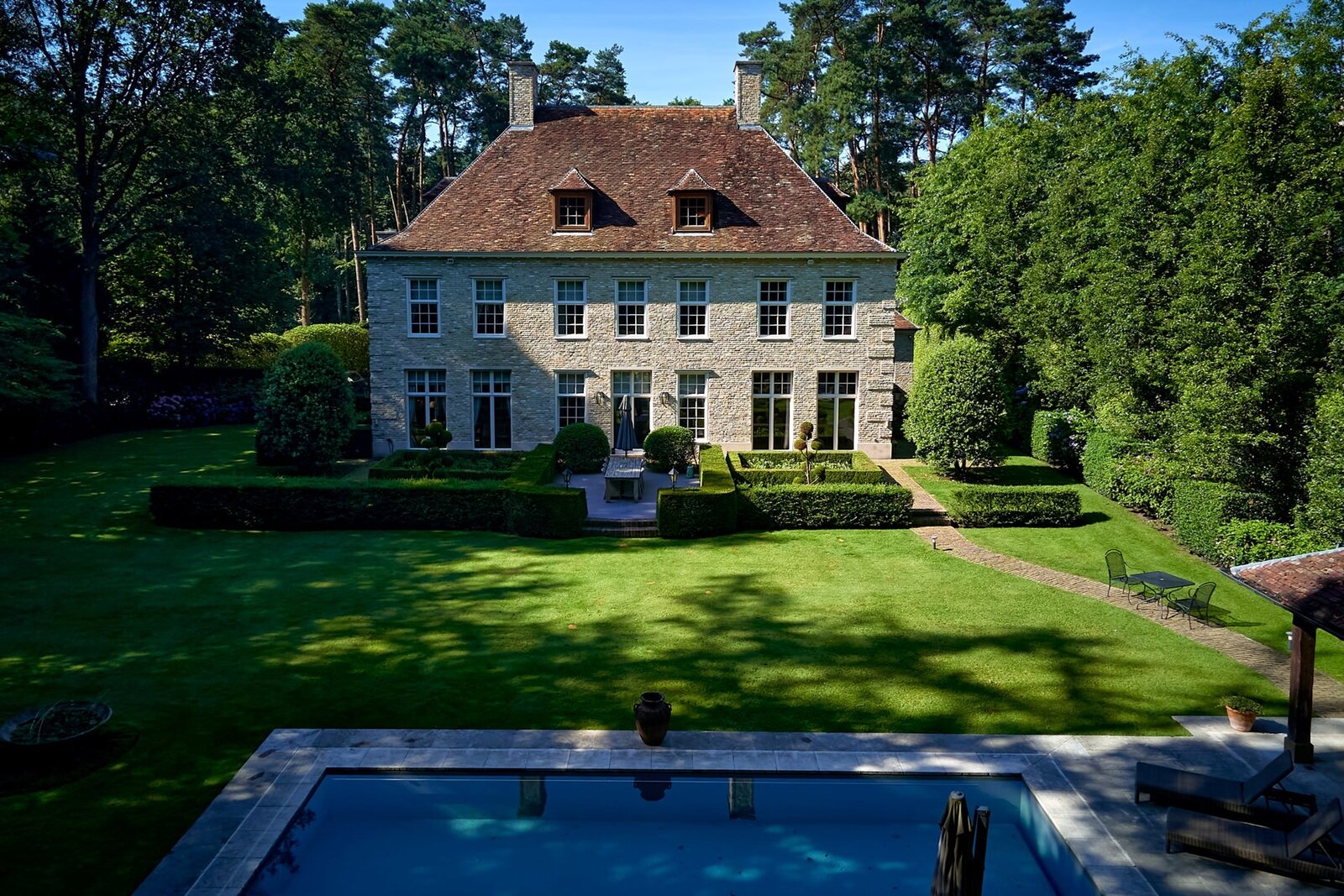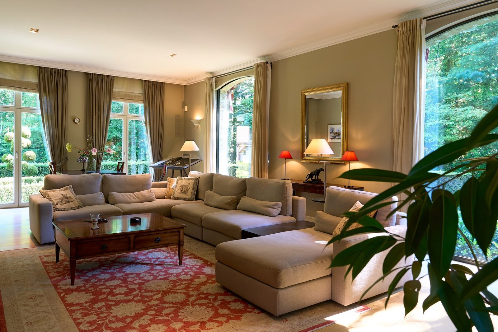 Indeling gelijkvloers: mooie entree met majestueus trappenhuis, stopplaats van de lift, gastentoilet en vestiaireruimte, ruime living met extra brede plankenvloer en opslaande deuren naar de tuin, in de open haard met antieke mantel pronkt een houtkachel, toegang naar de “herenkamer/muziekkamer” eveneens voorzien van open haard (gashaard), oa voorzien van bar met tv ruimte, vast trap naar een ruim huisbureau.