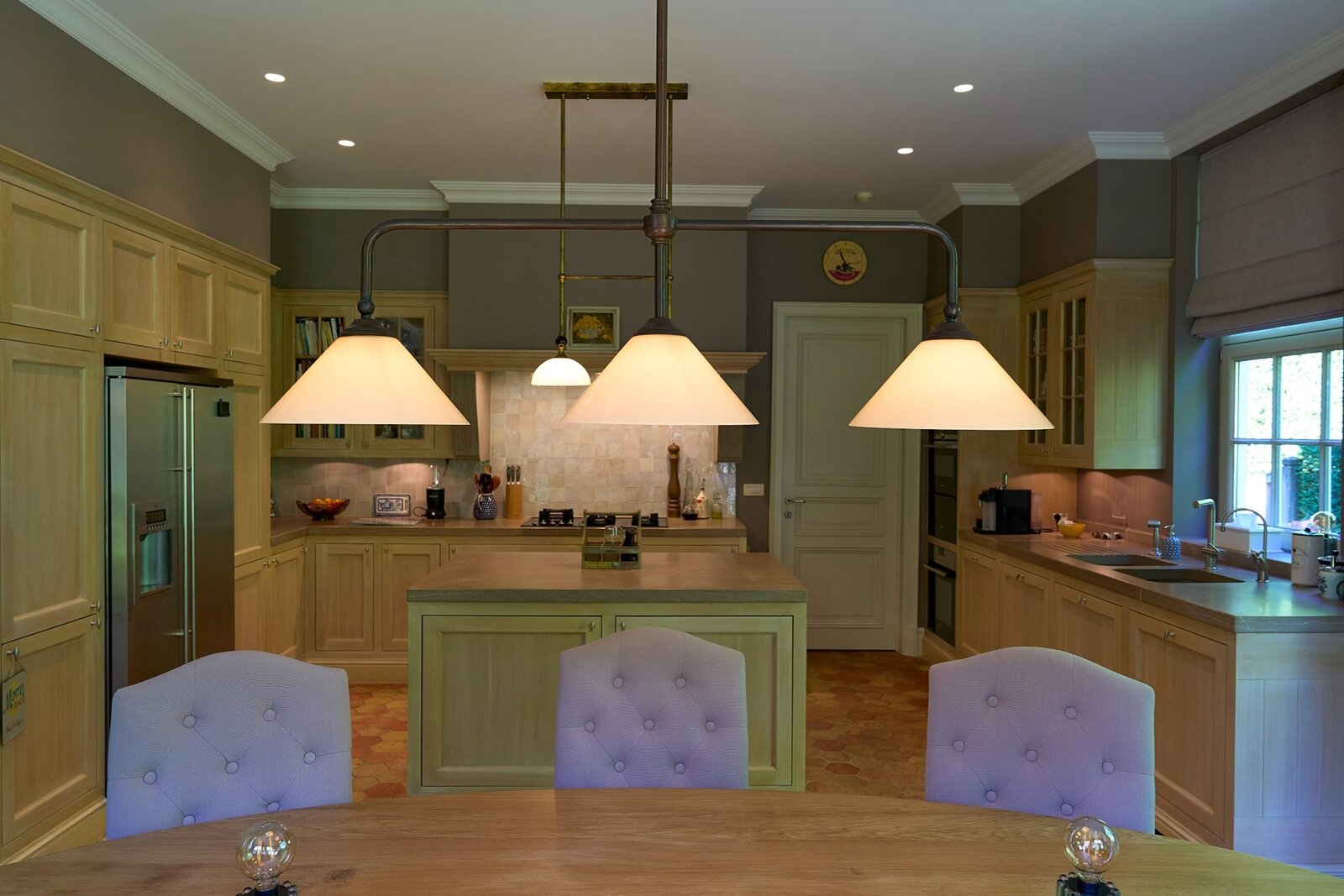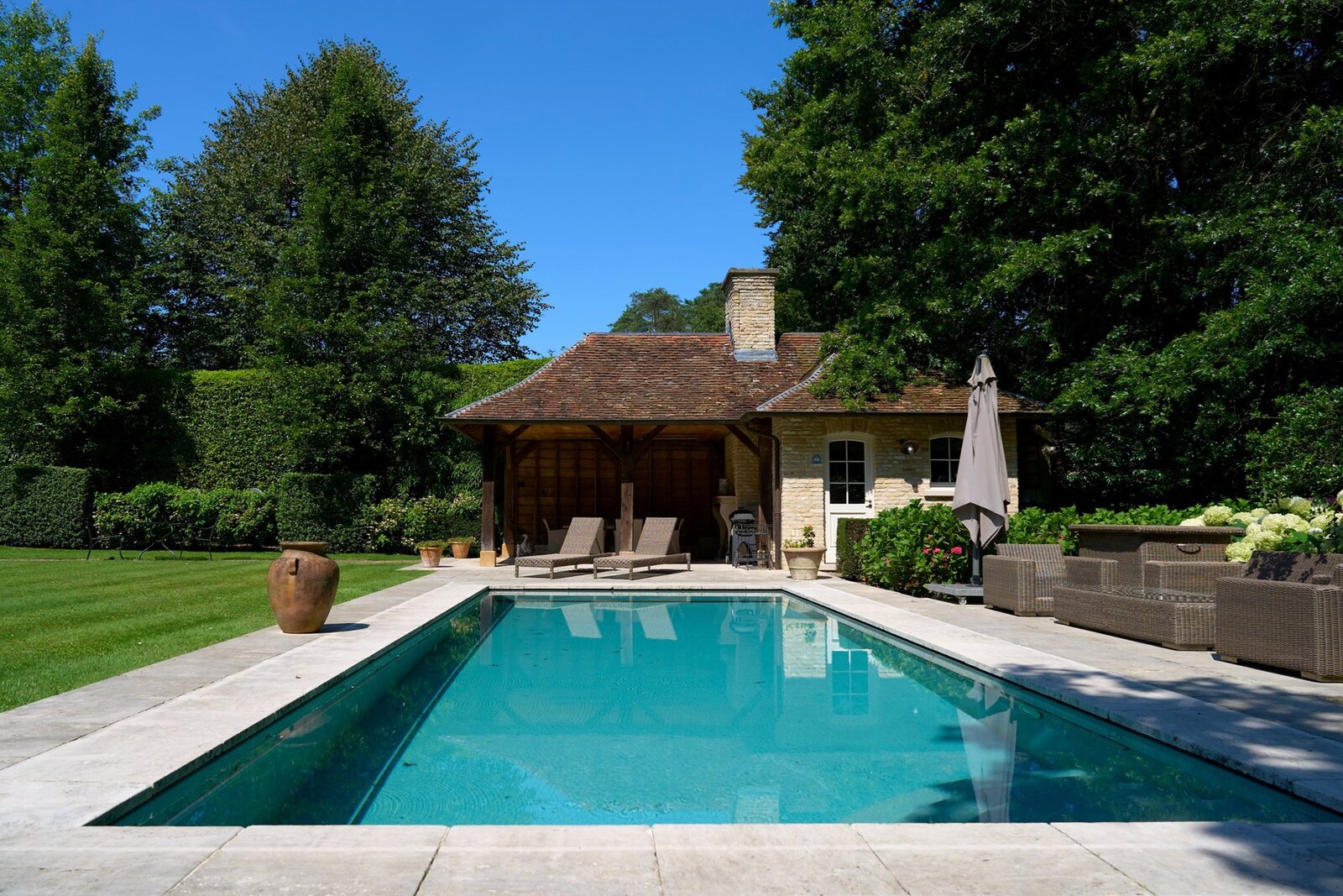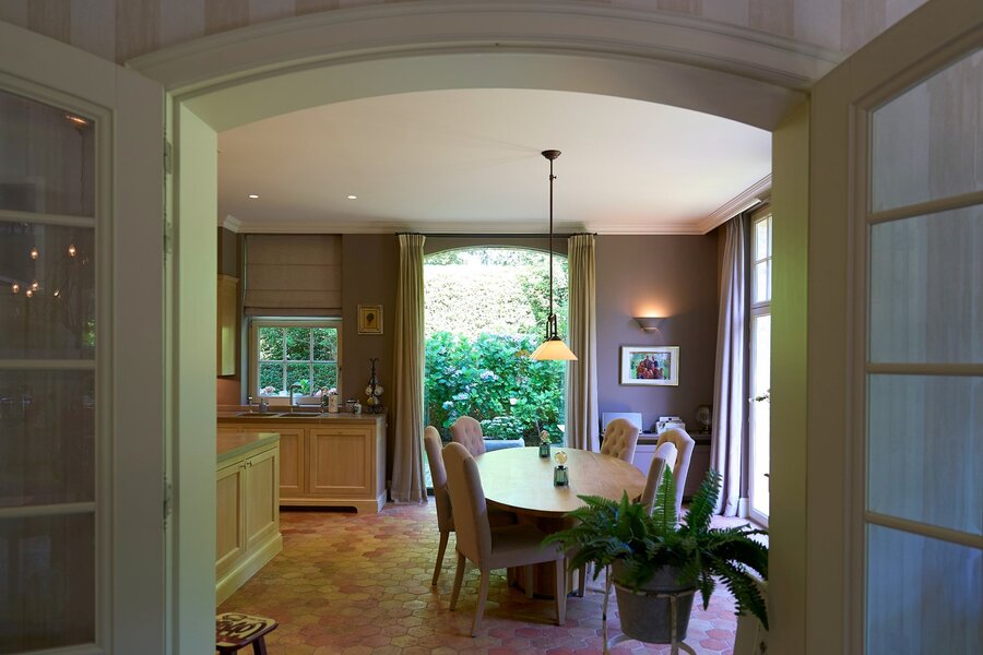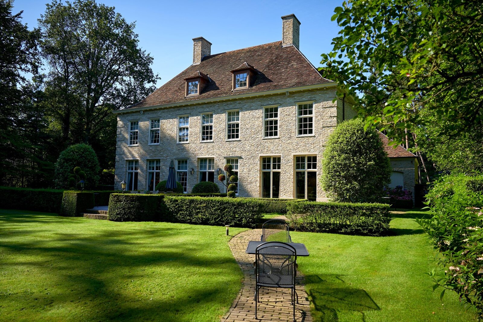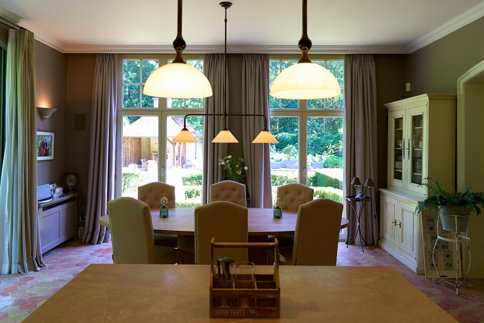 Naast de living is de formele eetkamer voorzien van een authentieke Bourgondische stenen vloer, ruime leefkeuken met ontbijtplaats, voorzien van alle toestellen, openslaande deuren naar de tuin en mooie raampartij, bijkeuken met ingemaakte kasten, ruime garage voor 2 wagens met automatische poorten en bergzolder.