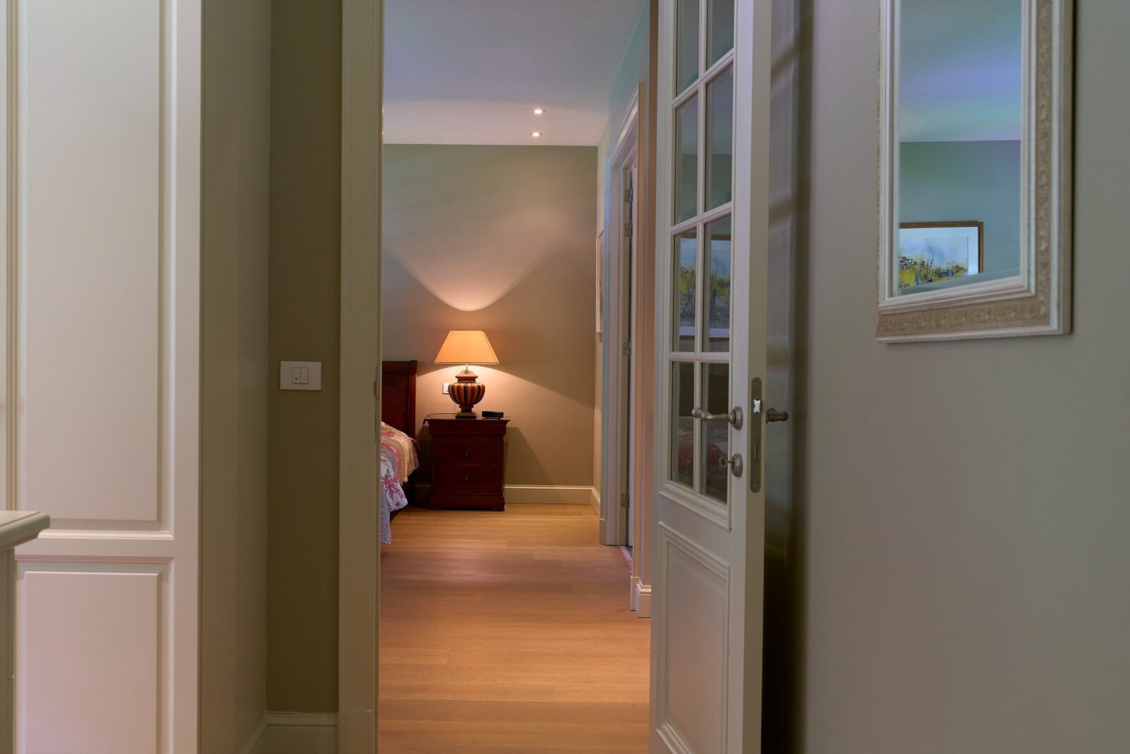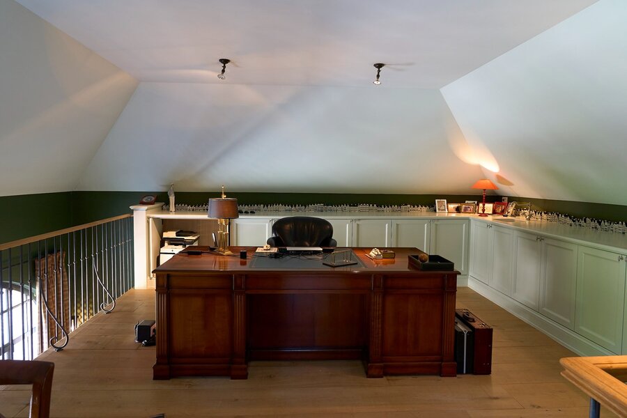 Indeling 2e verdieping: overloop welke eveneens kan afgesloten worden met een veiligheidsdeur, vierde ruime slaapkamer met douchekamer (thans fitness), vijfde en zesde slaapkamer en de vierde douchekamer.