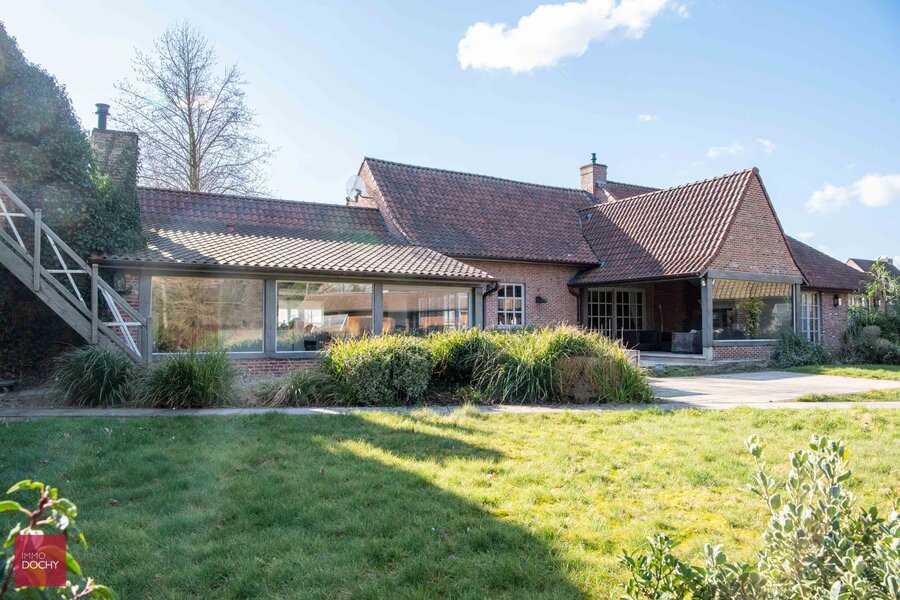 Bestaande uit inkomhal, living in Bourgondische dallen en cassette, eetplaats, bureelruimte met aquarel, ingerichte keuken met open haard, bijkeuken, 2 slaapkamers op het gelijkvloers, luxe-badkamer met massief bad, inloopdouche en dressing, praktijkgedeelte met afzonderlijke ingang (ca 60m²). Op het verdiep is er een grote zolder (extra kamers) + appartement via buitentrap. Verder is er een dubbele garage met private oprit, carport, berging, mooie tuin met waterpartij en verschillende bijgebouwen (momenteel duiventil).
