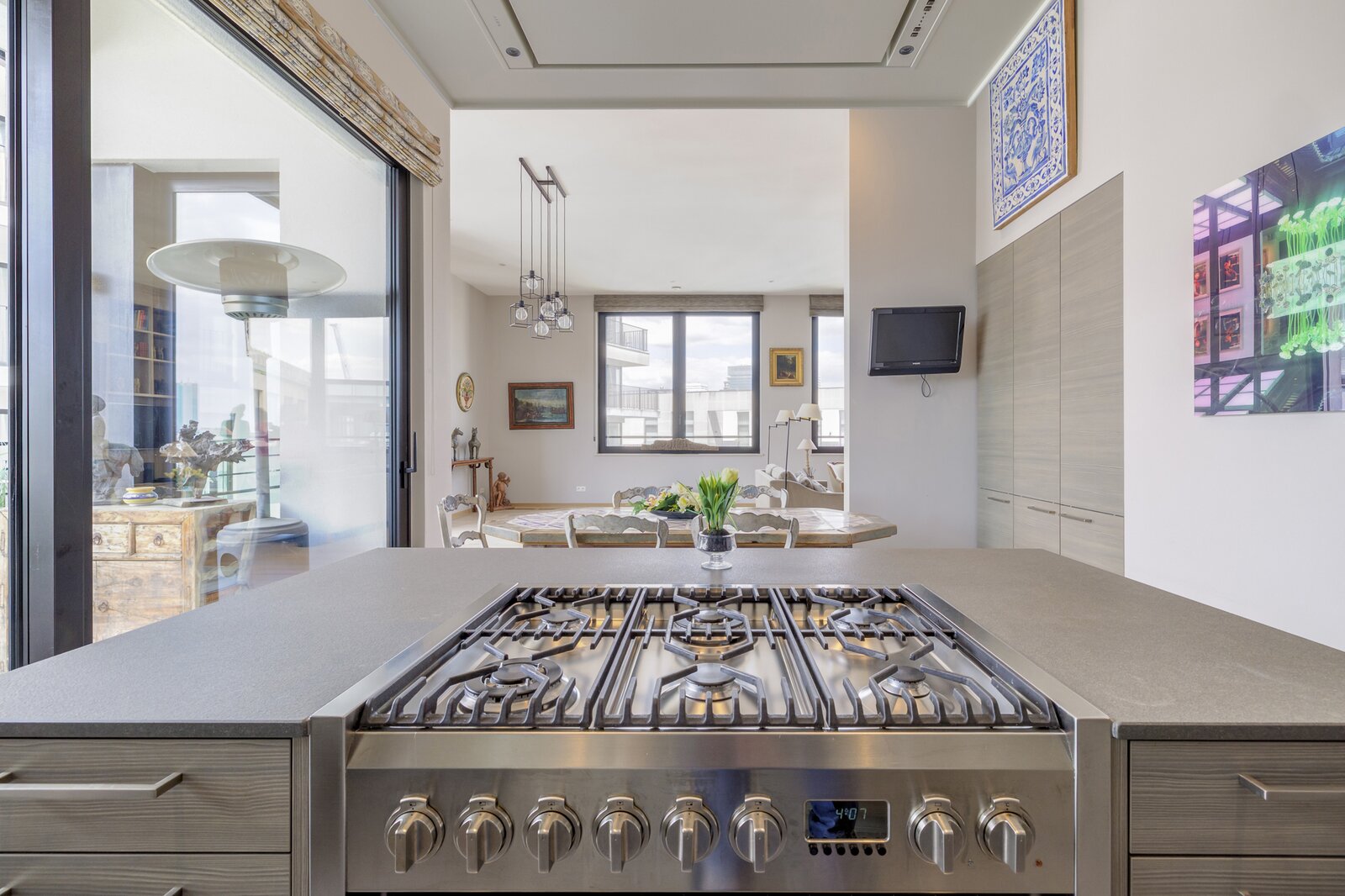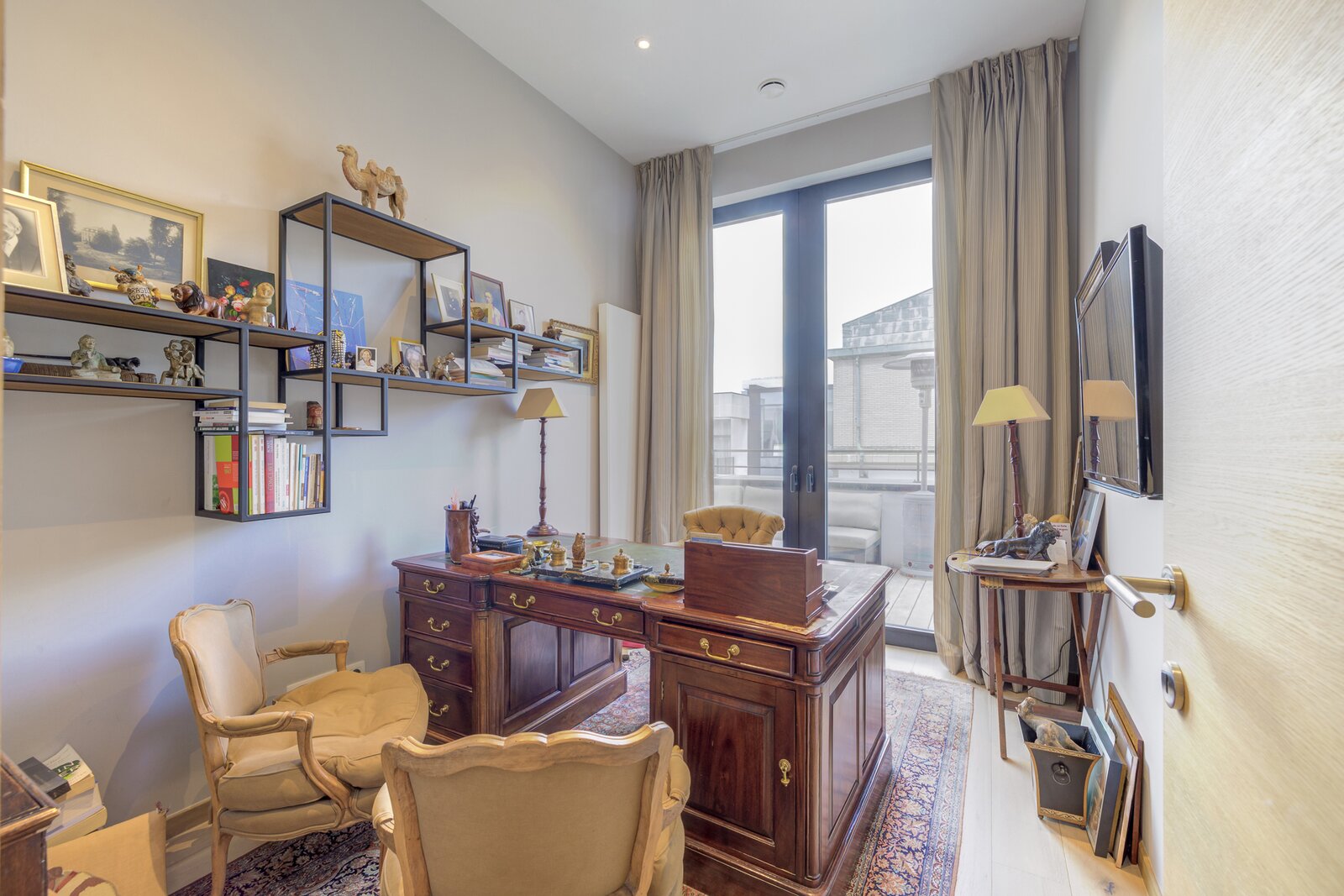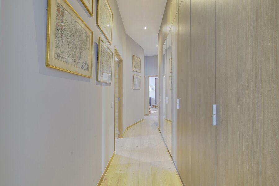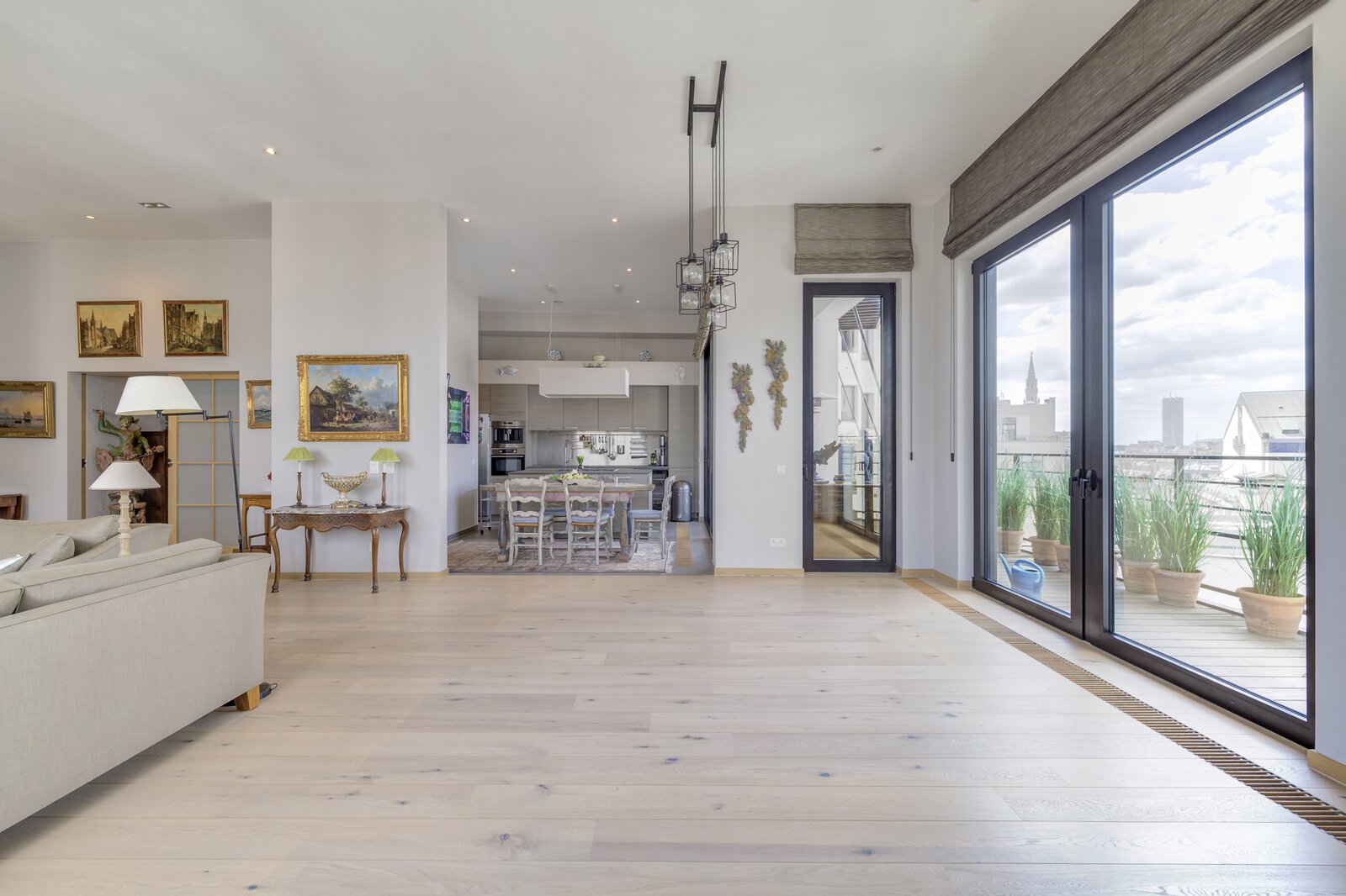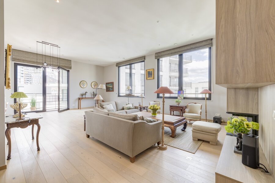 Het appartement is licht en verfijnd en valt meteen op door de ruime woonkamer met open haard op gas, de hoge plafonds en het grote terras met panoramisch uitzicht over de stad.