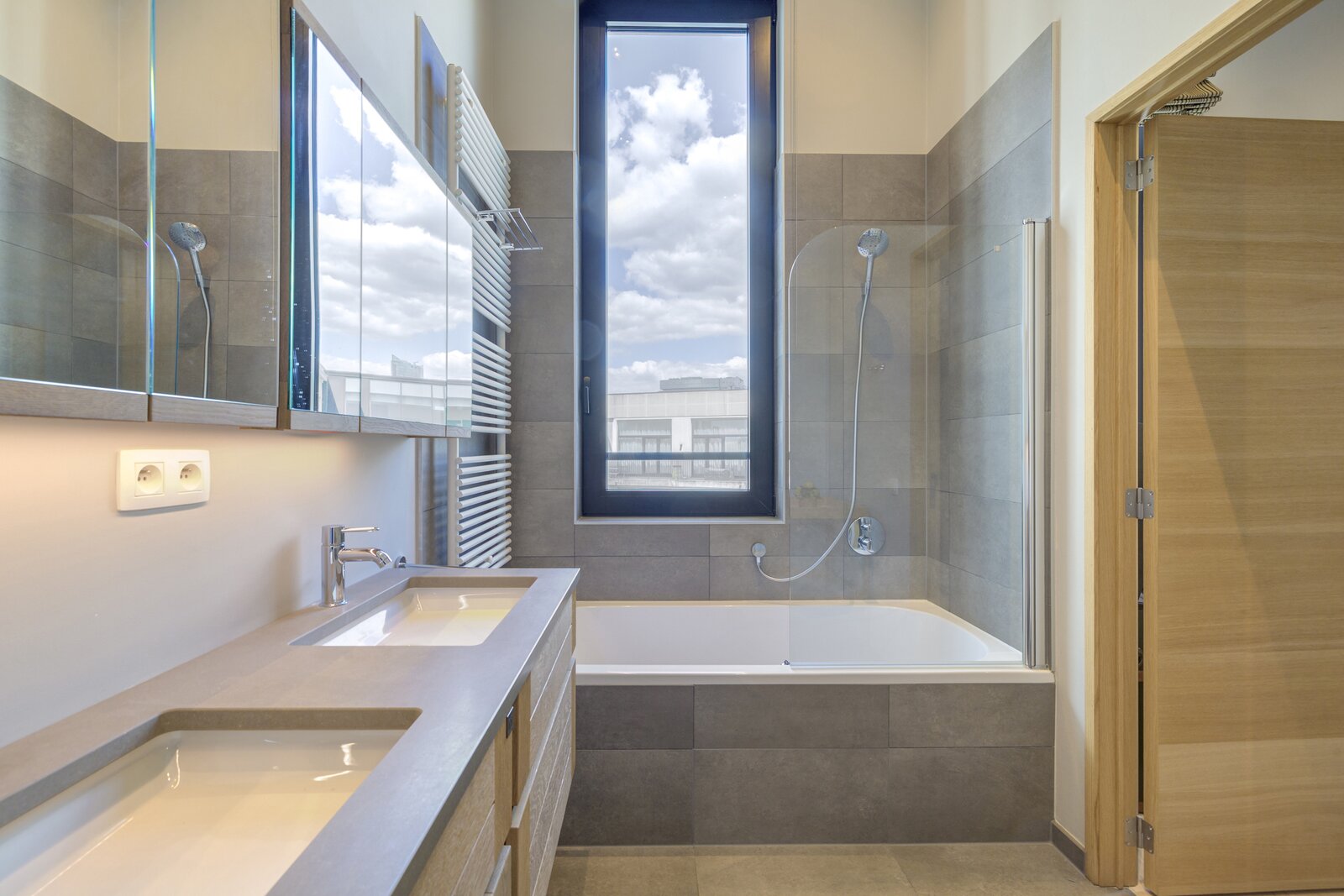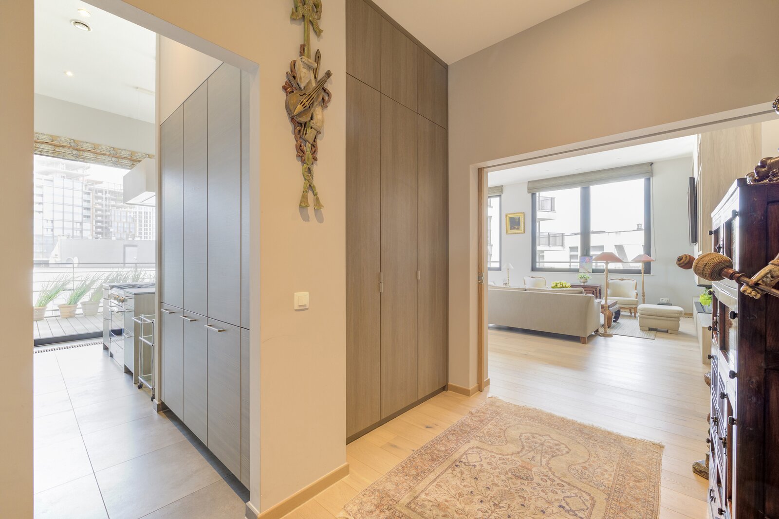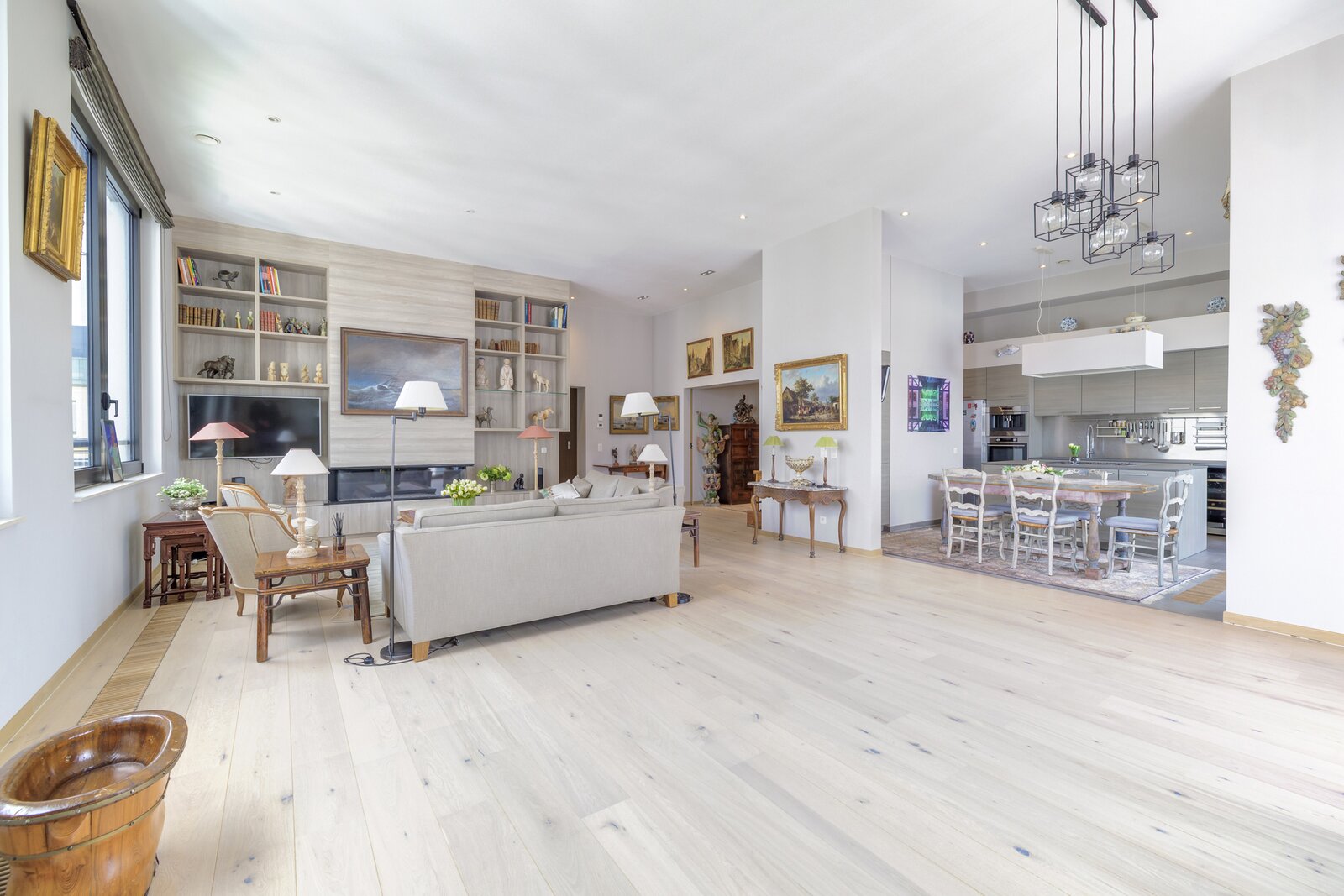 Het appartement is licht en verfijnd en valt meteen op door de ruime woonkamer met open haard op gas, de hoge plafonds en het grote terras met panoramisch uitzicht over de stad.