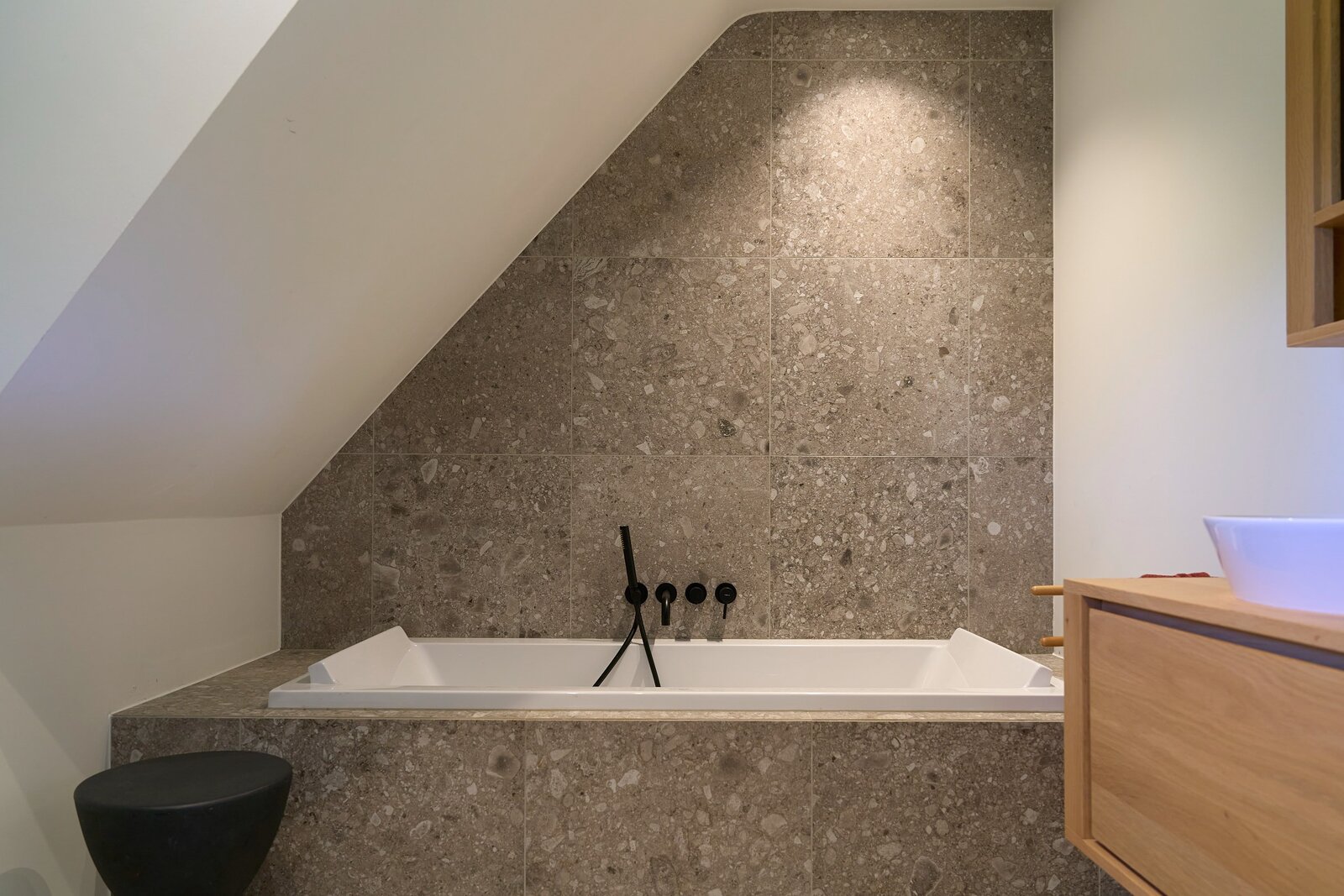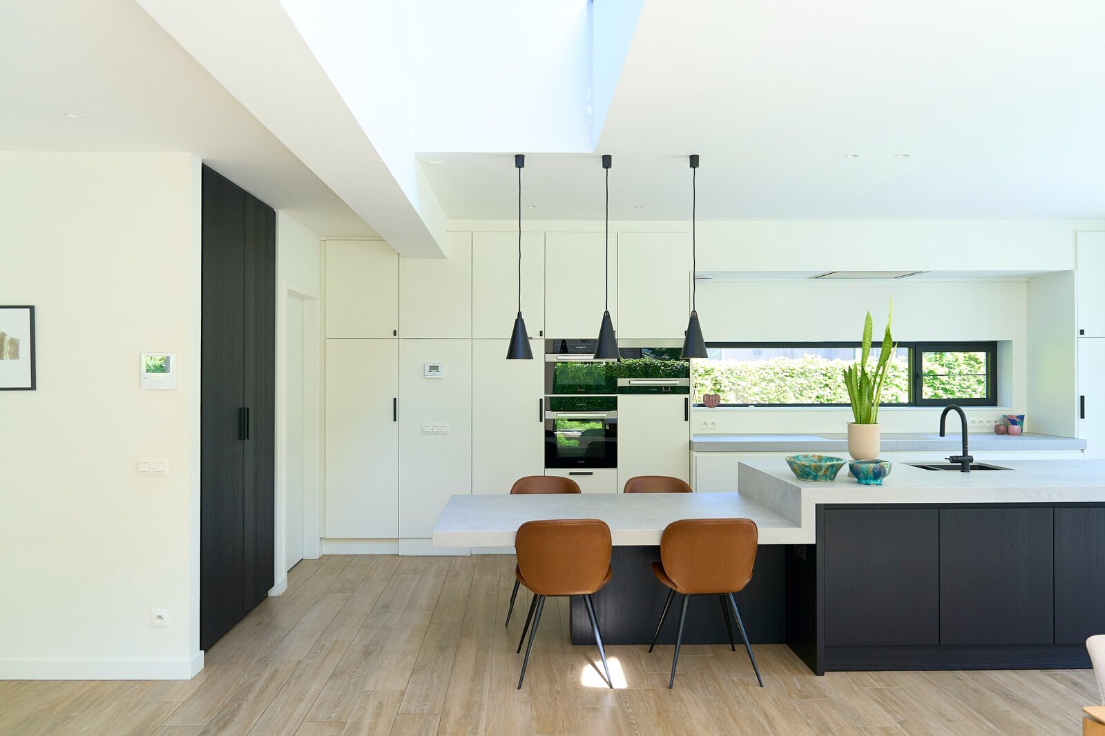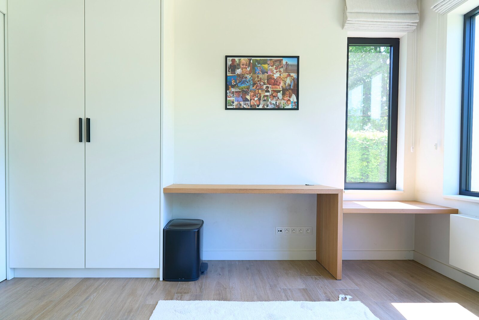 Een aparte bureauruimte – afsluitbaar met elegante schuifdeuren – maakt thuiswerken of studeren bijzonder aangenaam, met uitzicht op de tuin. De open keuken is volledig uitgerust met hedendaagse toestellen en stijlvol geïntegreerd in de leefruimte: koken wordt hier een gedeelde belevenis.