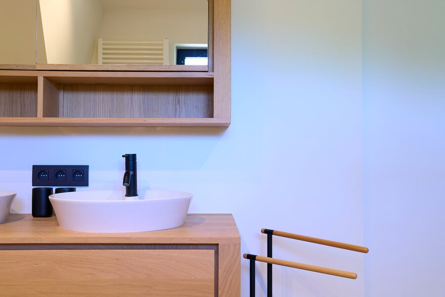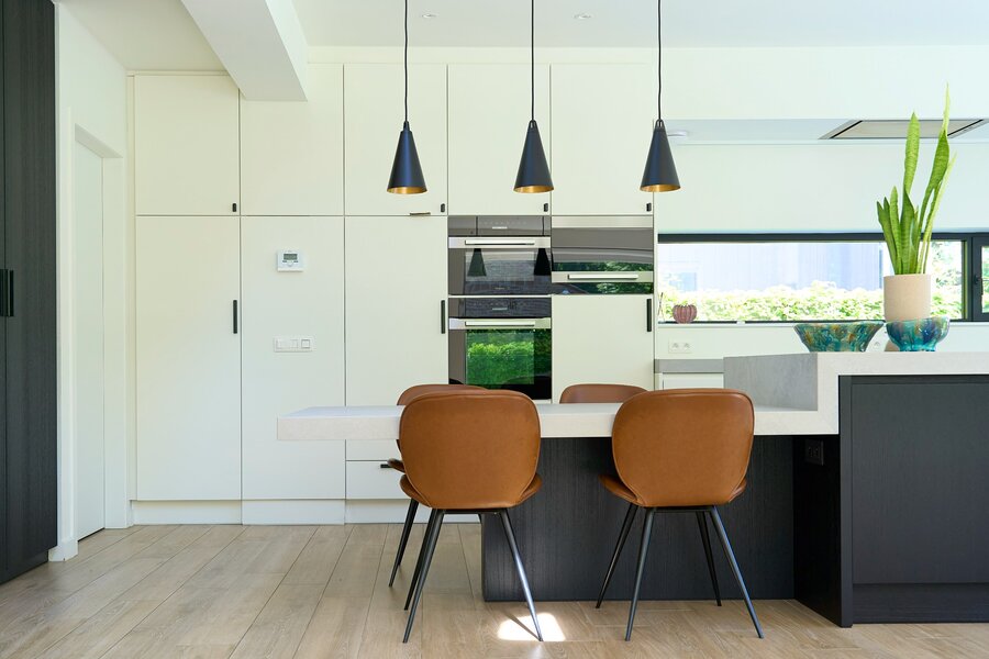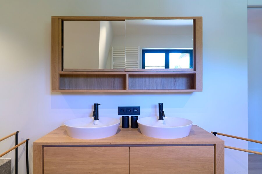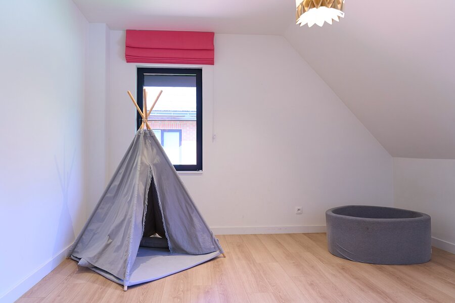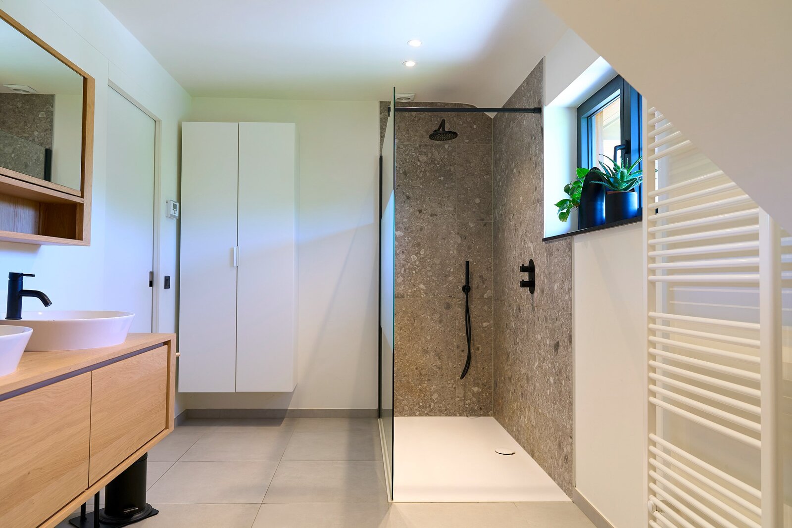 Een aparte bureauruimte – afsluitbaar met elegante schuifdeuren – maakt thuiswerken of studeren bijzonder aangenaam, met uitzicht op de tuin. De open keuken is volledig uitgerust met hedendaagse toestellen en stijlvol geïntegreerd in de leefruimte: koken wordt hier een gedeelde belevenis.