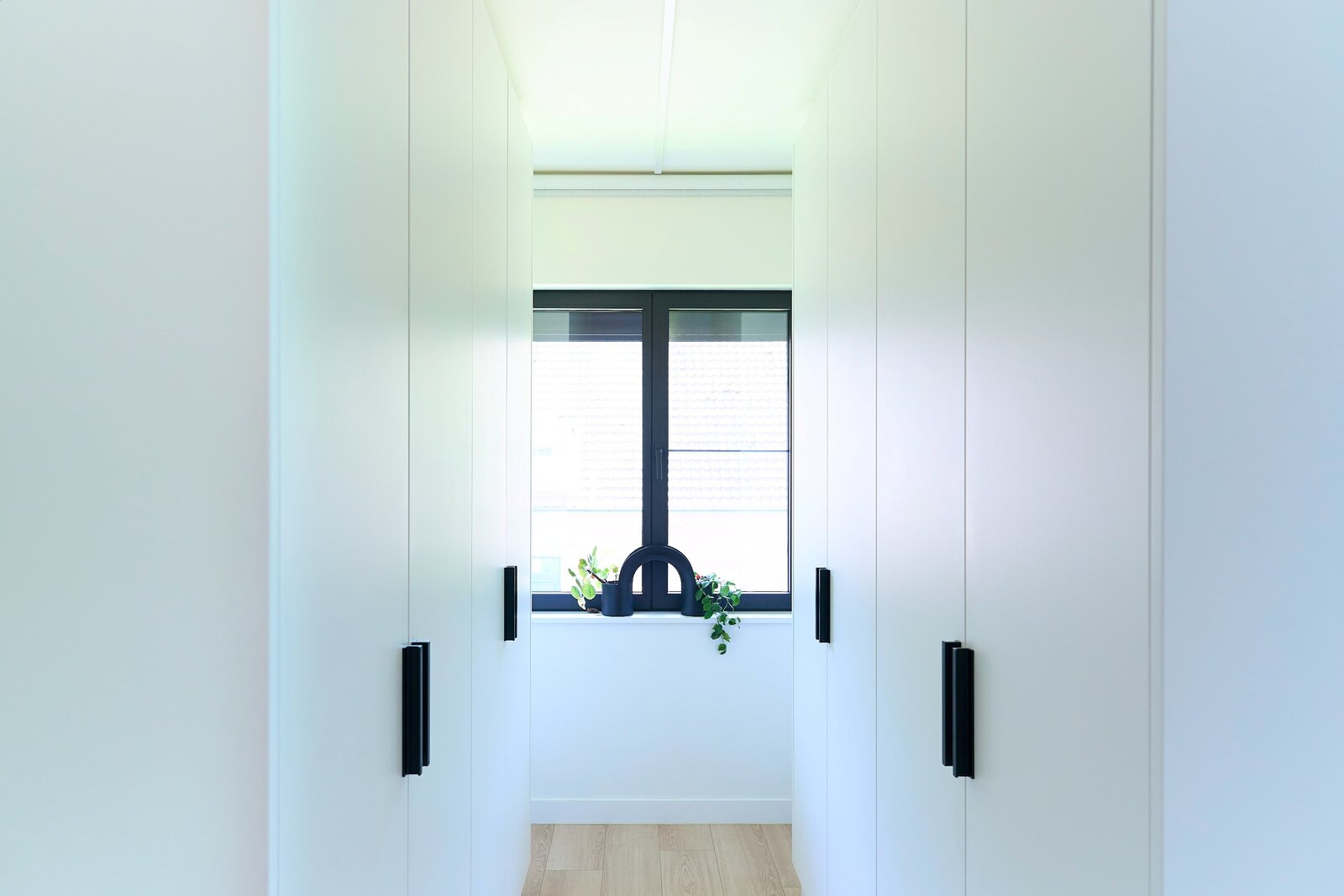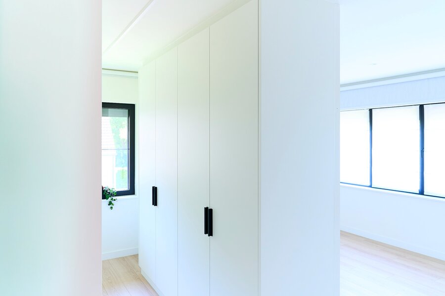 Een royale ouderslaapkamer met een stijlvolle walk-in dressing en grote raampartijen