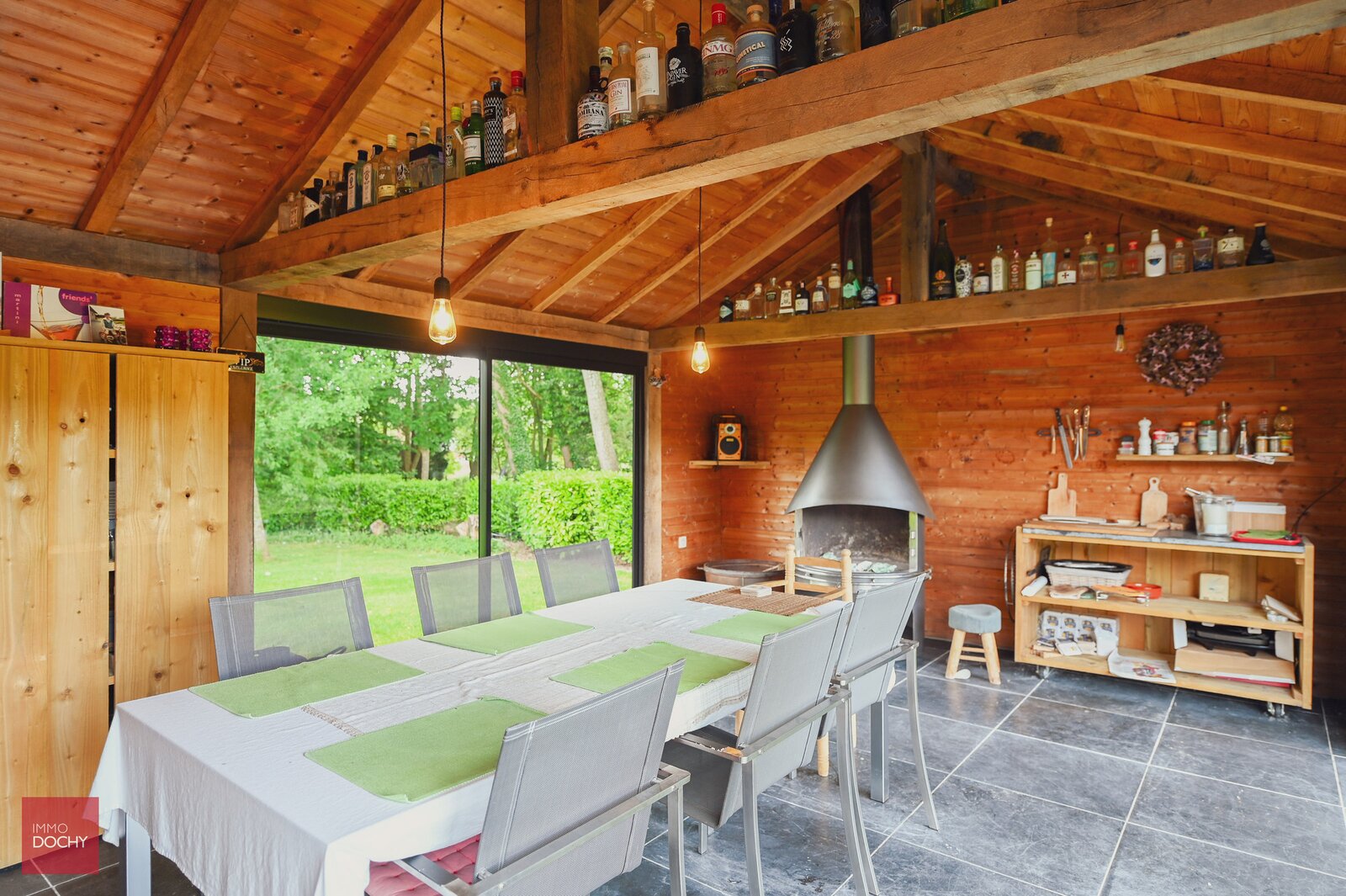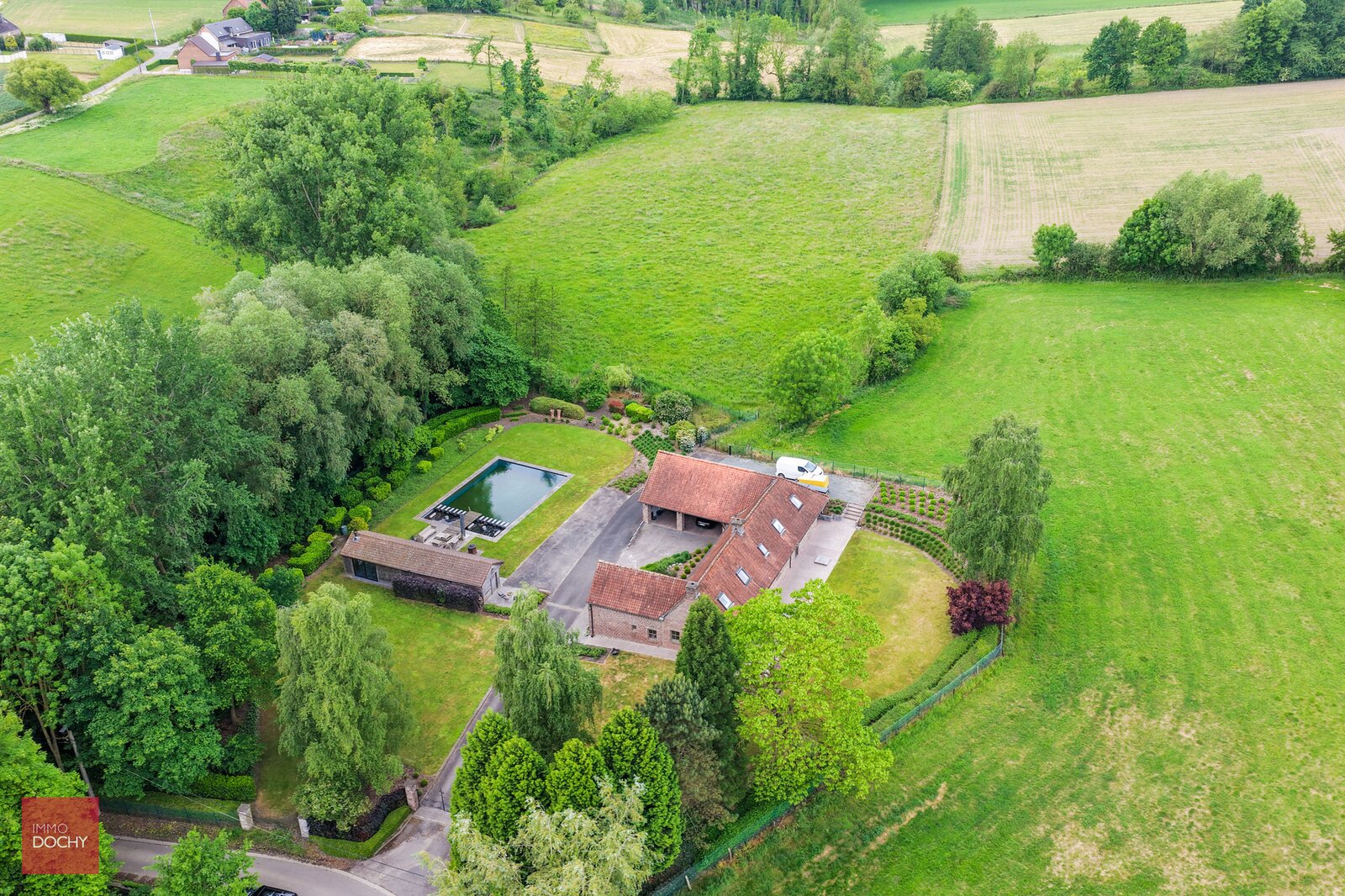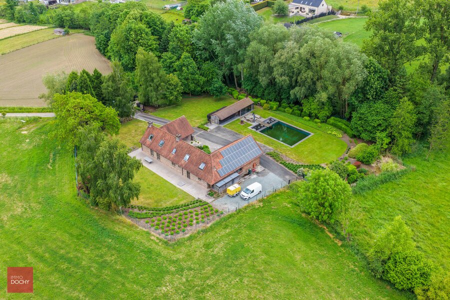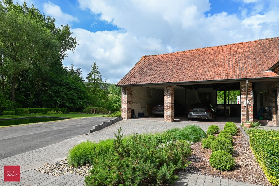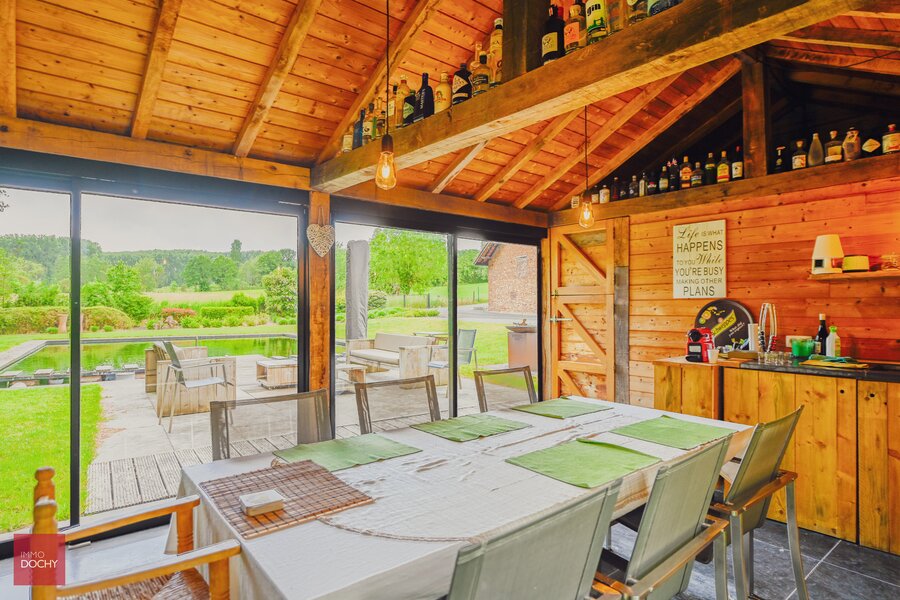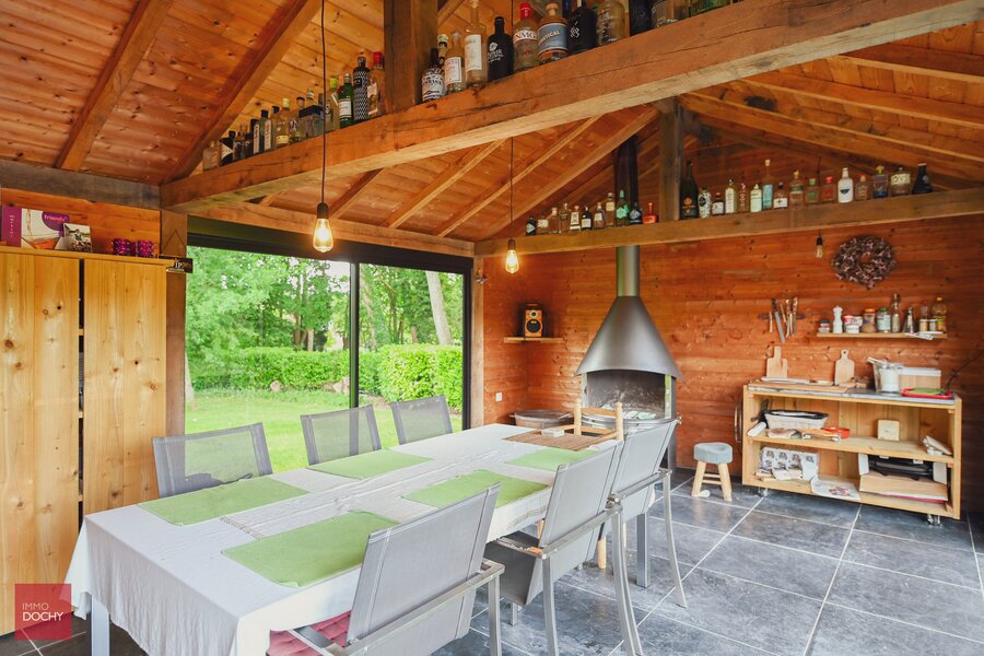 Bestaande uit inkomhal, bureel, living met haard (bio-ethanol, eetplaats, ingerichte keuken, wasplaats, berging, 3 slaapkamers en badkamer. Dubbele carport, tuinberging met sauna, douche en mancave (bar). Tuin met landelijk zicht en ruime zwemvijver. Opp. 4.062m². 48 zonnepanelen + zonneboiler.