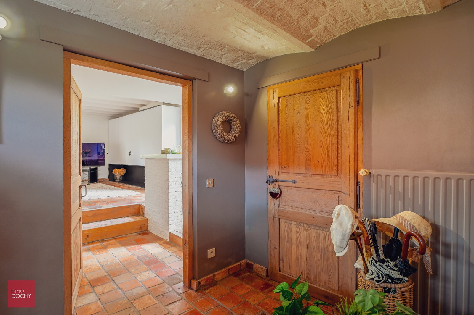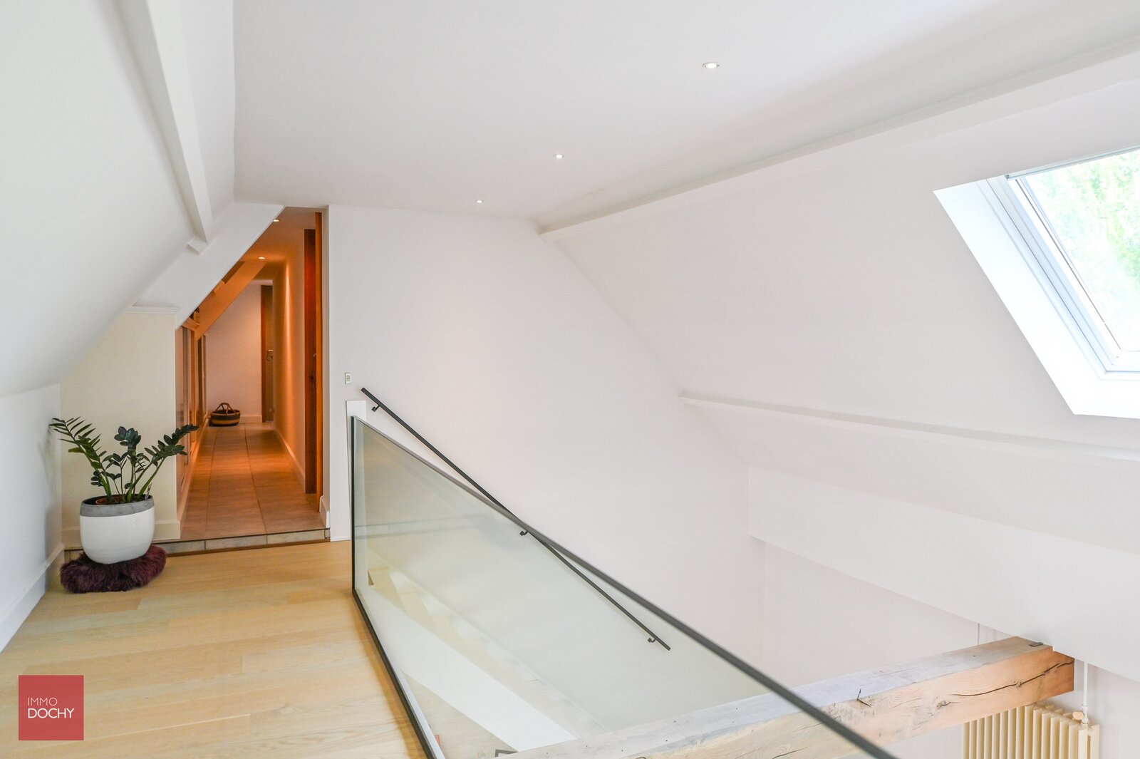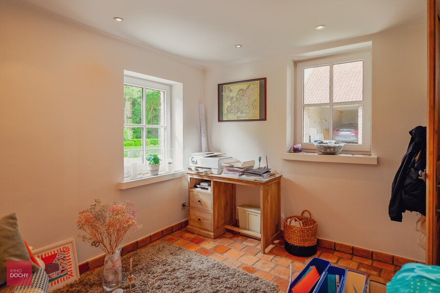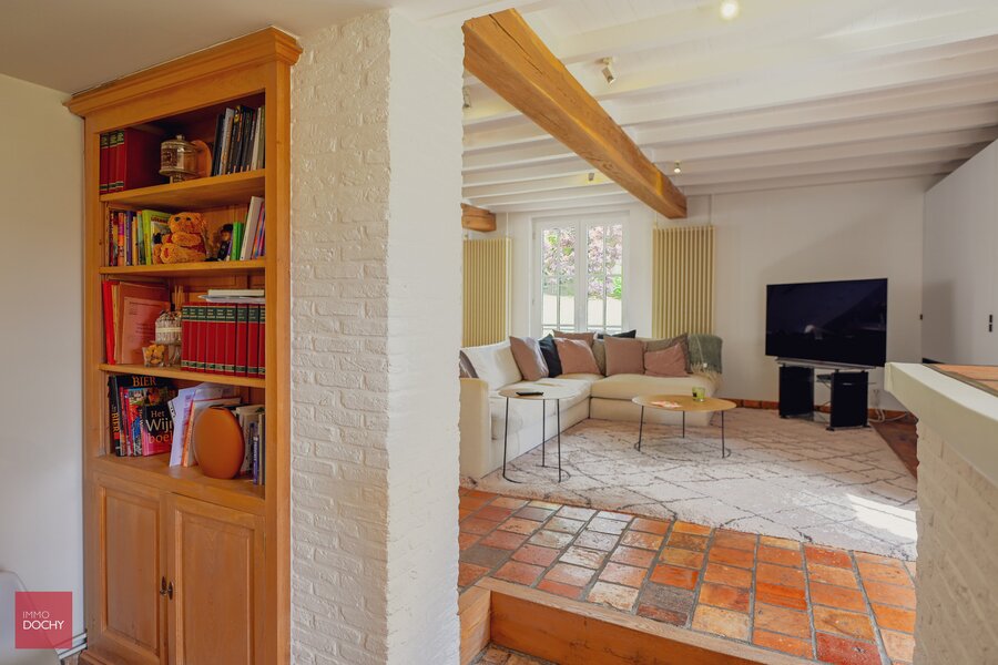 Bestaande uit inkomhal, bureel, living met haard (bio-ethanol, eetplaats, ingerichte keuken, wasplaats, berging, 3 slaapkamers en badkamer. Dubbele carport, tuinberging met sauna, douche en mancave (bar). Tuin met landelijk zicht en ruime zwemvijver. Opp. 4.062m². 48 zonnepanelen + zonneboiler.
