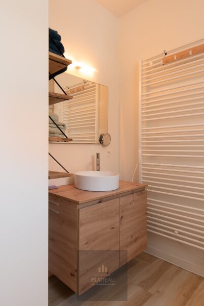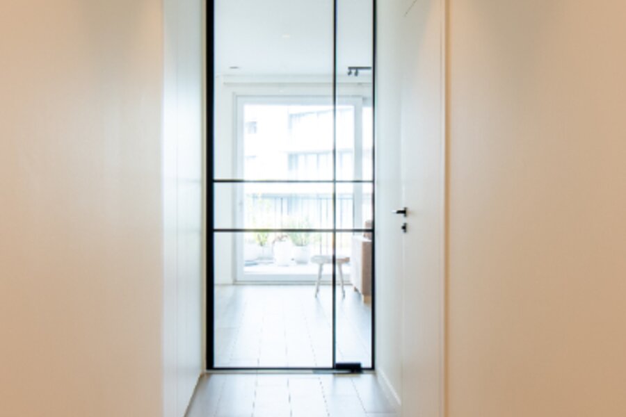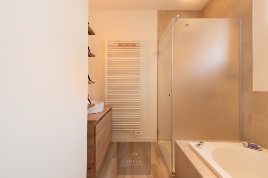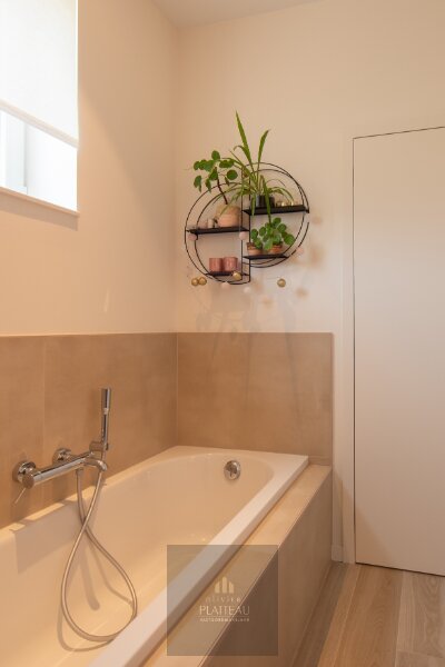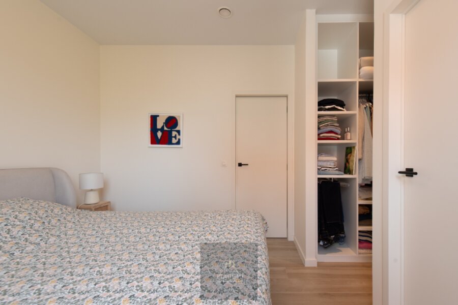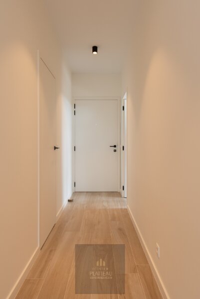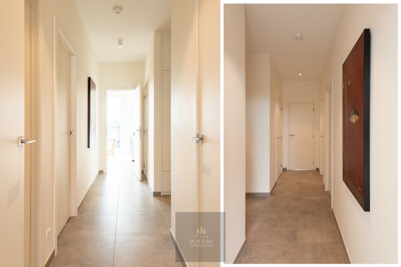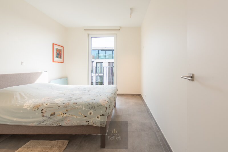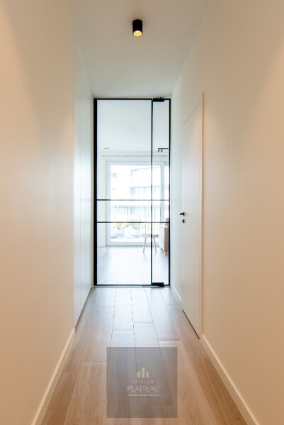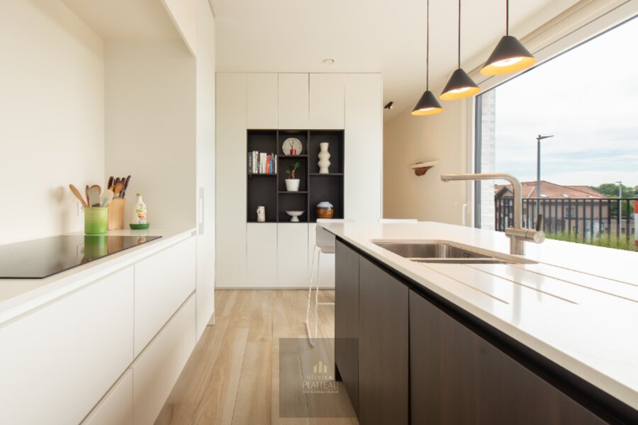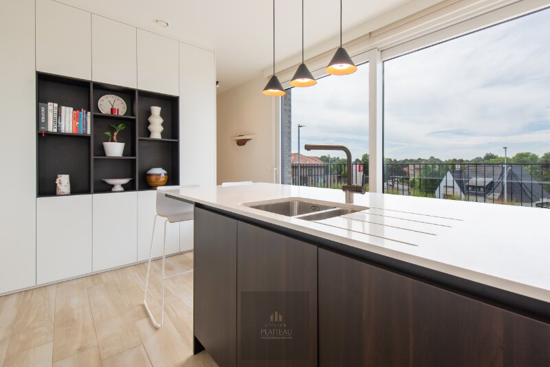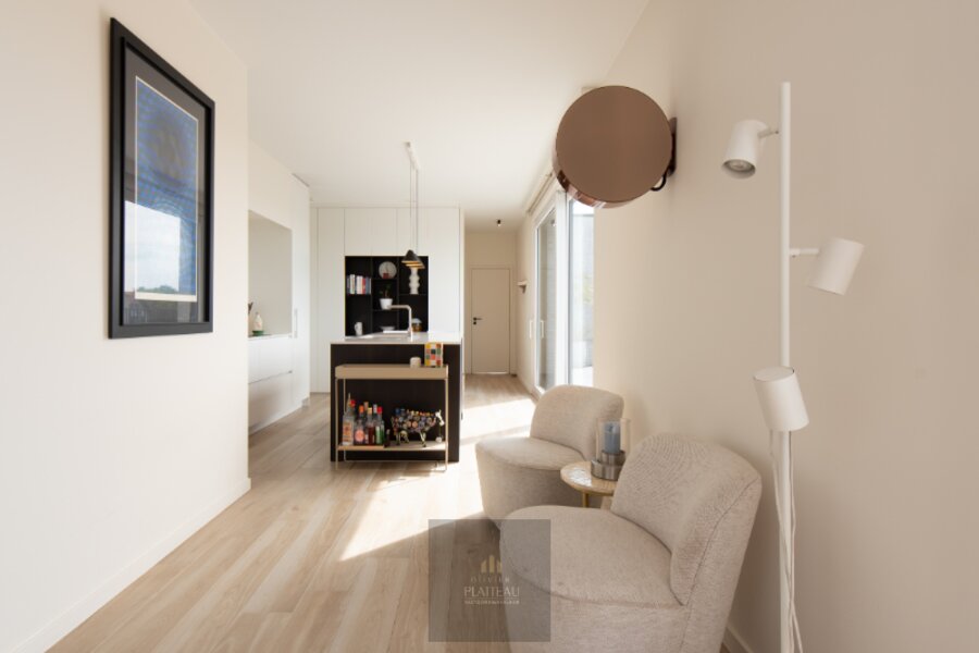 De lichtrijke leefruimte met open keuken vloeit naadloos over in het terras en vormt het kloppende hart van deze woning. Dankzij vloerverwarming en elektrisch gestuurde zonnewering heerst er steeds een aangenaam binnenklimaat. Het appartement is uitgerust met een warmtepomp, ventilatiesysteem type D en maar liefst 24 privatieve zonnepanelen, wat bijdraagt tot de energieneutraliteit van het geheel. De regenwateropvang van 8000 liter met automatisch bewateringssysteem voor de geïntegreerde plantenbakken onderstreept het ecologische karakter van dit unieke pand.