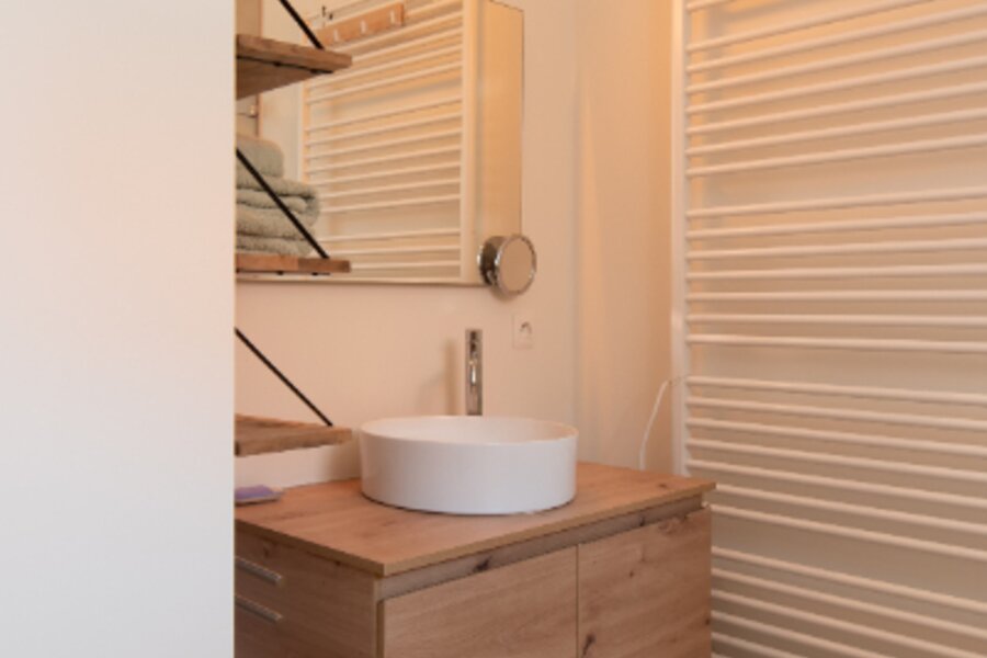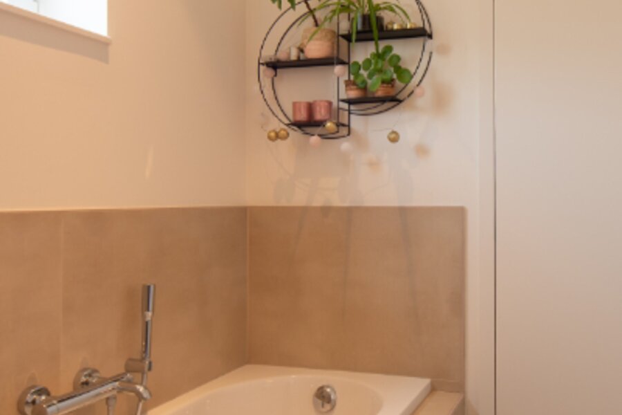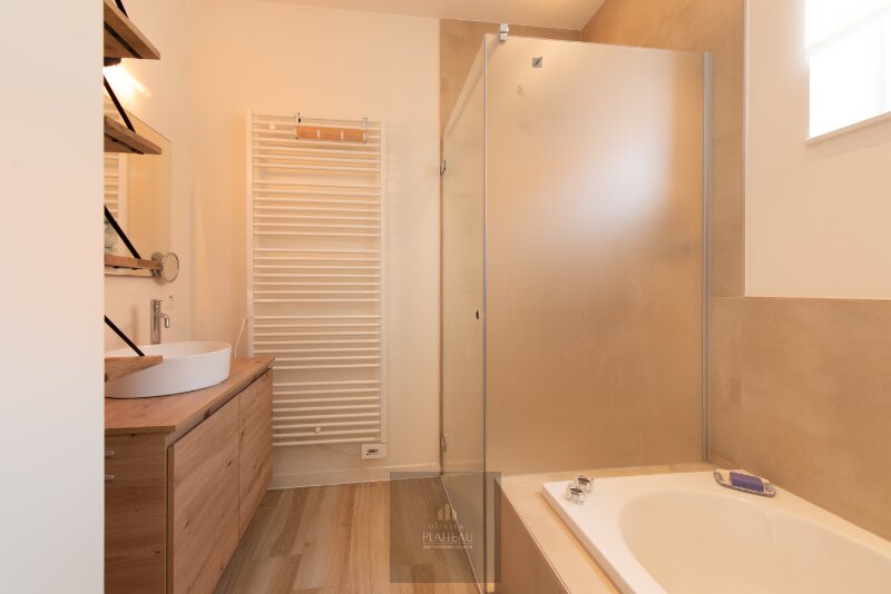 De master bedroom beschikt over een eigen badkamer met ligbad, inloopdouche en dubbele wastafel. Daarnaast is er nog een tweede badkamer met inloopdouche en extra toilet, alsook een praktische technische ruimte met wasplaats. Bewegingssensoren zorgen voor automatische verlichting in onder andere de toiletten, nachthal, technische ruimte, kelder en garage.