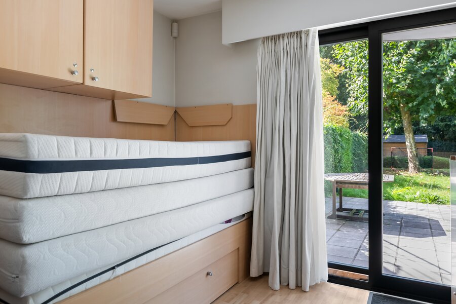 De eerste verdieping is volledig ingericht als leefruimte. Hier treft u een aparte keuken, een apart toilet en een lichtrijke woonkamer die uitgeeft op een gezellig terras met zicht op groen en toegang tot de tuin.