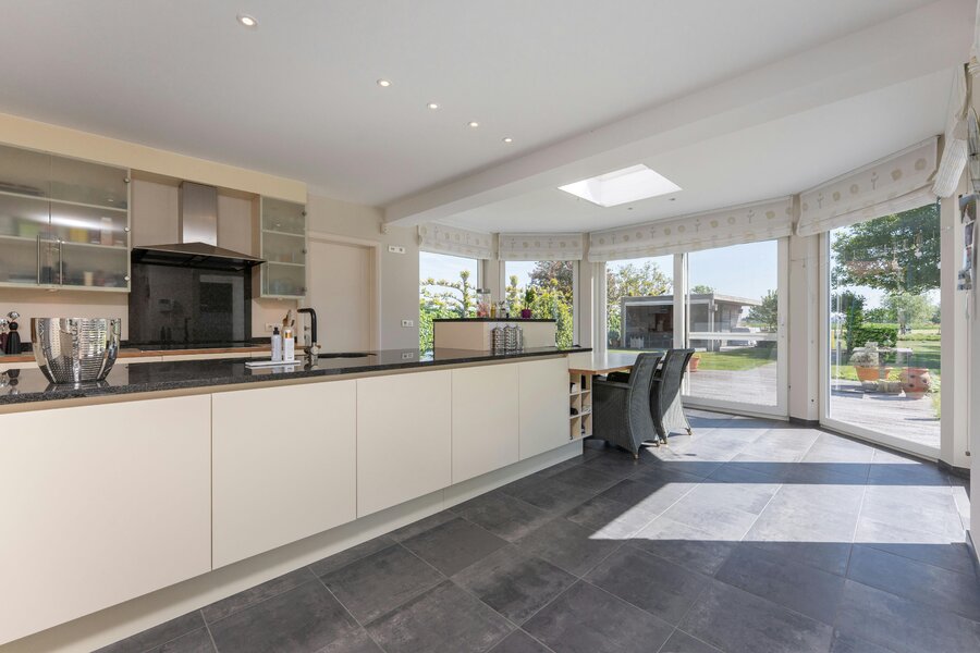 - open keuken met eetplaats en zicht op tuin