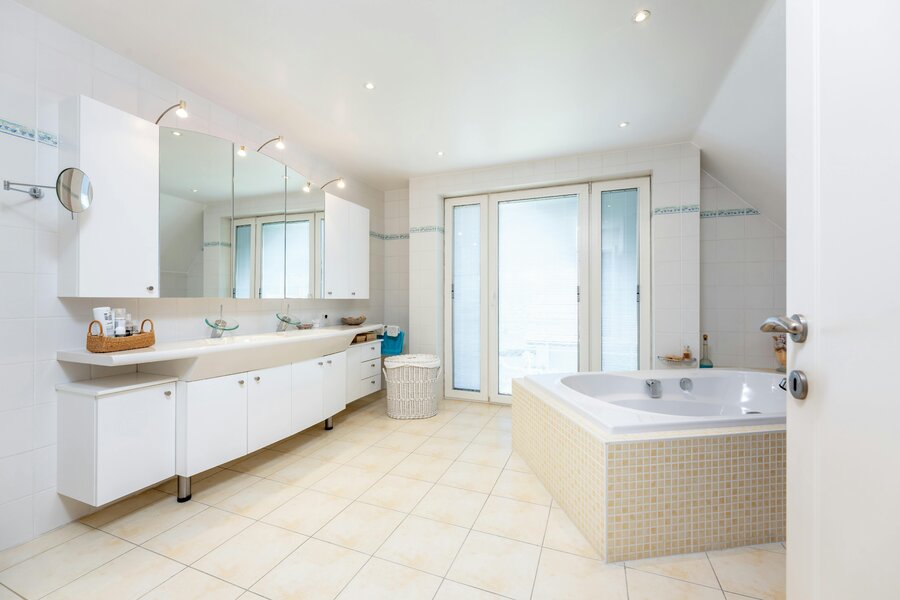 - badkamer bestaande uit dubbele wastafel, ligbad, douche en sauna