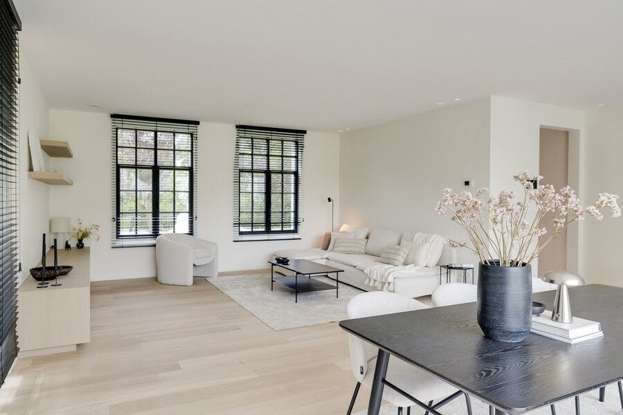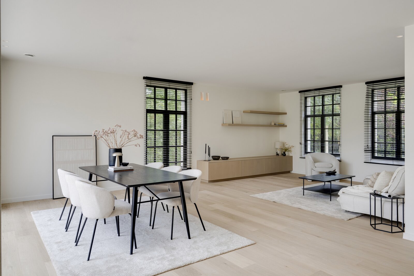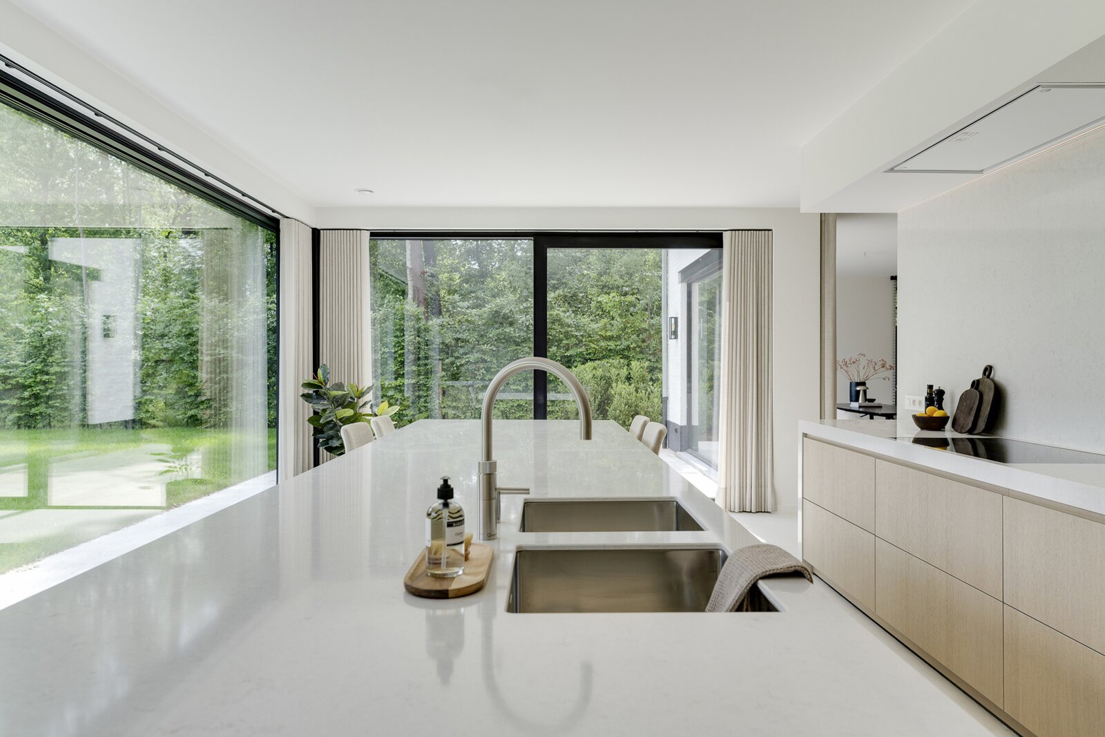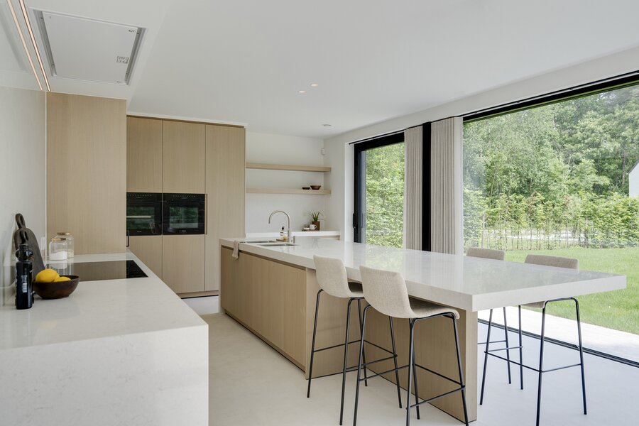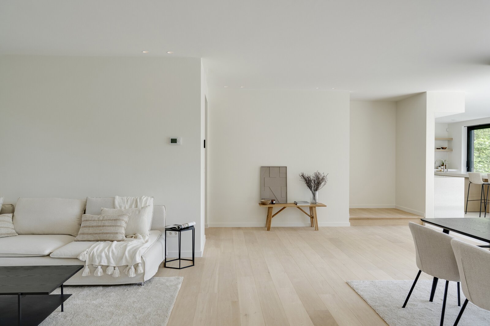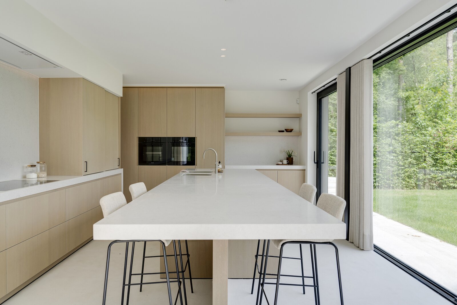 De ruime woonkamer met veel lichtinval van 53m² op parket sluit naadloos aan op de moderne eet-leefkeuken van 35m², voorzien van Coproxvloer, een stijlvol kookeiland en een prachtig uitzicht op de tuin.