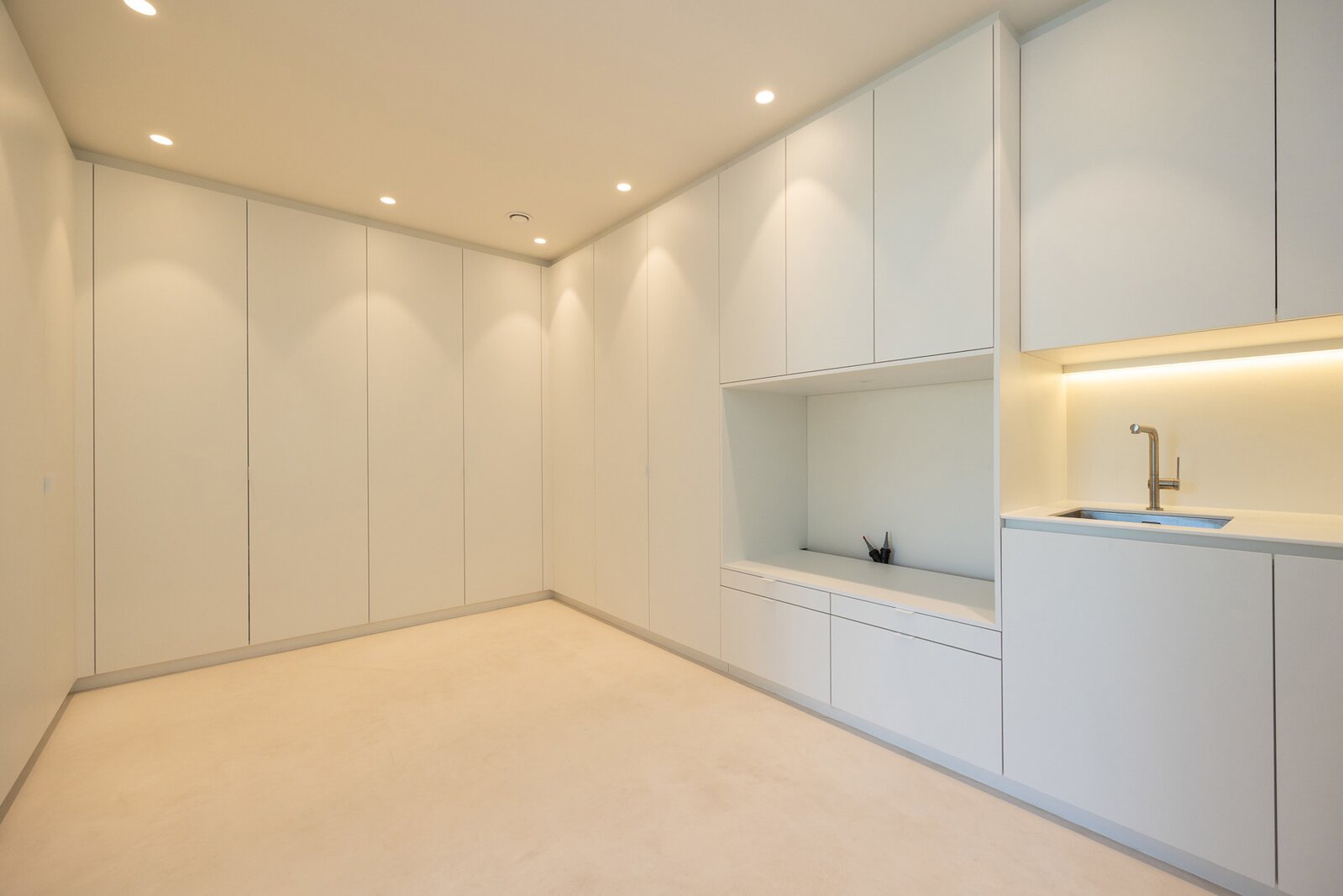 Zeer ruime en praktische wasplaats/bijkeuken 20m² met ingemaakte kasten en aansluitingen voor wasmachine en droogkast.