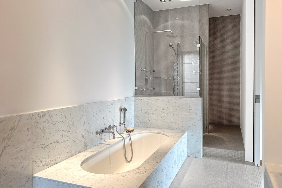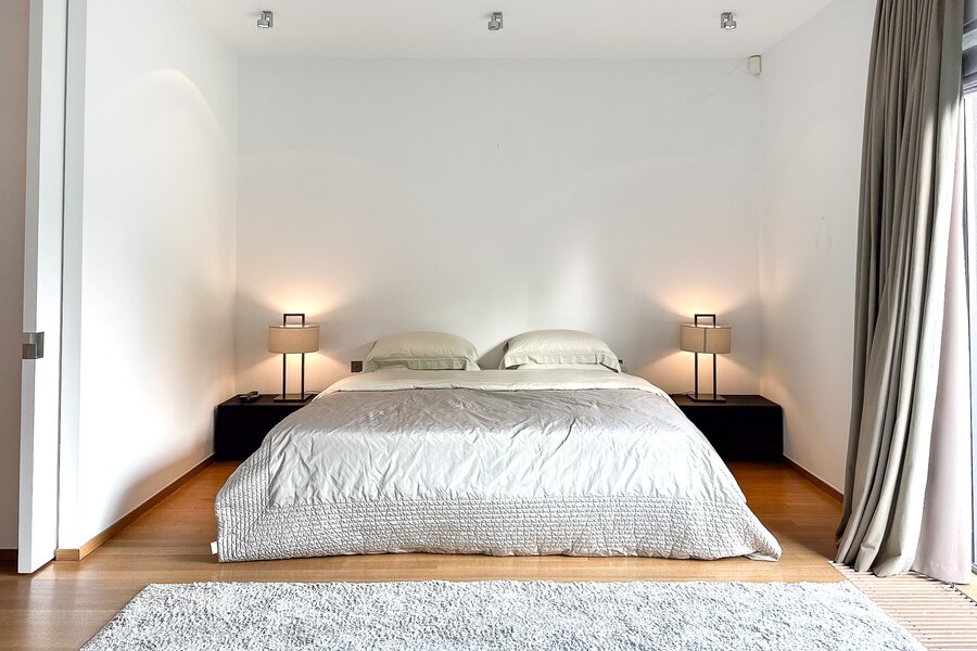 De bovenverdieping herbergt een ruime oudersuite van 60 m², inclusief een kleedkamer en een privébadkamer, die een serene toevluchtsoord biedt. Twee en-suite slaapkamers, elk met eigen badkamer, en twee extra slaapkamers die een badkamer delen, garanderen comfort en privacy. Een prachtig terras van 100 m² bekroont de verdieping en nodigt uit tot ontspanning in de buitenlucht.