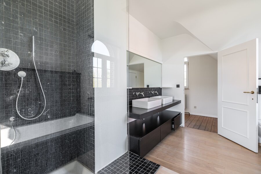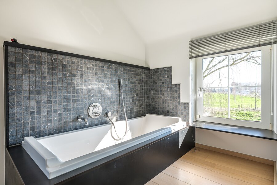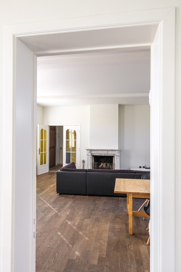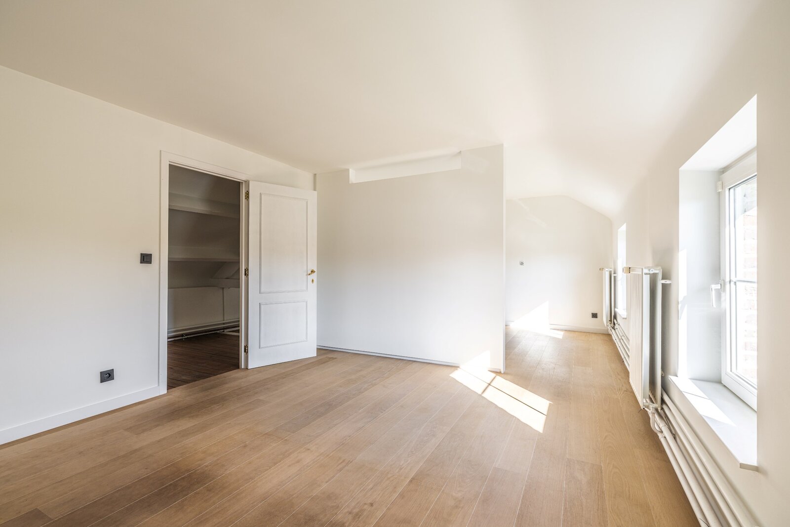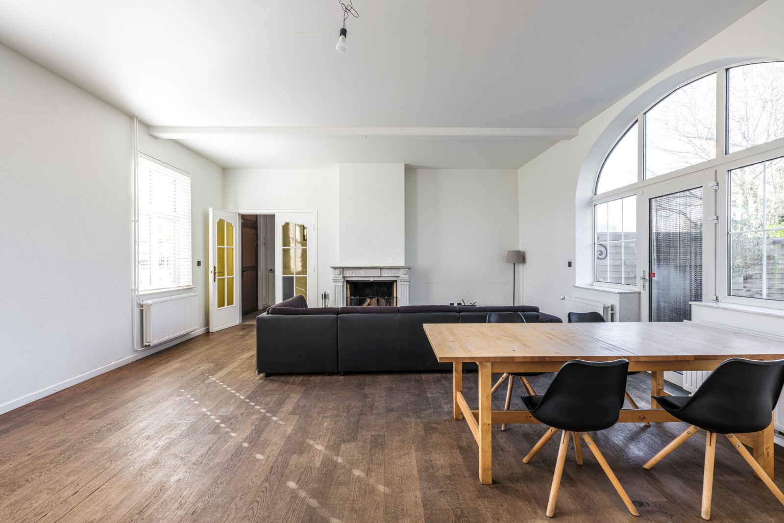 De ruime en lichtrijke leefruimte met marmeren schouw heeft een open haard wat de ruimte die extra gezellige touch geeft. Aansluitend is er de te renoveren keuken met naastliggende technische berging. Zowel de leefruimte als naastliggende ruimtes hebben een vlotte toegang tot de tuin/terras. Er zijn visualisaties beschikbaar met de verschillende mogelijkheden. Aan de linkerzijde van de trapzone is er het "kantoor"gedeelte. Hier zijn verschillende invullingen mogelijk. Op de bovenverdieping zijn minimaal 3 ruime slaapkamers en een mooi uitgeruste en grote badkamer voorzien. De mastersuite heeft nog aansluitend een ruime dressing. Idem wat betreft de andere slaapkamer aan de linkerzijde van het pand. Met de zone in de torenkamer zijn er ook nog verschillende andere invullingen mogelijk. Deze is bereikbaar met een volwaardige trap.