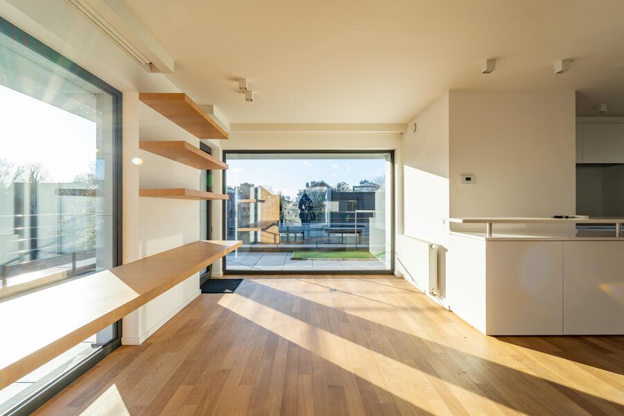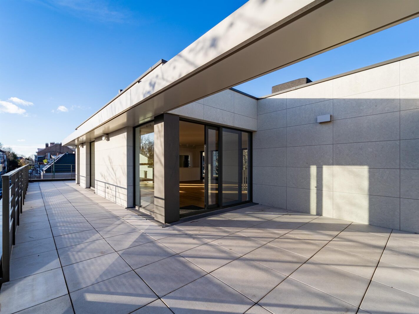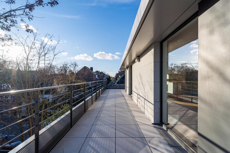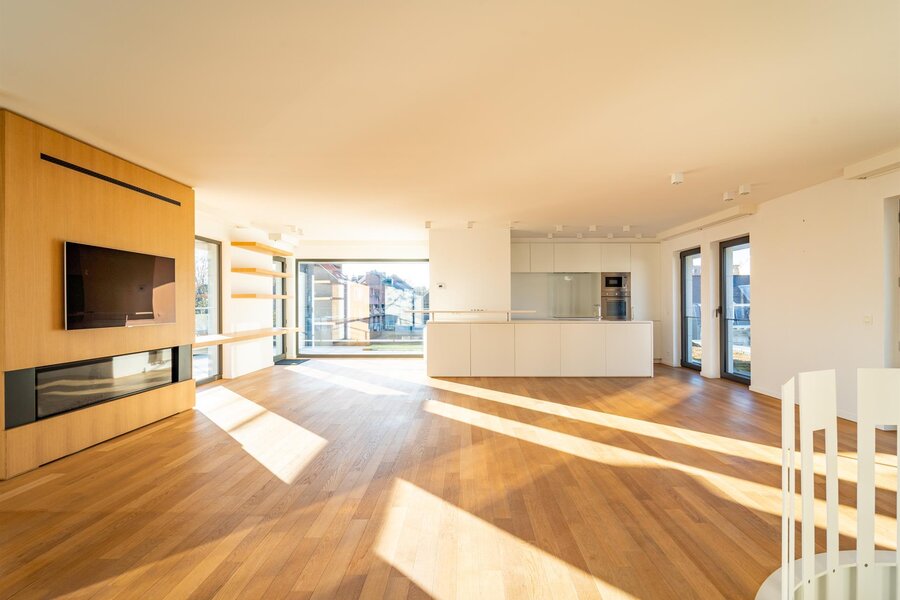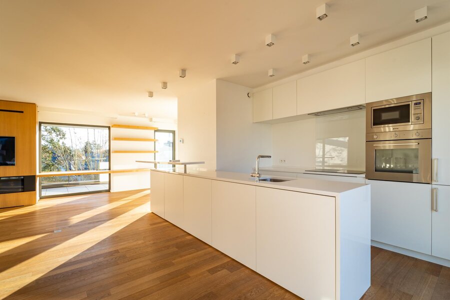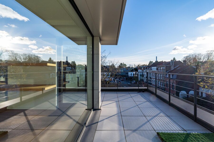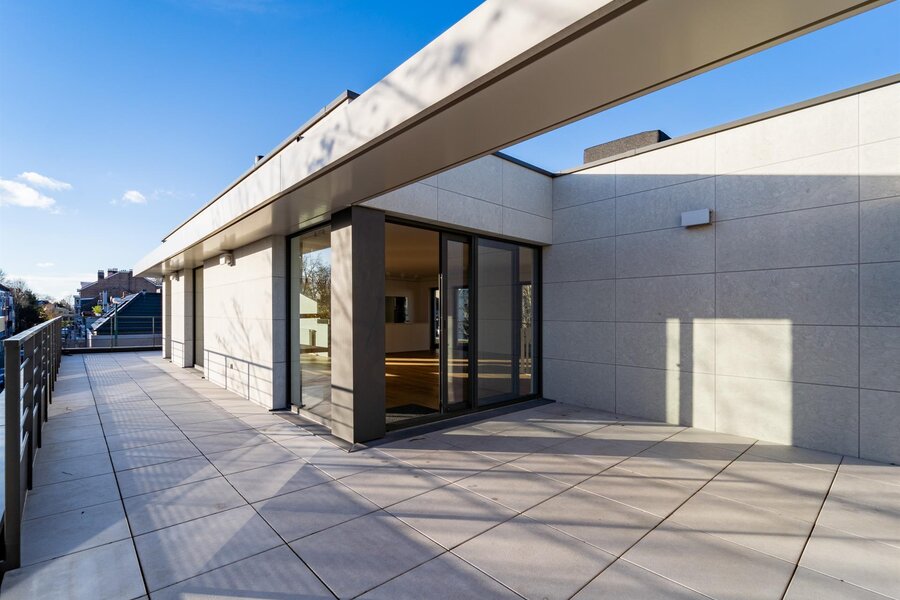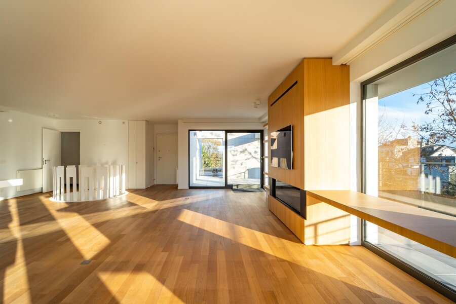 Gelegen in de wijk Vert Chasseur en op een steenworp afstand van het Ter Kamerenbos, biedt dit duplex penthouse met drie slaapkamers een bruto vloeroppervlakte van ± 185 m² (EPC) en een terras van ± 50 m² op het zuidoosten.