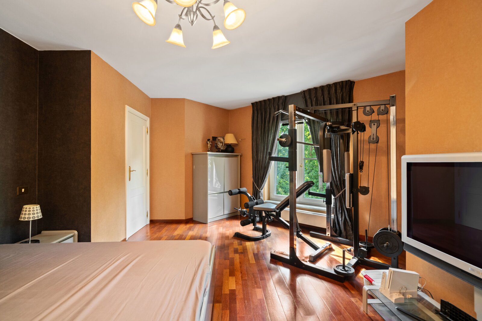 De woning biedt een ruime inkomhal met vestiaire en gastentoilet. De lumimieuze leefruimte met gezellige open haard geeft via verschillende raamdeuren rechtstreeks uit op het terras. De ingerichte keuken met ontbijthoek biedt een prachtig uitzicht over de tuin en heeft toegang tot berging. Eveneens op het gelijkvloers een bureau en een dubbele inpandige garage.