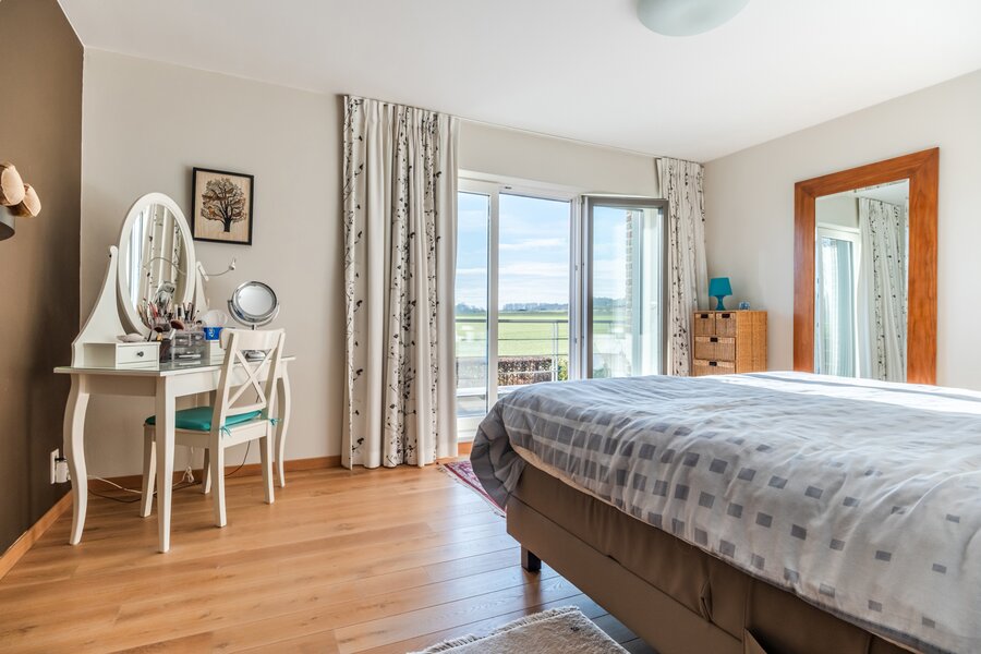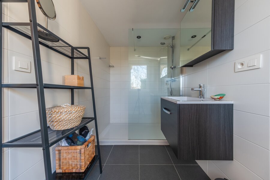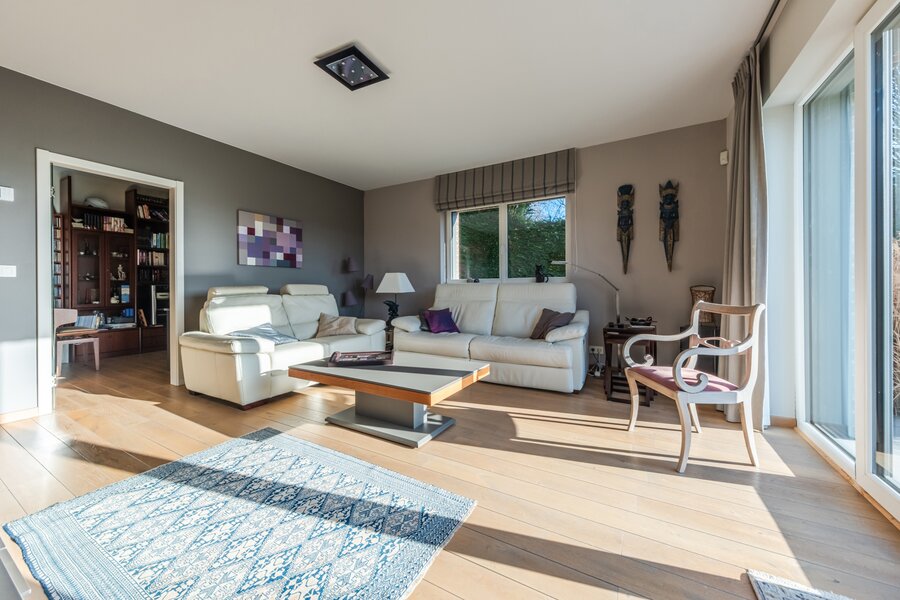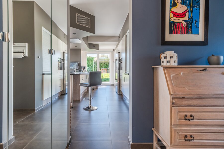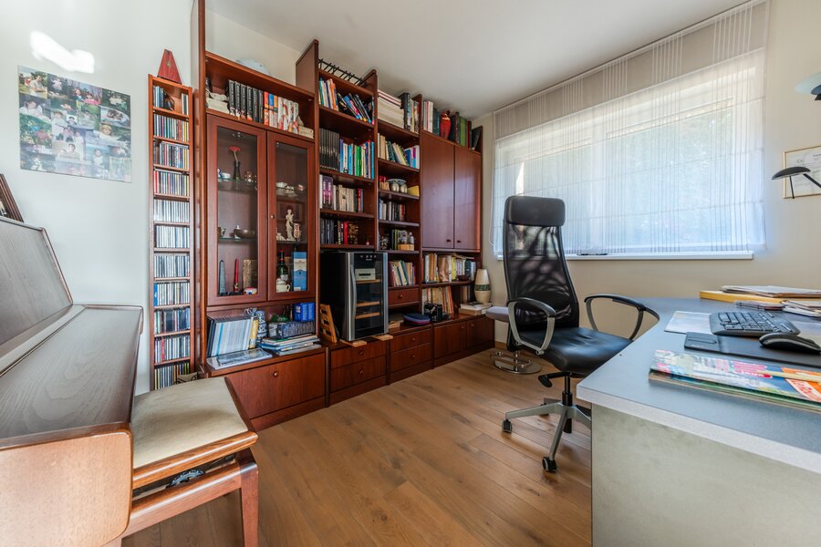 Op het gelijkvloers leidt een inkomhal met vestiaire en toilet naar een mooie leefruimte van ± 50 m² met keuken en eetkamer, aangevuld met een achterkeuken/wasruimte met rechtstreekse toegang tot de garage. Aan de andere kant bevinden zich een lichtrijke woonkamer en een ruime bureauruimte, ideaal voor thuiswerk.