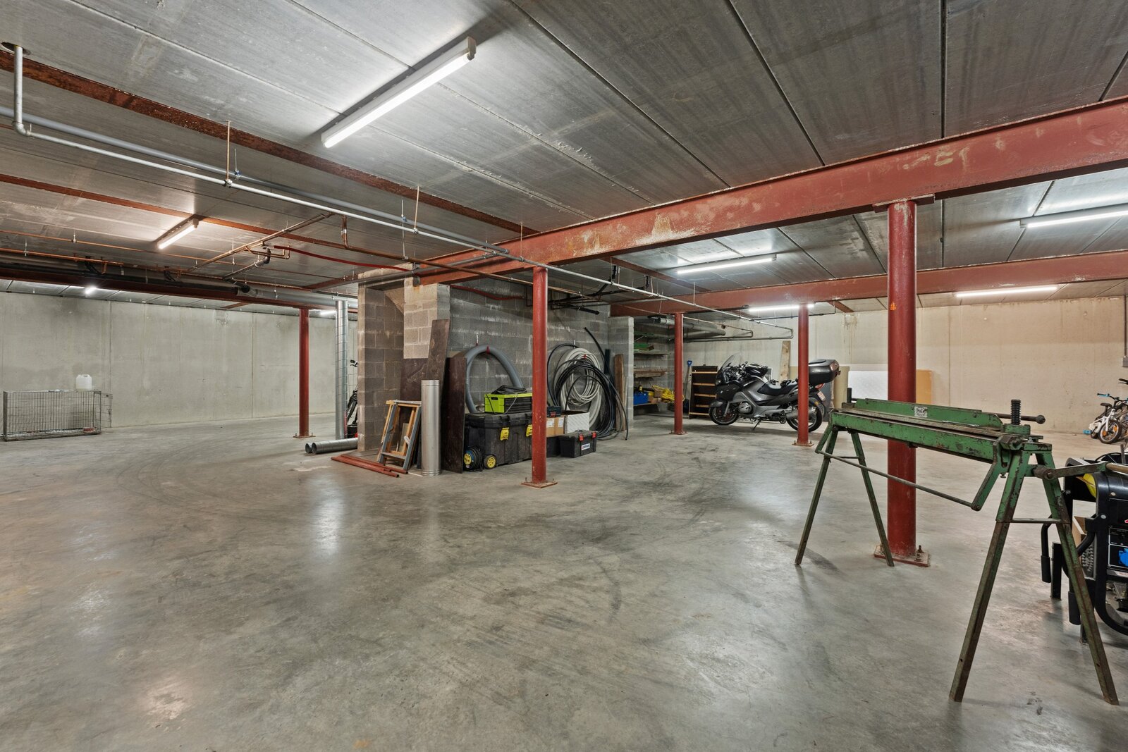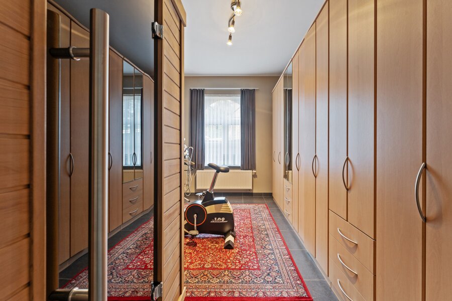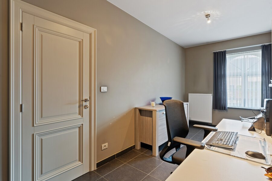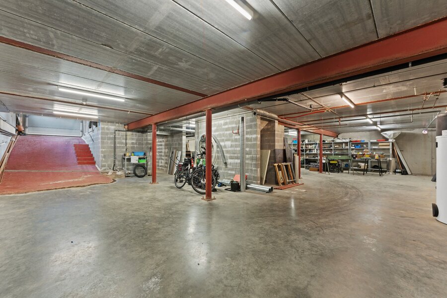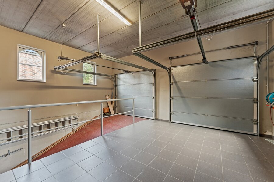 Kelder en garages: volledig onderkelderd en eenvoudig toegankelijk via de inpandige dubbele garage (waarvan één poort toegang biedt tot de kelder). Achteraan het perceel bevindt zich nog een bijkomende garage. Deze indeling maakt de woning ook geschikt voor zelfstandigen.