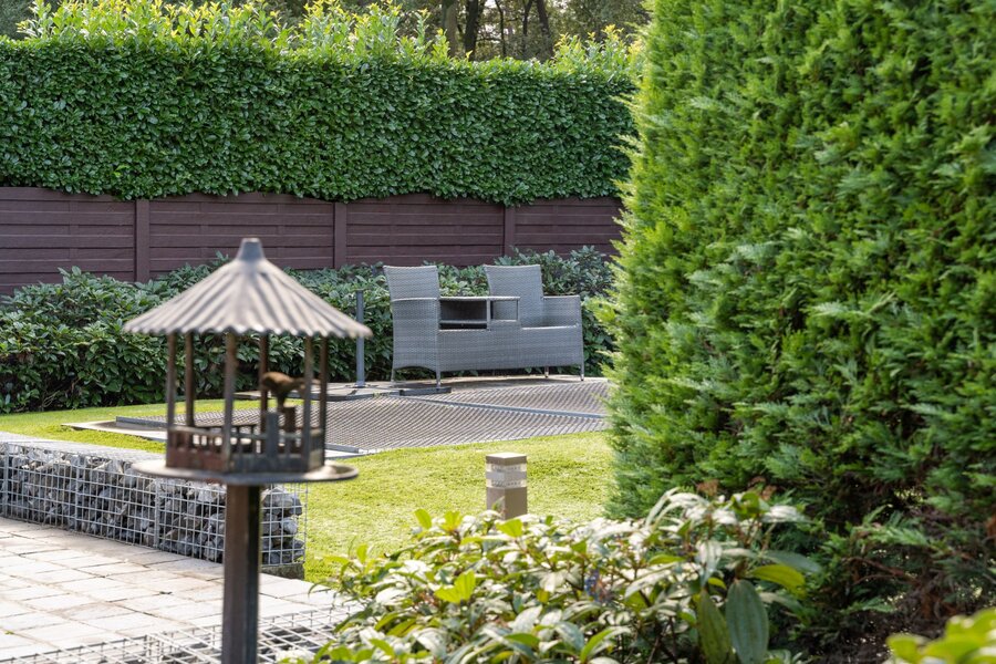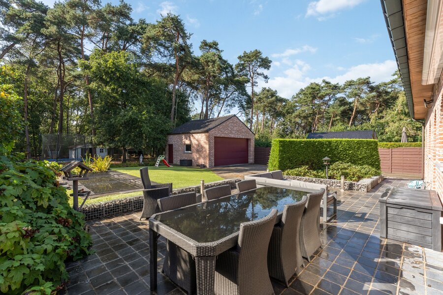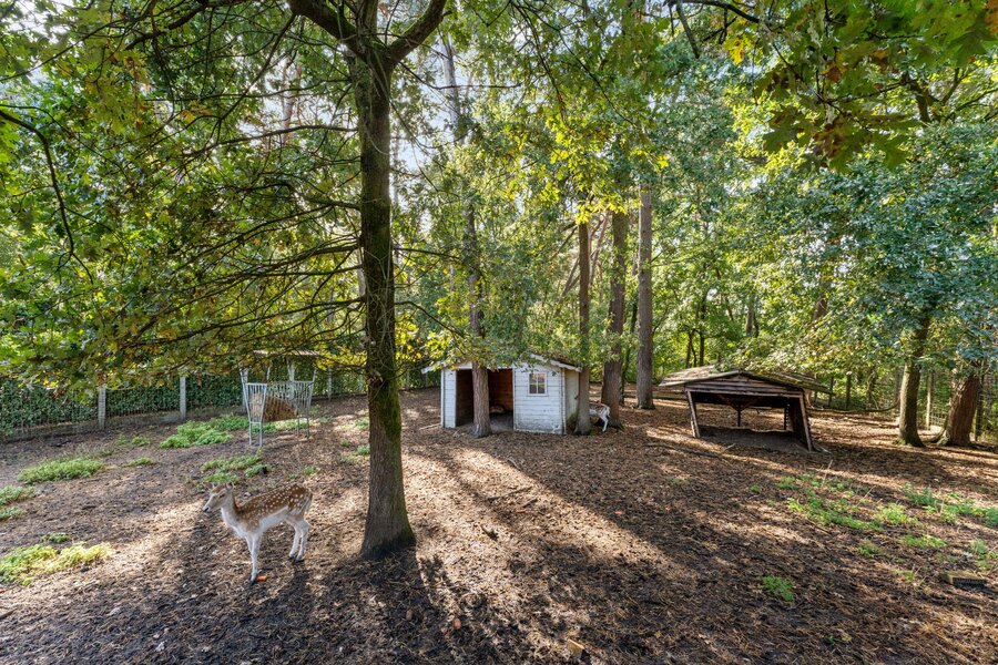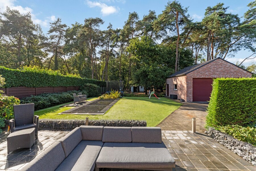 Tuin: volledig omheind perceel met toegangspoort; westgericht terras met zonneluifel; vijver; uitzicht op het achterliggend beschermd Philipsbos.