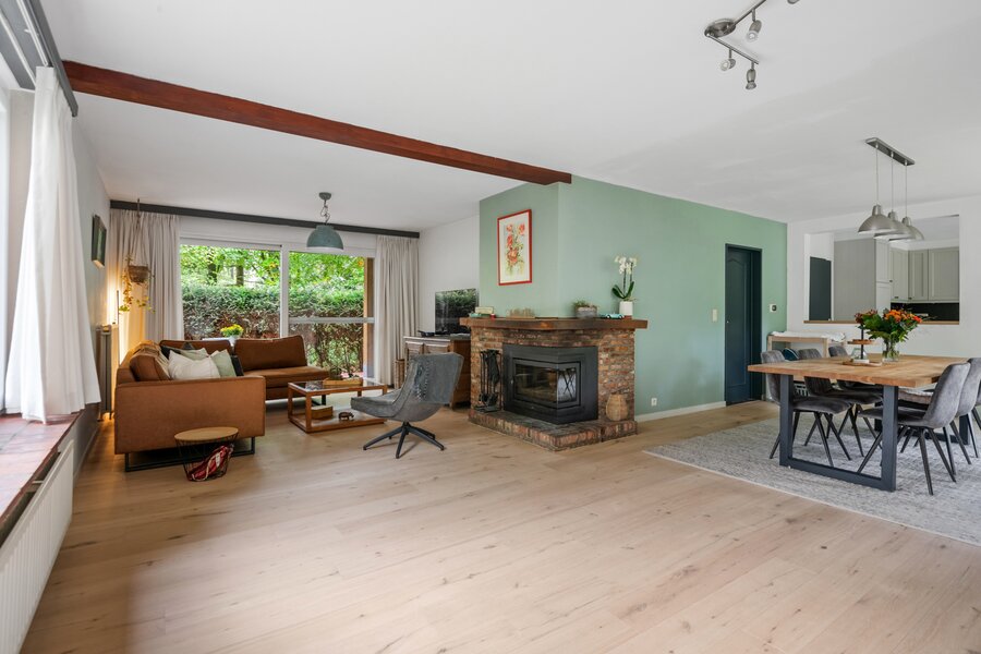 De lichtrijke leefruimte op parketvloer is ingedeeld in een open eetkamer en een gezellige zithoek, voorzien van een vernieuwde houtkachel. Grote raampartijen zorgen voor een mooi zicht op de tuin en terrassen aan zowel de voor- als achterzijde.