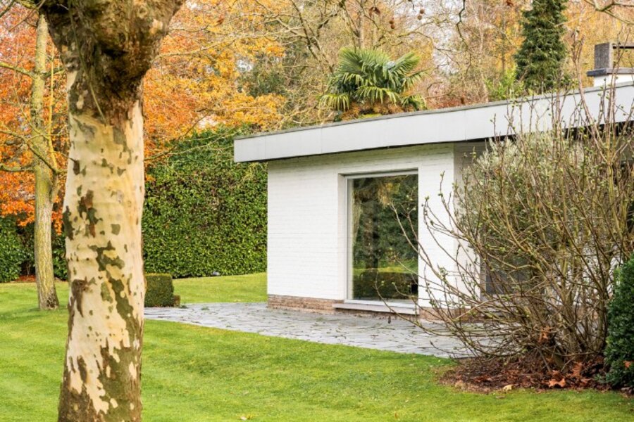 Buiten vinden we nog 2 bijgebouwen: een tuinhuis verscholen achter de bomen en rechts achter de woning een ruime berging/houtopslag.
