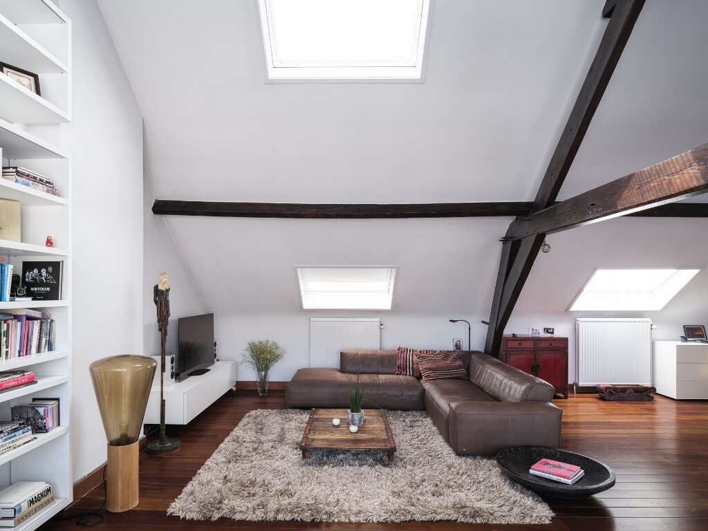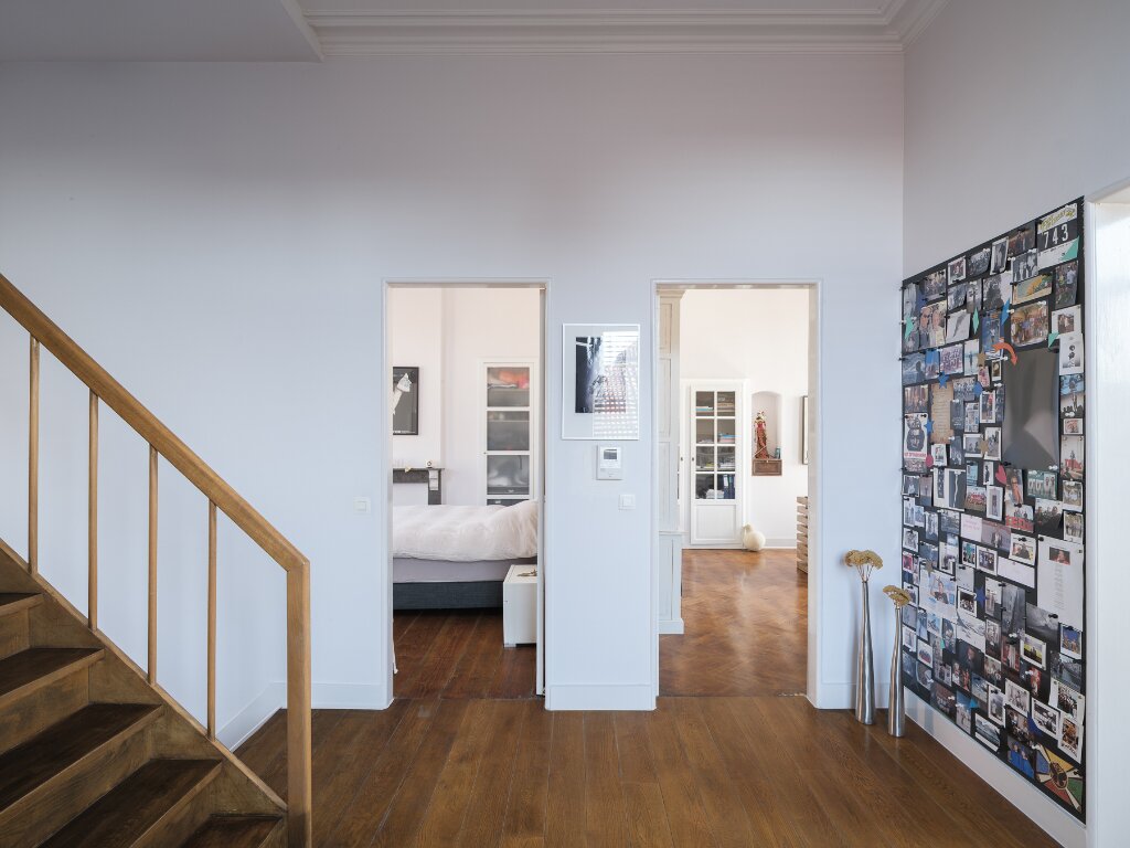 Hoge plafonds, originele plankenvloeren en houten ramen geven dit appartement een bijzondere charme en uitstraling.