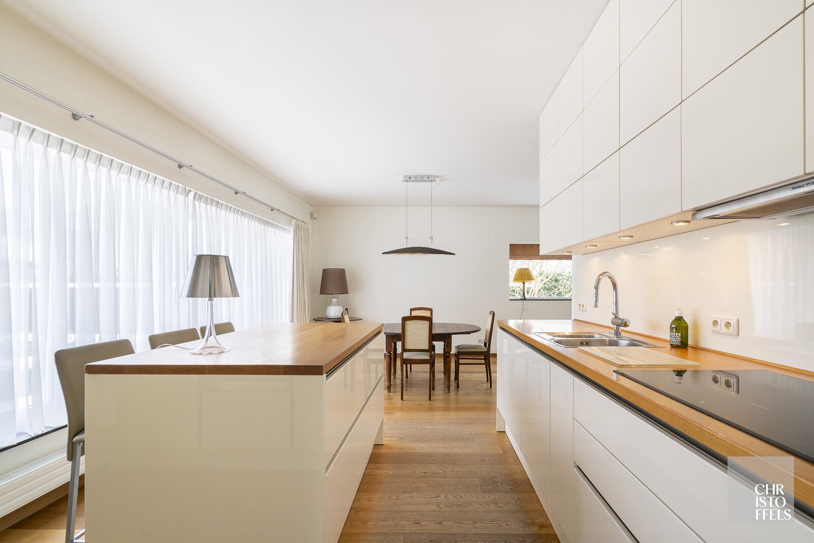 De open, greeploze keuken is uitgerust met een kookeiland, inductiekookplaat, dubbele spoelbak, afzuigkap, vaatwasser, oven, koelkast en inbouwspots in de keukenkasten.