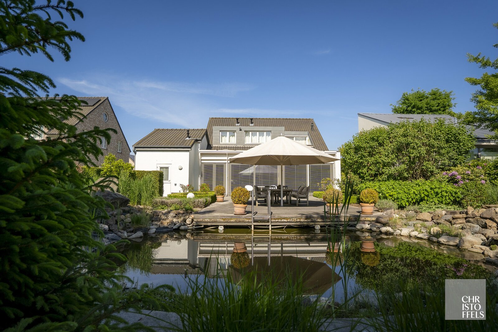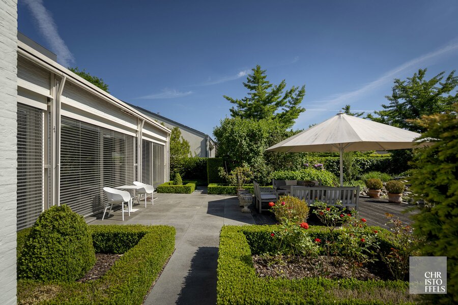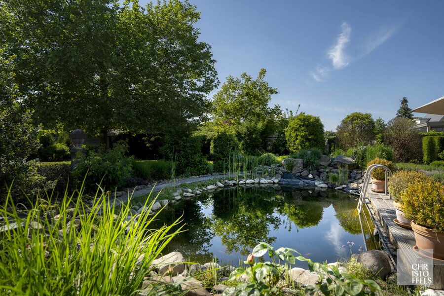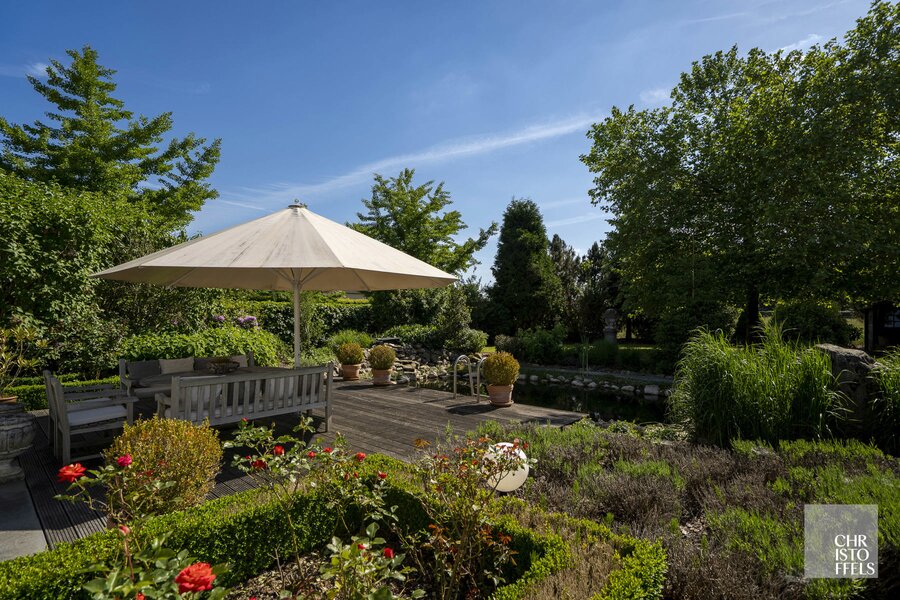De verzorgde tuin is volledig omheind en biedt door de groene beplanting volledige privacy. Daarnaast beschikt de tuin over een zwemvijver, een ruim terras en een tuinhuis.
