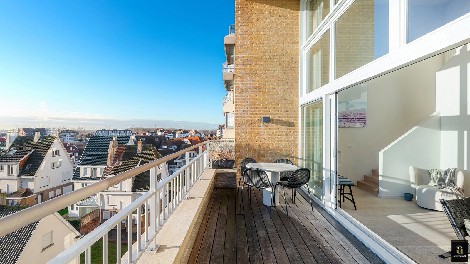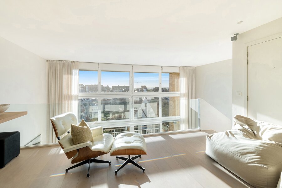 Zesde verdieping: inkom, brede en lichtrijke leefruimte met grote raampartijen en toegang tot het brede zuidgerichte terras ( 2 meter breed) met open zicht over de villawijk, quasi geen inkijk, moderne open keuken voorzien van alle Miele toestellen. Achteraan op het leefniveau bevinden zich twee ruime slaapkamers uitgevend op een achterterras, een grote badkamer met inloopdouche en een dressing (welke ook kan dienst doen als voorraadkamer of extra berging). Gastentoilet apart.