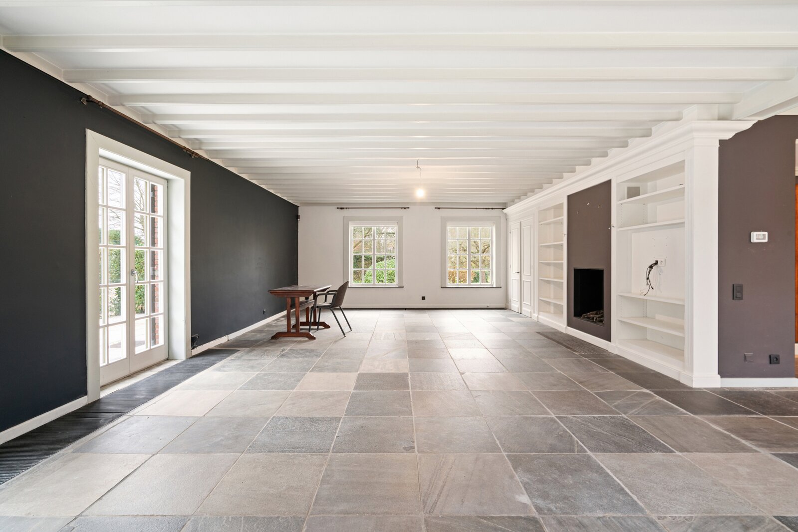 Via de brede inkomhal met vestiaire en gastentoilet kom je in de lichtrijke L-vormige leefruimte, afgewerkt met natuursteen, een ingebouwde gashaard en maatwerk dat voor rust en verfijning zorgt. De vele ramen bieden een mooi zicht op de tuin en geven directe toegang tot het ruime terras.