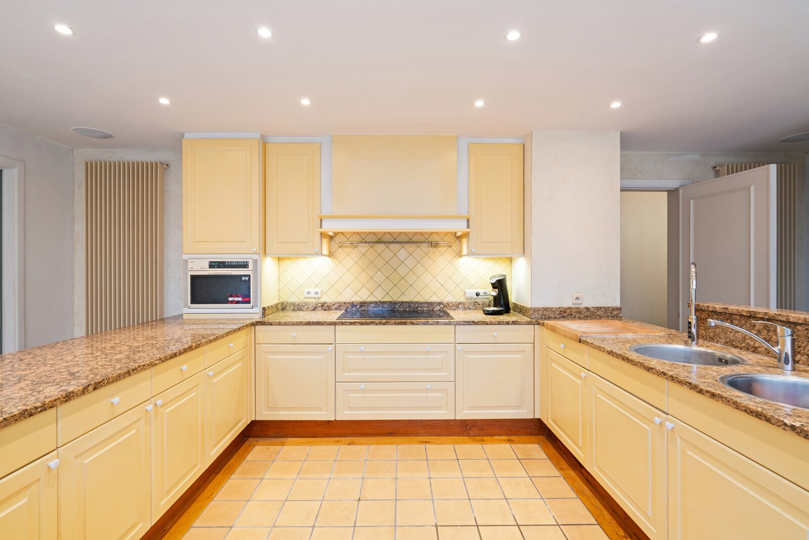 Aansluitend ligt de smaakvol ingerichte keuken met natuurstenen werkbladen, massief parket en een gezellige erker met eetplaats die uitkijkt over het groen.