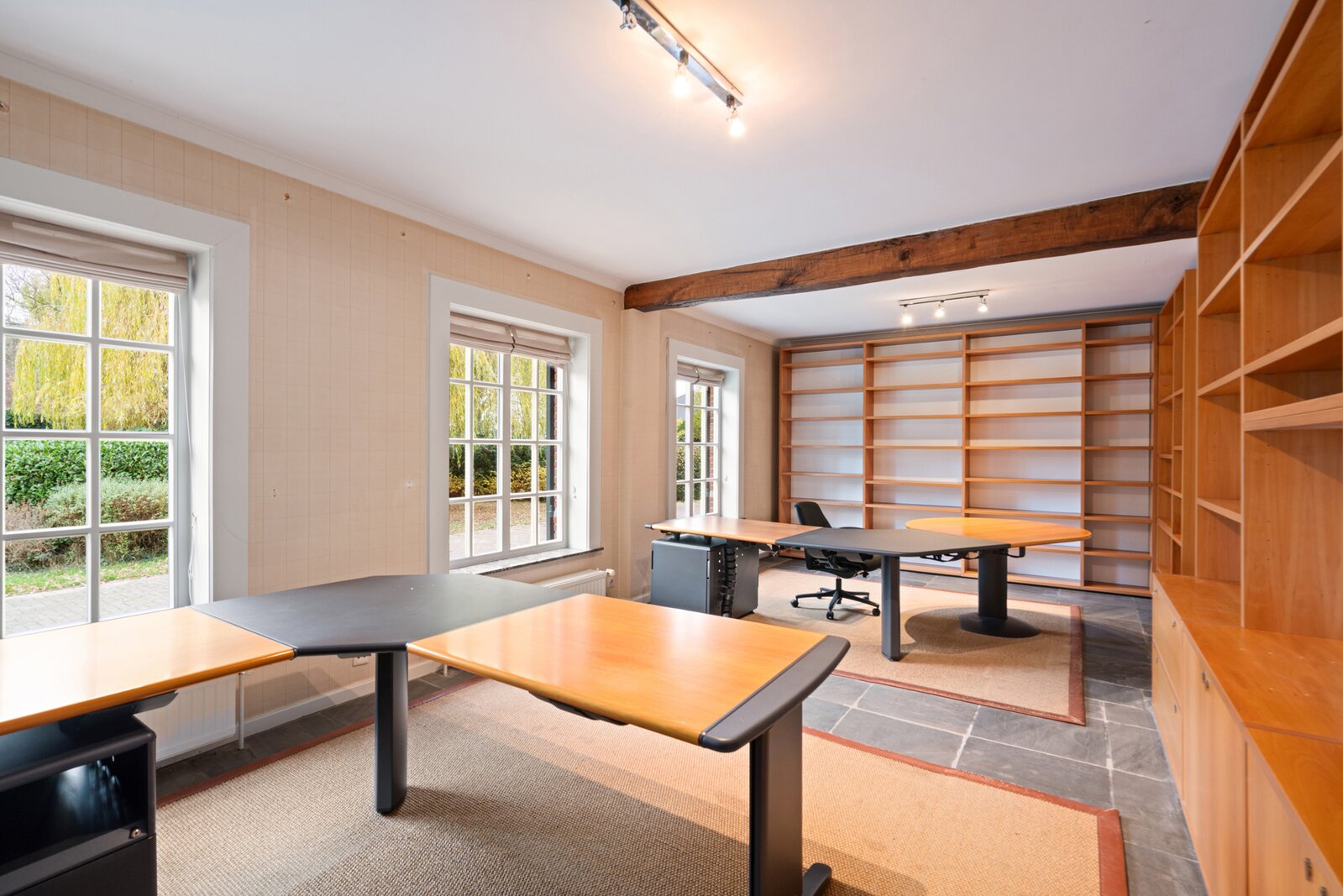 Op het gelijkvloers bevindt zich bovendien een royaal bureau van 31m² met aansluitend een kantoorruimte van 41m², uitgerust met airco. Deze vleugel biedt ideale mogelijkheden voor een praktijk, vrij beroep of werkruimte aan huis.