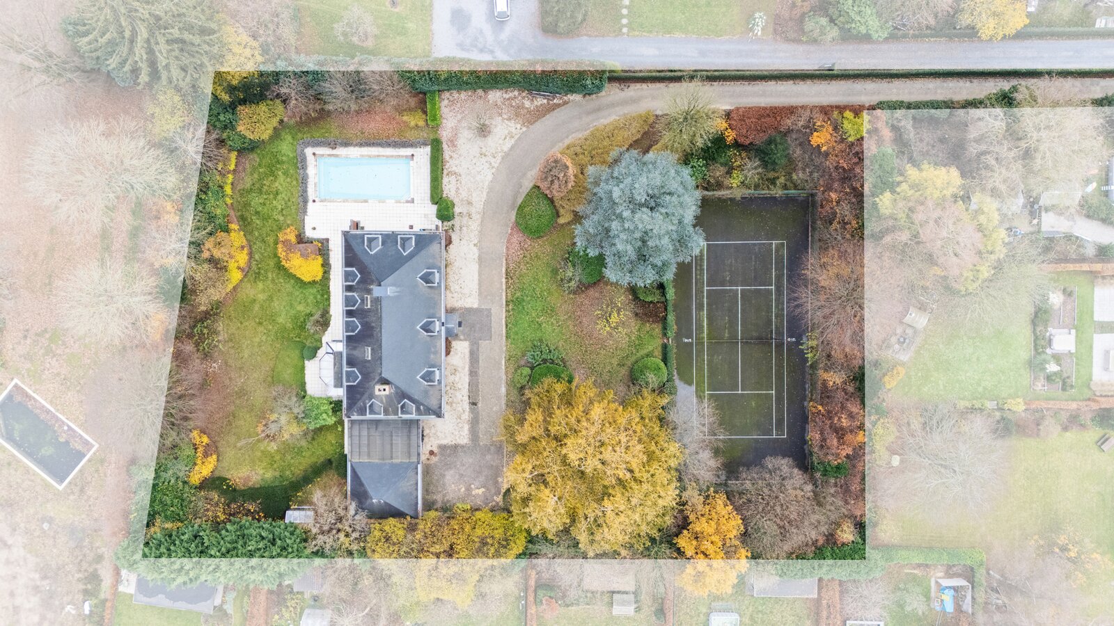 Stijlvolle villa (584 m²) met 7 kamers, 2 dressings, bad- en douchekamer, bureau + kantoor, dubbele garage, zolder, kelder, groot terras met zwembad en een mooie parktuin met tennisveld op een perceel van 51a 14ca gelegen op een locatie met veel privacy te Herent.