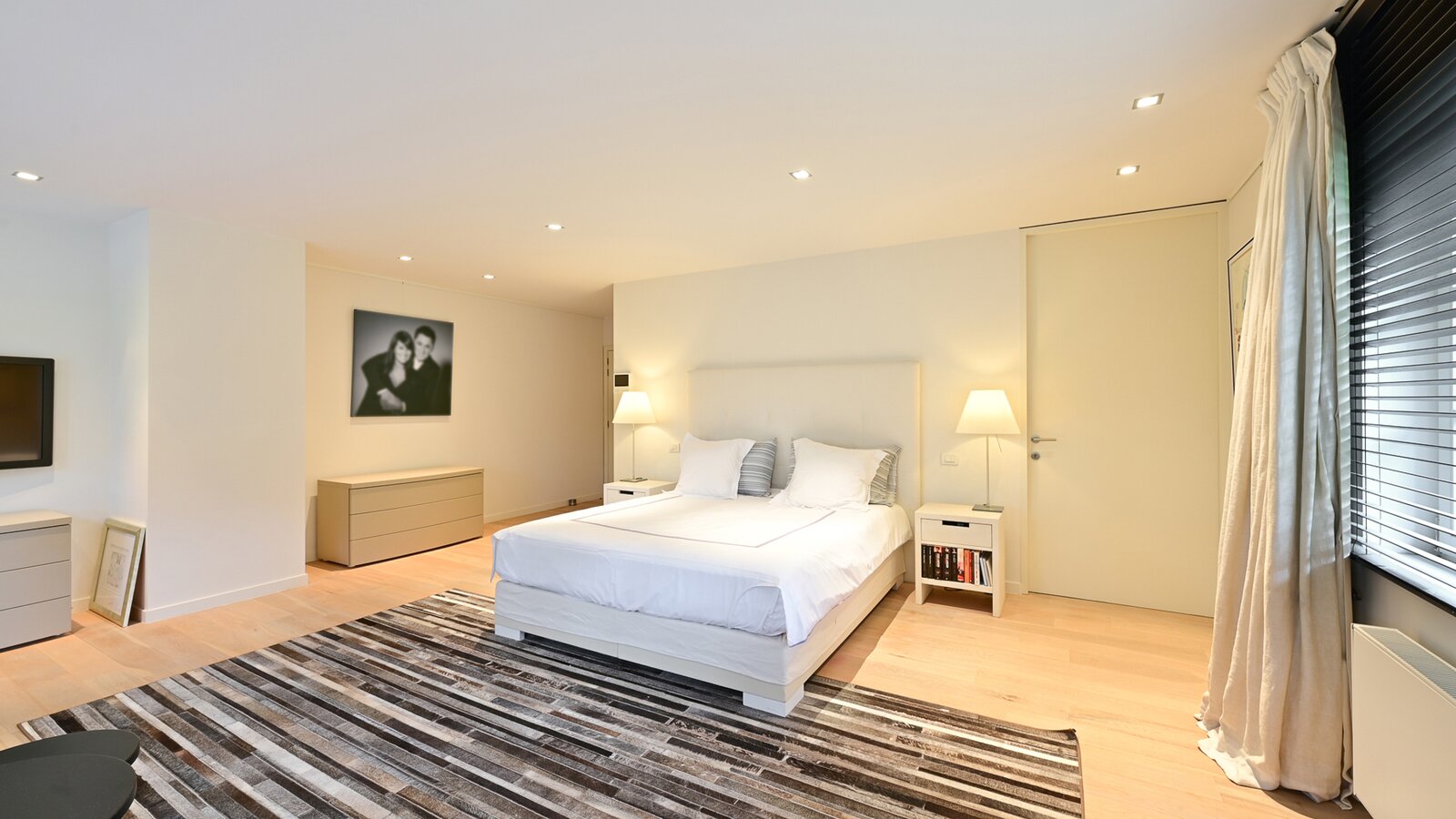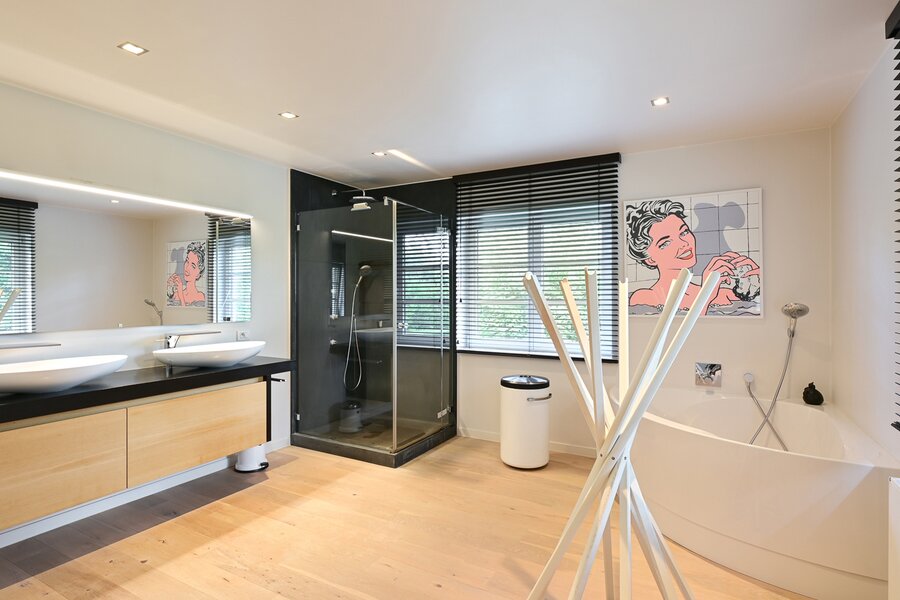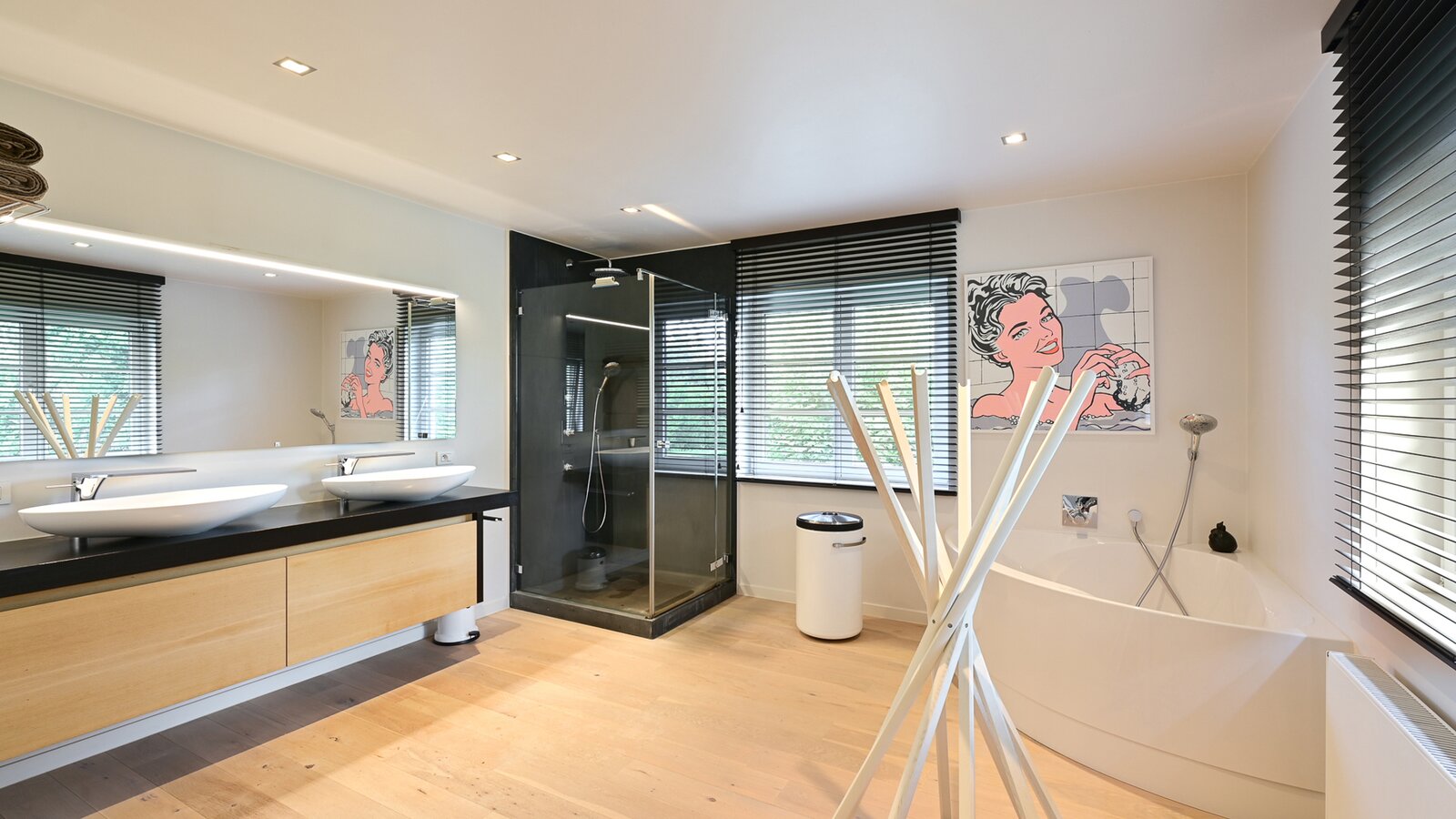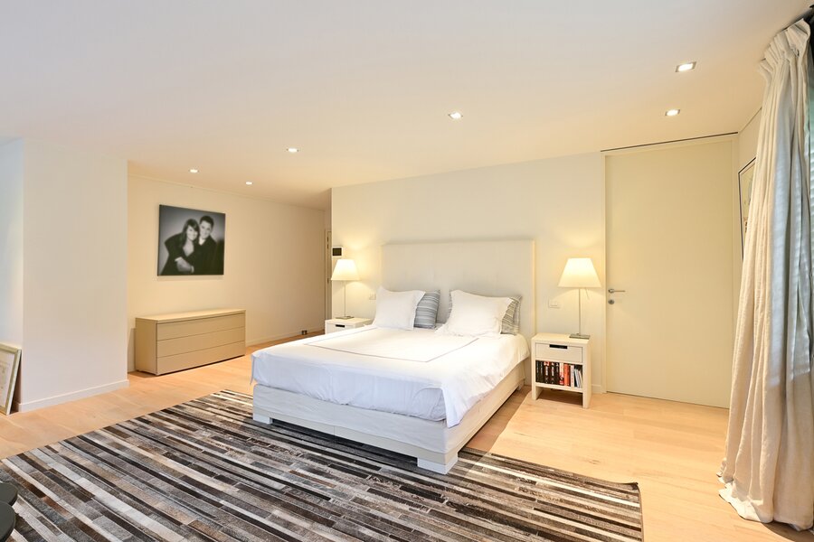 Op de 1e verdieping bevindt zich de hoofdslaapkamer met volledig uitgeruste badkamer (inloopdouche, ligbad, dubbele lavabo en apart toilet). De hoofdslaapkamer beschikt tevens over een eigen dressing. Tweede en derde slaapkamer, elk voorzien van een douchekamer (douche en lavabo) en uitgevend op aangenaam terras met zicht op de tuin. Vierde volwaardige slaapkamer, voorzien van een privatieve badkamer (ligbad met douche-element en lavabo en apart toilet).