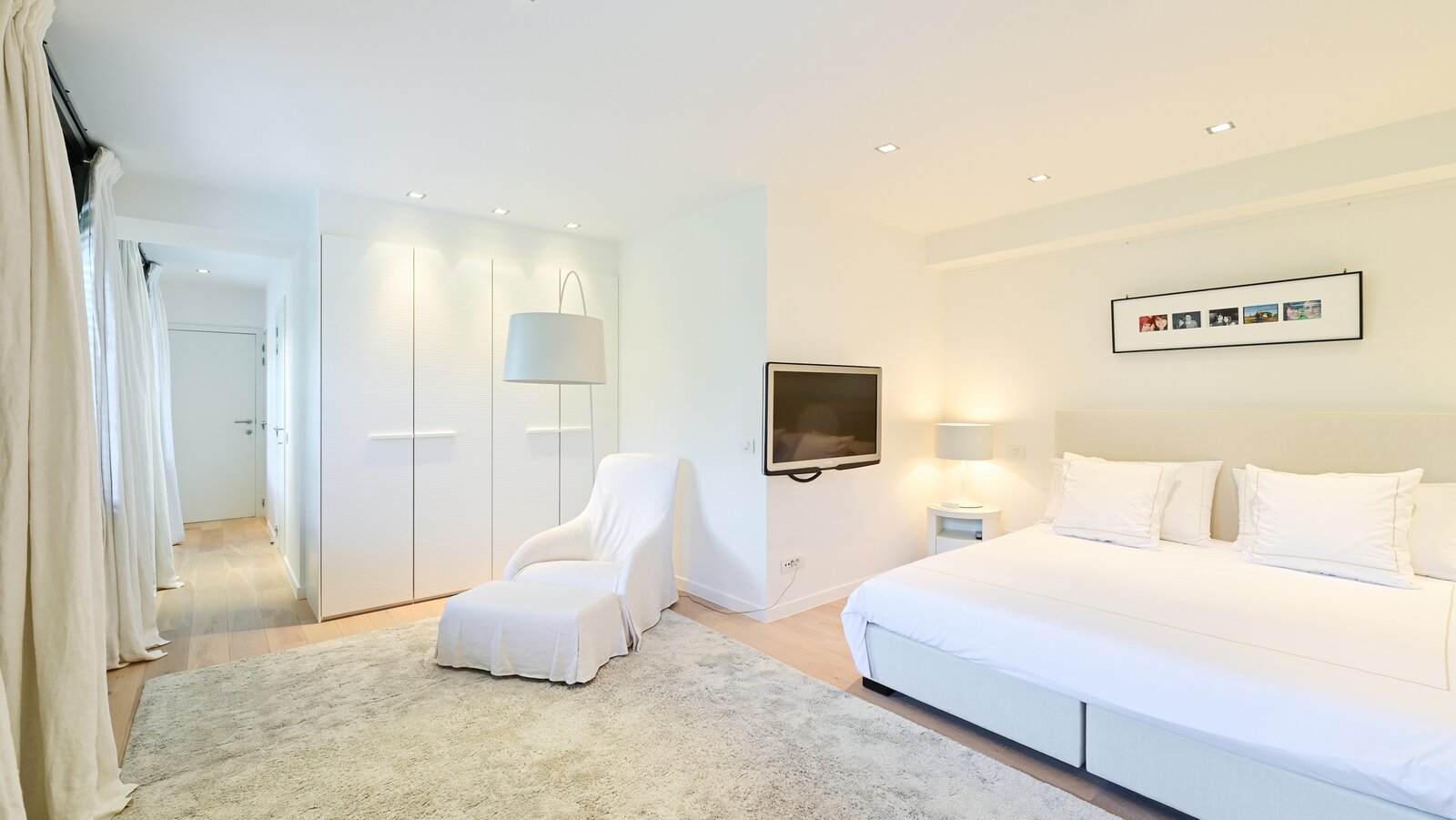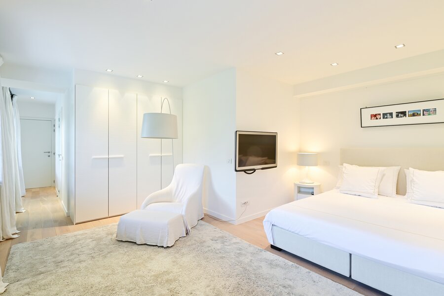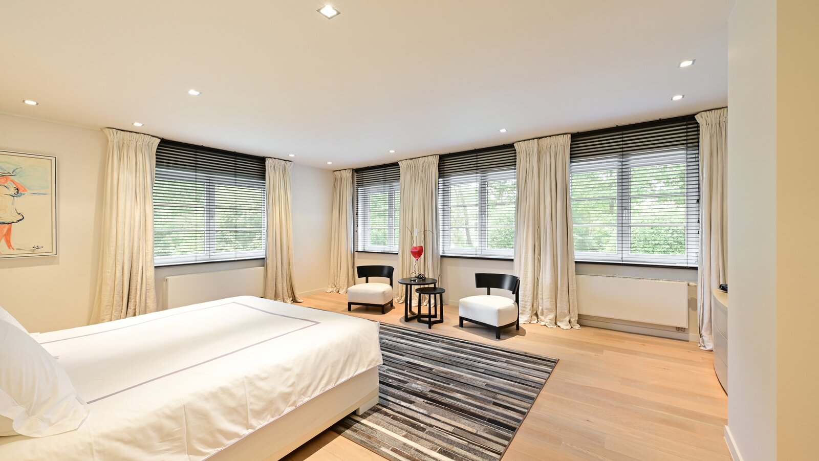 Op de 1e verdieping bevindt zich de hoofdslaapkamer met volledig uitgeruste badkamer (inloopdouche, ligbad, dubbele lavabo en apart toilet). De hoofdslaapkamer beschikt tevens over een eigen dressing. Tweede en derde slaapkamer, elk voorzien van een douchekamer (douche en lavabo) en uitgevend op aangenaam terras met zicht op de tuin. Vierde volwaardige slaapkamer, voorzien van een privatieve badkamer (ligbad met douche-element en lavabo en apart toilet).