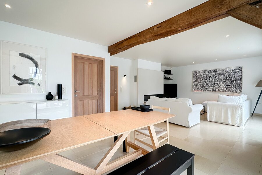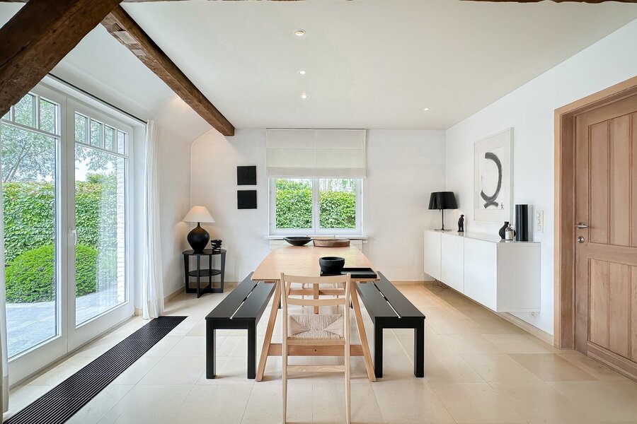 Samenstelling: Ruime inkomhal voorzien van een gastentoilet en vestiaire. De zonnige woonkamer leidt naar een bijzonder aangenaam en gezellig terras, ideaal om te ontspannen en te genieten van de groene omgeving. De eetkamer sluit naadloos aan op de afzonderlijke, ruime keuken, die praktisch is ingericht en voorzien van alle moderne comfort.