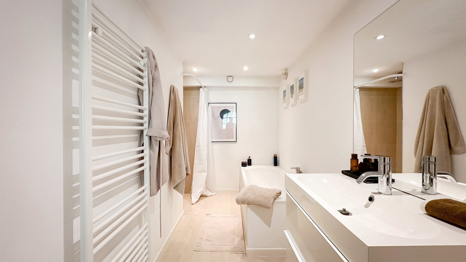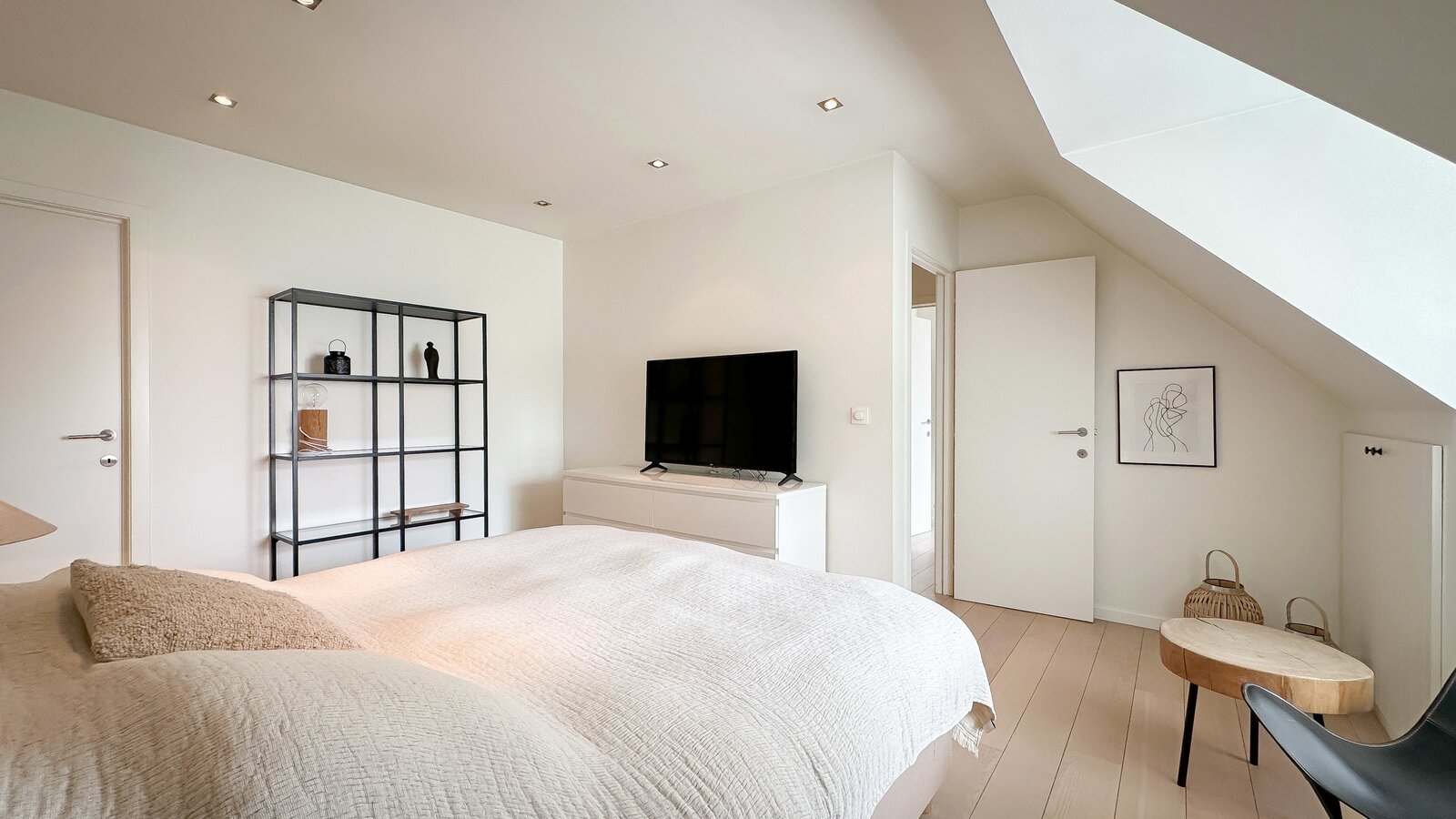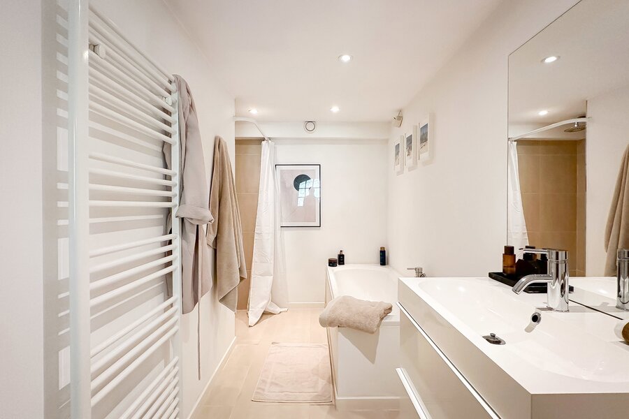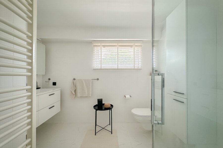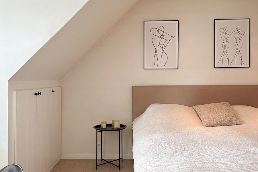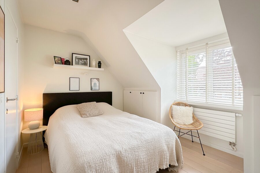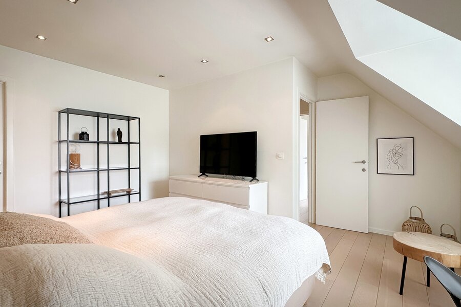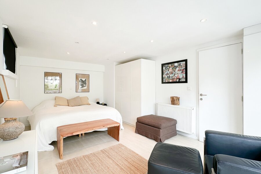 Op de begane grond bevindt zich tevens een royale slaapkamer die directe toegang biedt tot het terras, waardoor een harmonieuze verbinding met de buitenruimte ontstaat. Afzonderlijke, complete badkamer.