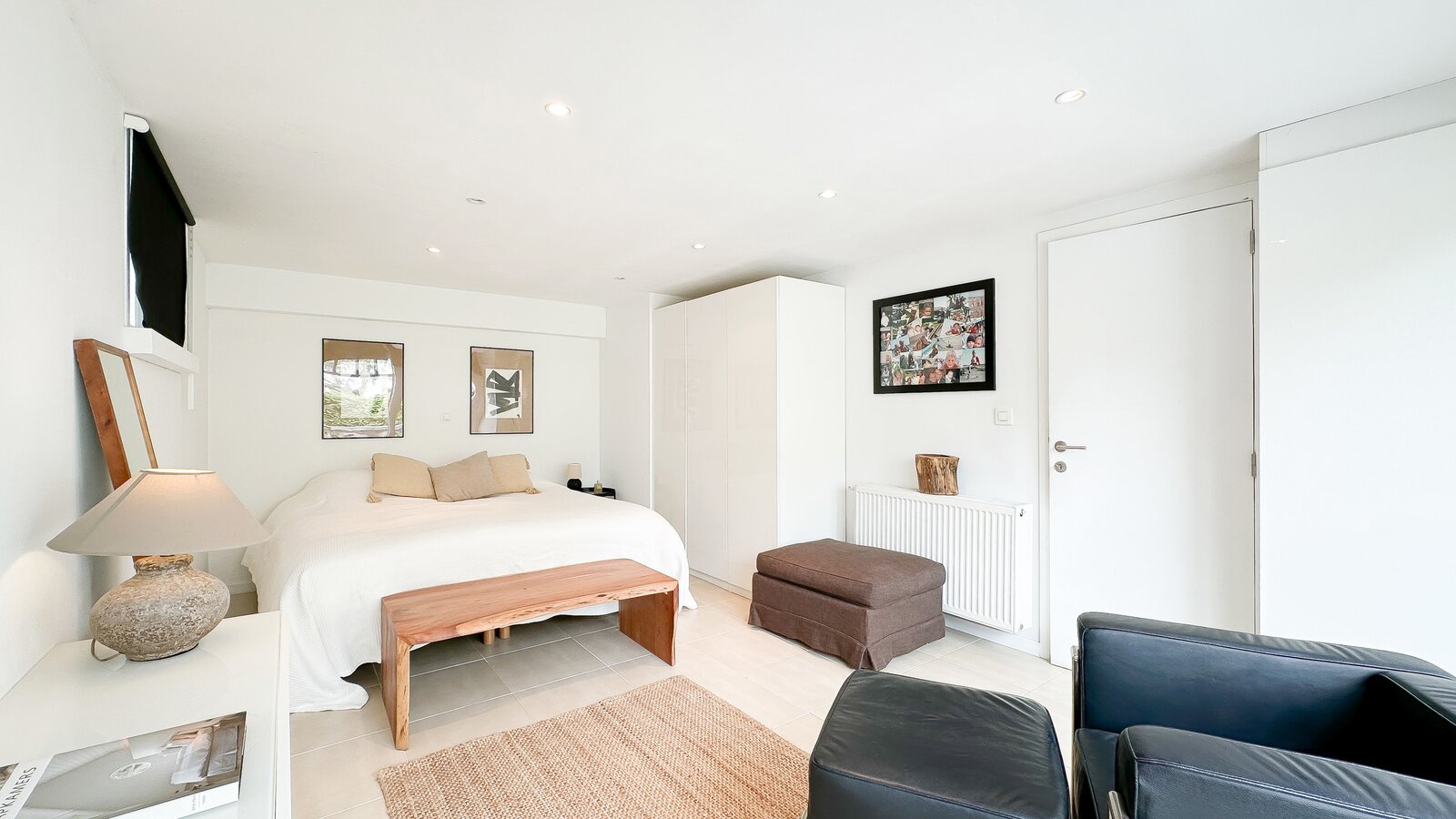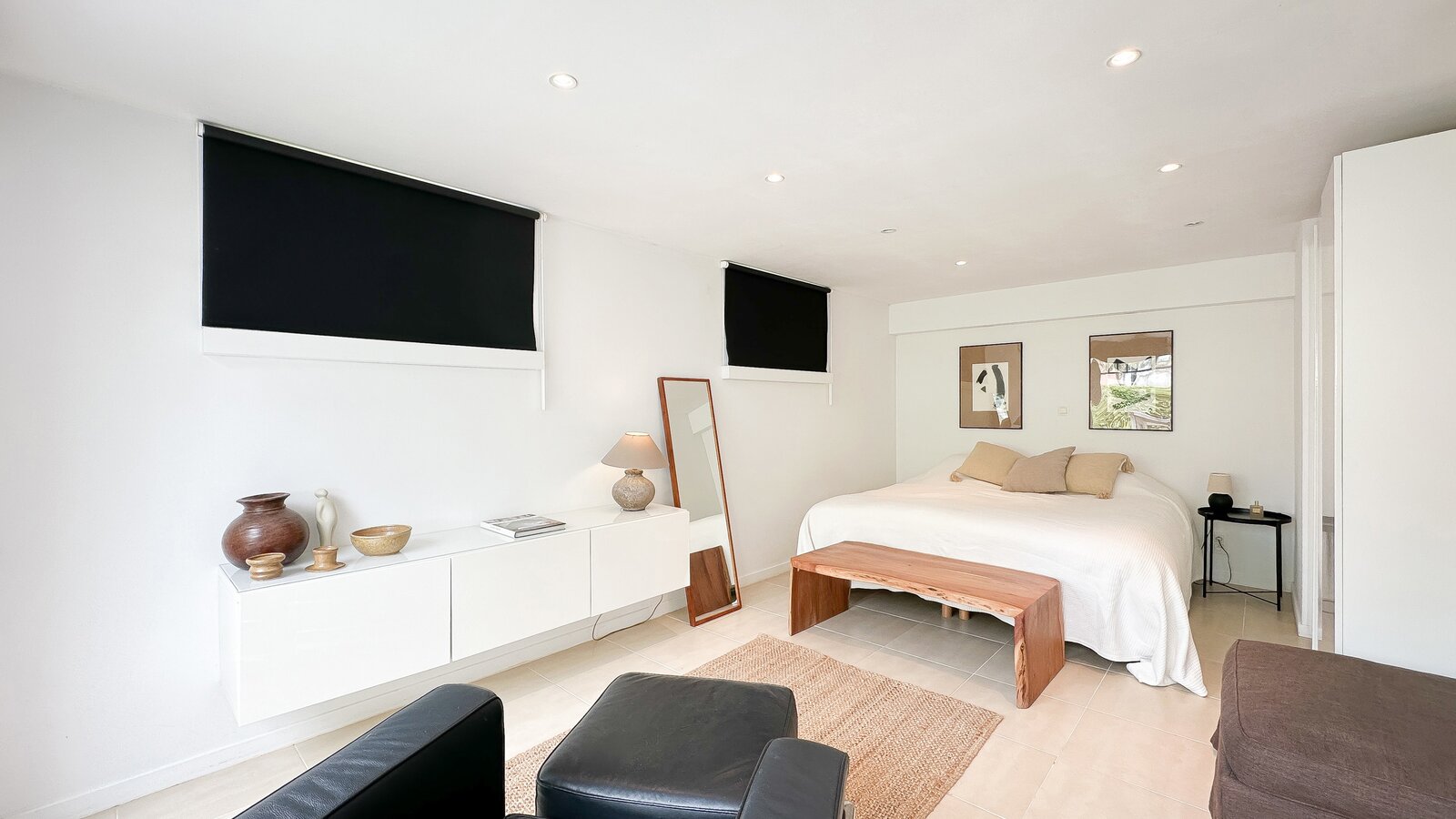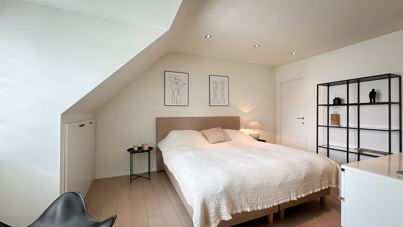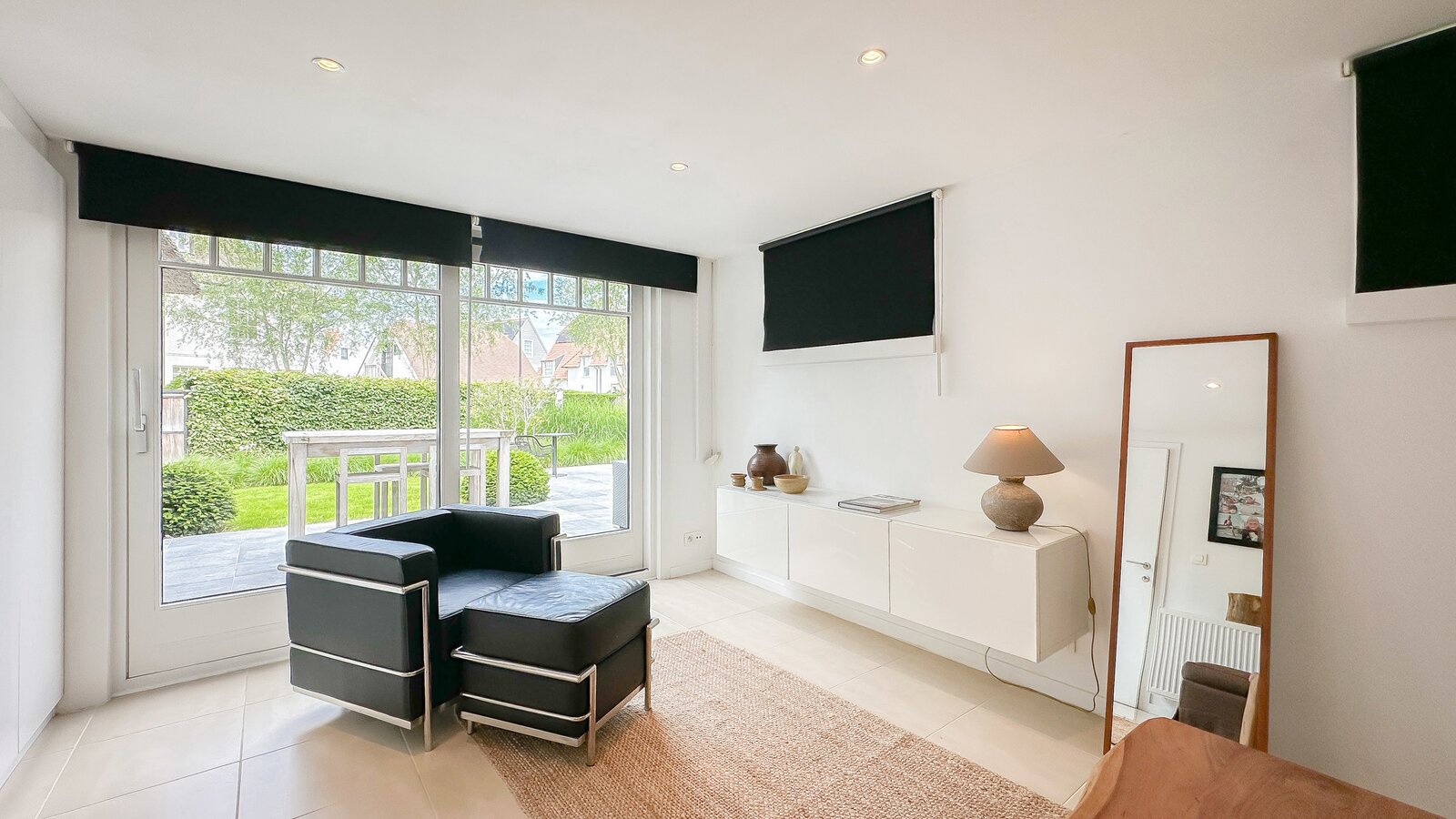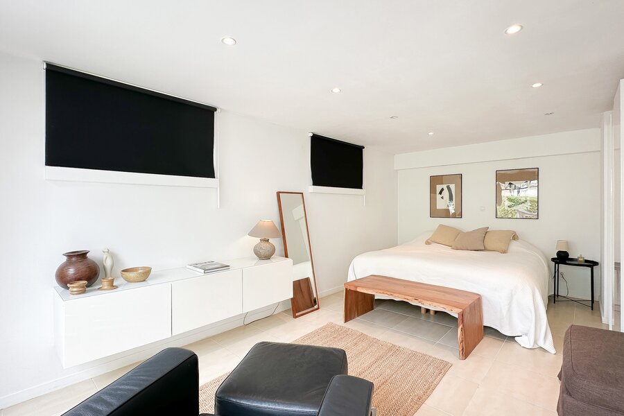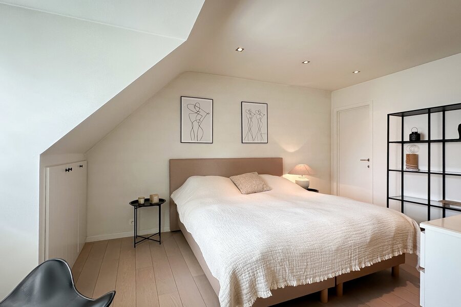 Op de begane grond bevindt zich tevens een royale slaapkamer die directe toegang biedt tot het terras, waardoor een harmonieuze verbinding met de buitenruimte ontstaat. Afzonderlijke, complete badkamer.