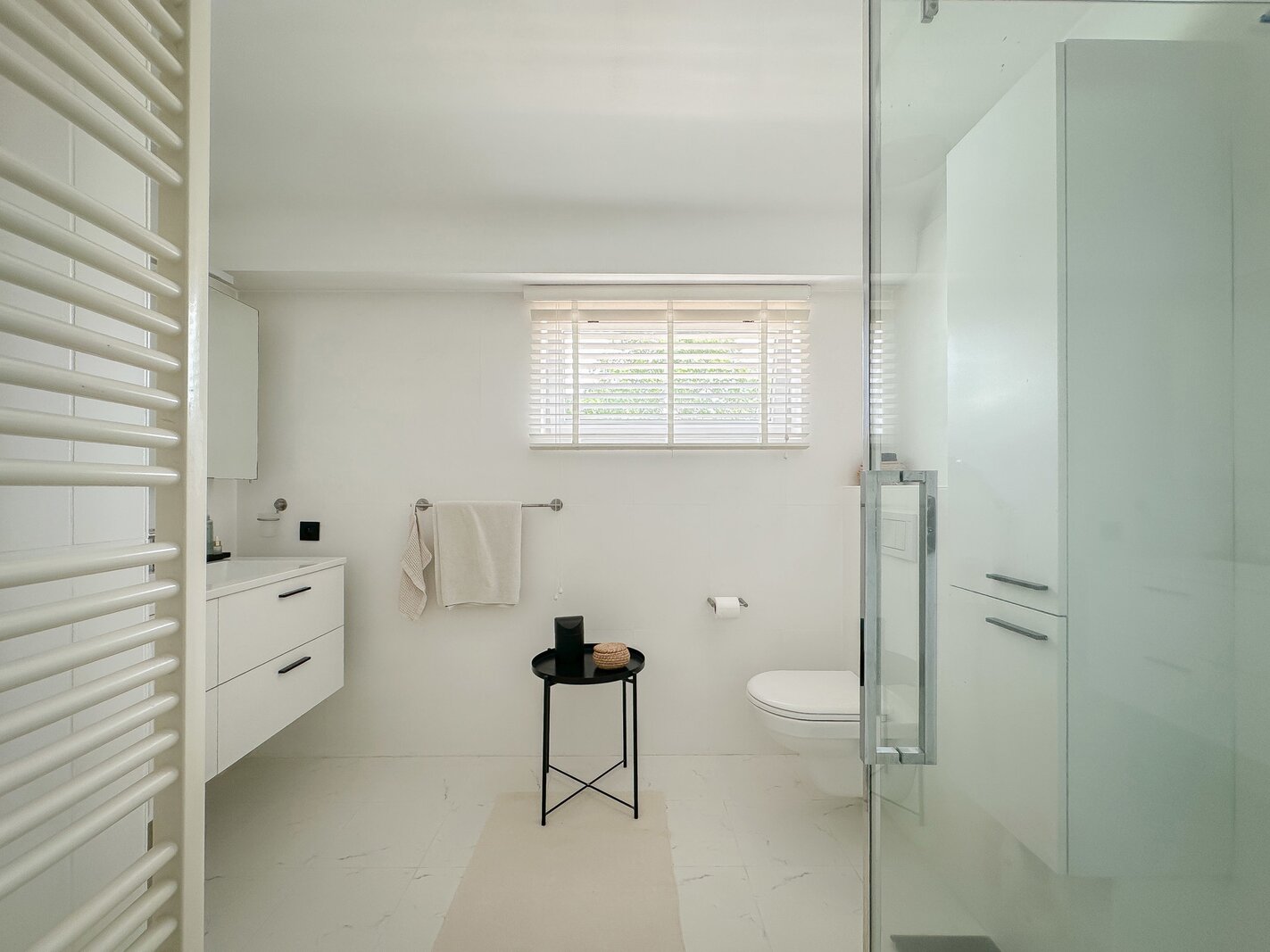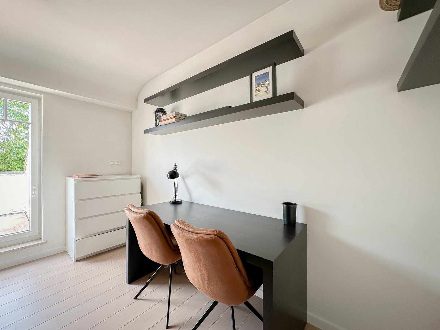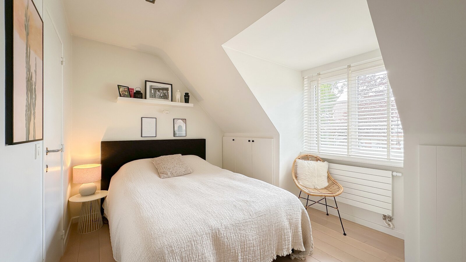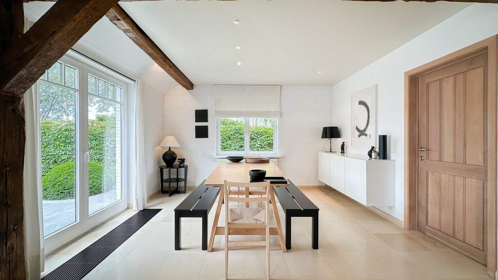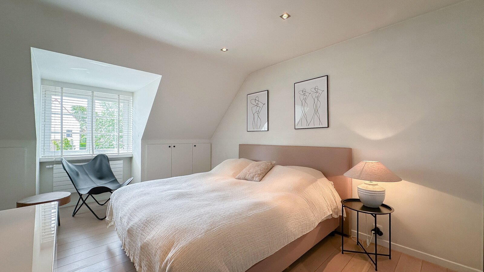 Op de begane grond bevindt zich tevens een royale slaapkamer die directe toegang biedt tot het terras, waardoor een harmonieuze verbinding met de buitenruimte ontstaat. Afzonderlijke, complete badkamer.