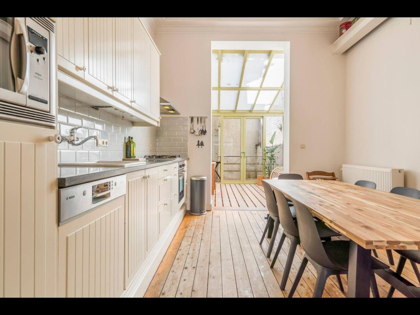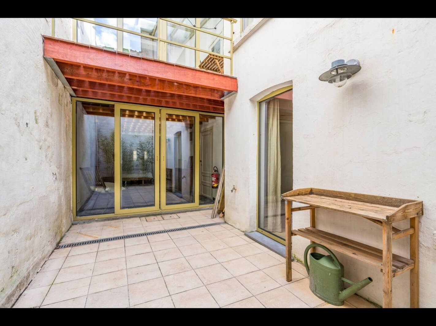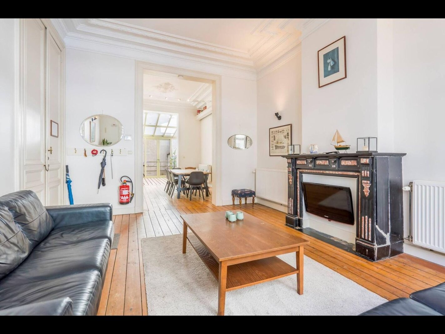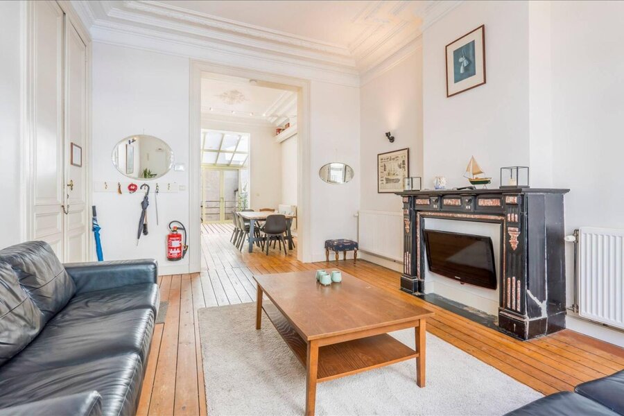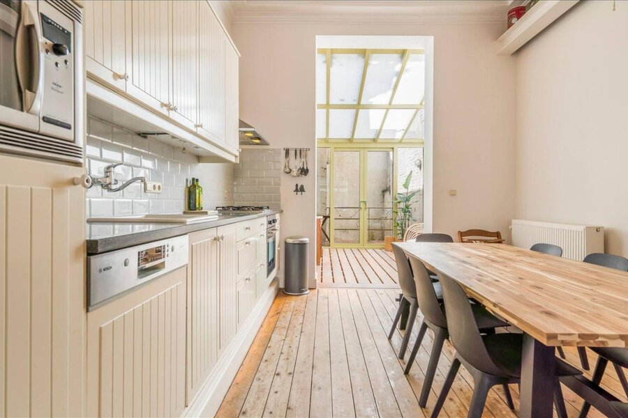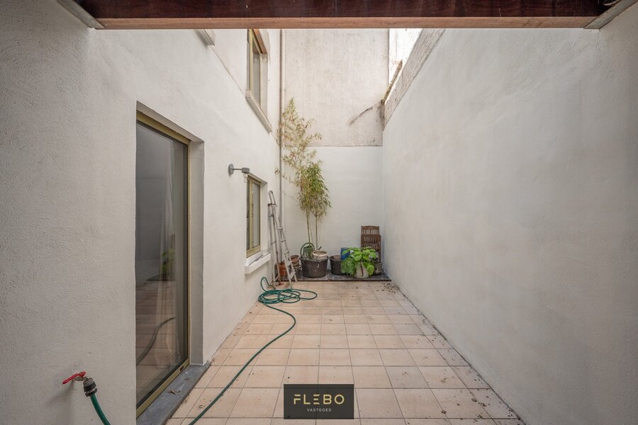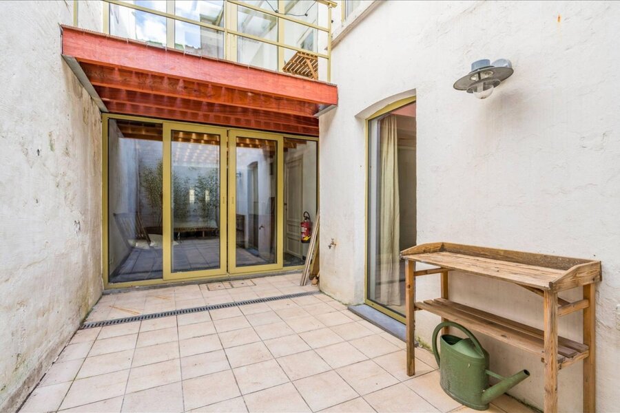 We betreden het appartement via een royale inkomhal op het gelijkvloers. Enkele treden brengen je naar de open leefruimte met hoge plafonds. Aansluitend bevindt zich de volledig uitgeruste keuken met een ruime en lichtrijke eetplaats. Via het grote schuifraam heb je toegang tot het terras met uitzicht op de koer. Op ditzelfde niveau bevinden zich ook een eerste ruime slaapkamer, een badkamer met ligbad en lavabo, en een apart toilet.