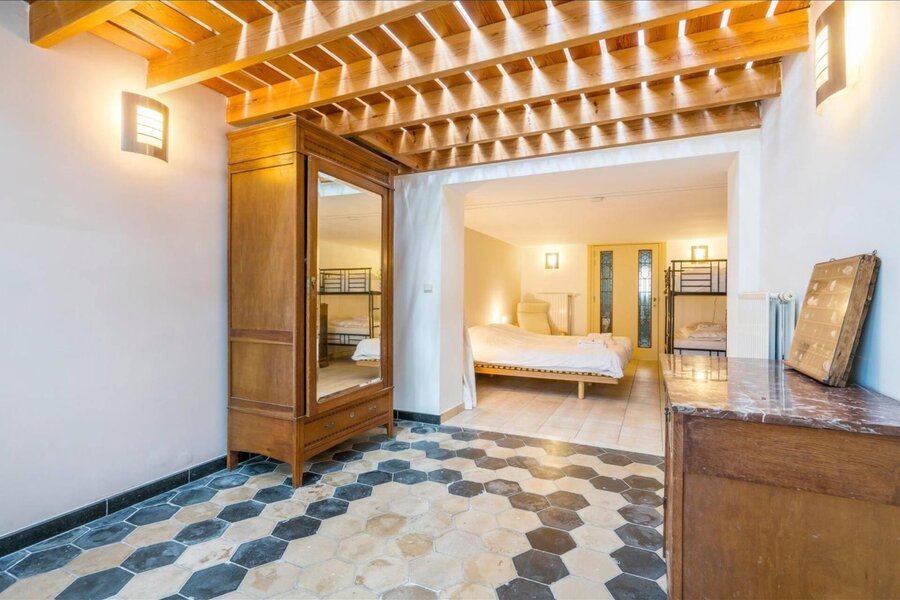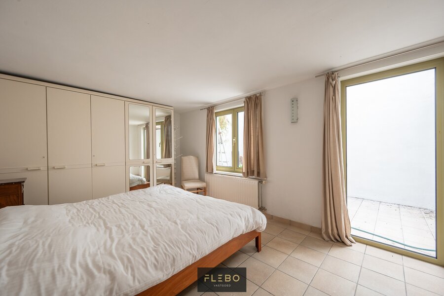 Via de trap bereik je het lager gelegen verdiep, dat zich op hetzelfde niveau bevindt als de buitenkoer. Hier vind je nog twee zeer ruime slaapkamers, een aparte badkamer met douche en lavabo, en een extra apart toilet. Daarnaast is er op dit niveau een grote polyvalente ruimte, perfect geschikt als fietsenberging, opbergruimte of hobbyruimte.