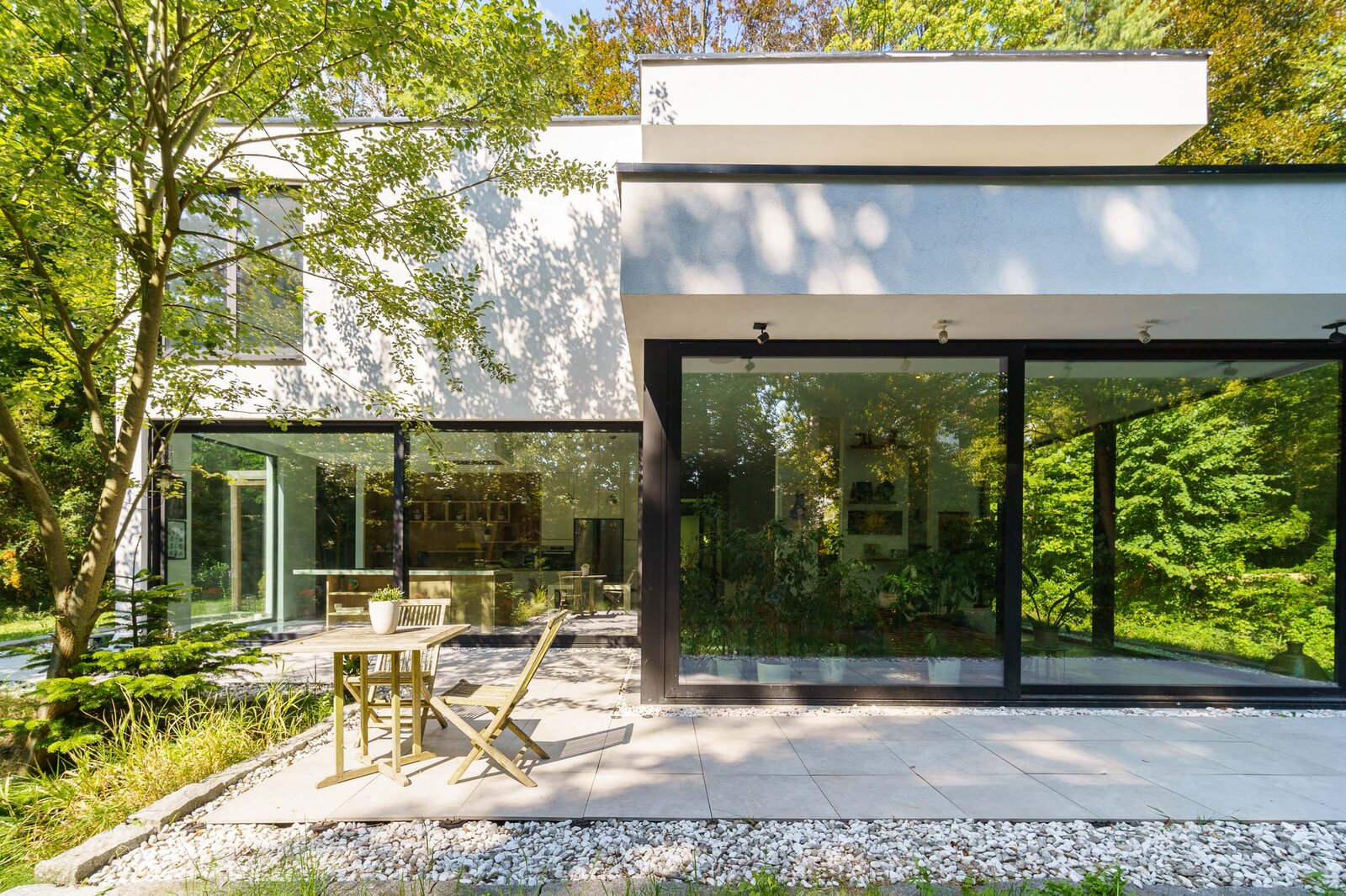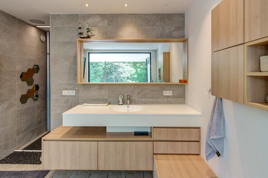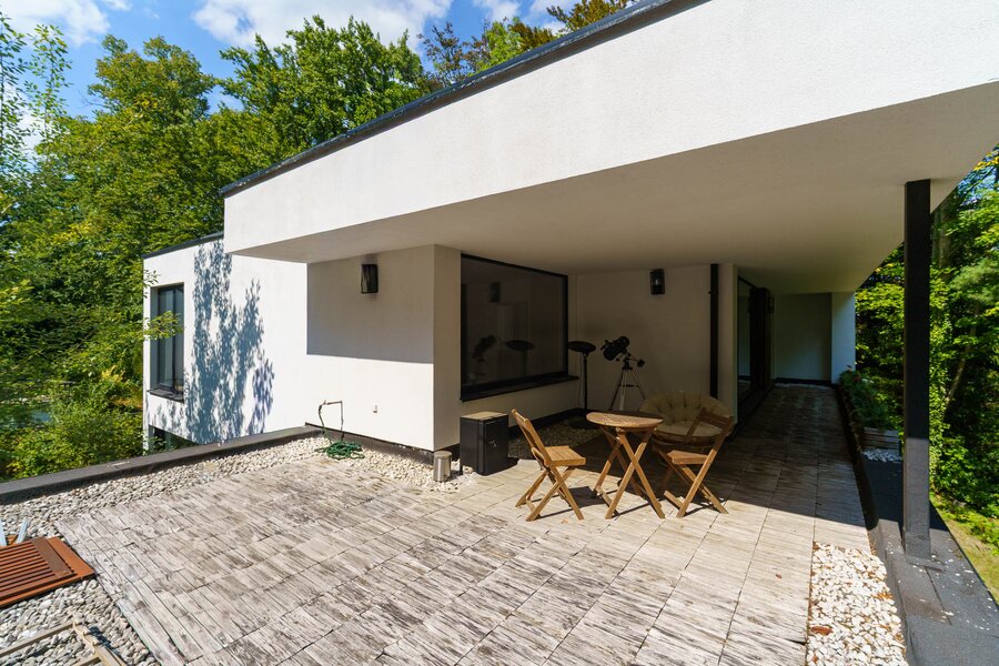 De tuin is een oase van rust met een vijver, drie loungeplekken, groot terras, tuinhuis en twee overdekte staanplaatsen. Dankzij zonnepanelen, geothermische warmtepomp, driedubbele beglazing en topisolatie behaalt deze villa een BEN-score (EPC E6).