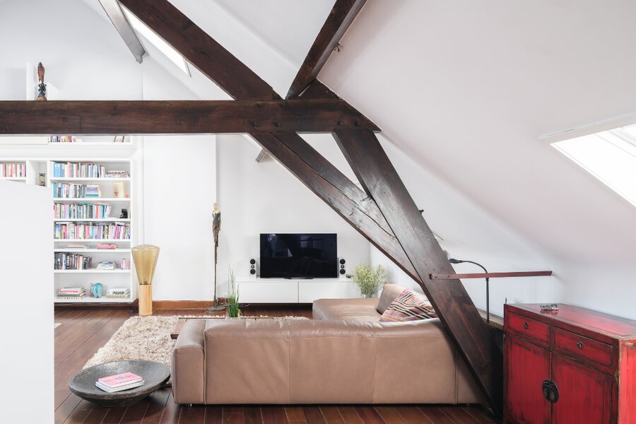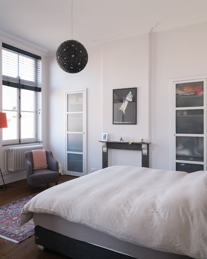 Hoge plafonds, originele plankenvloeren en houten ramen geven dit appartement een bijzondere charme en uitstraling.